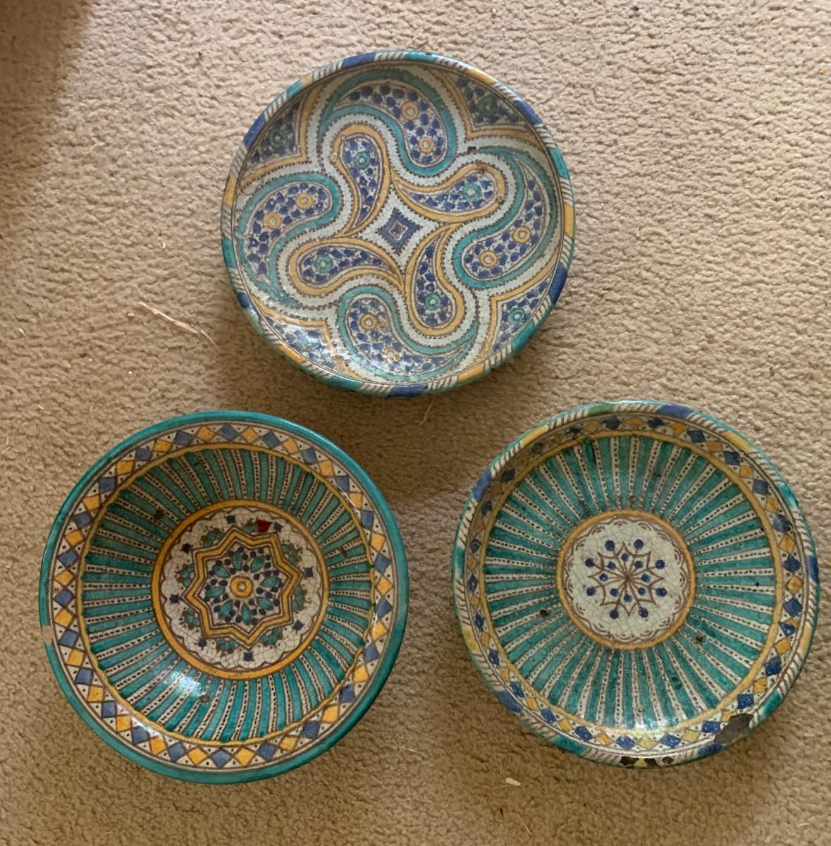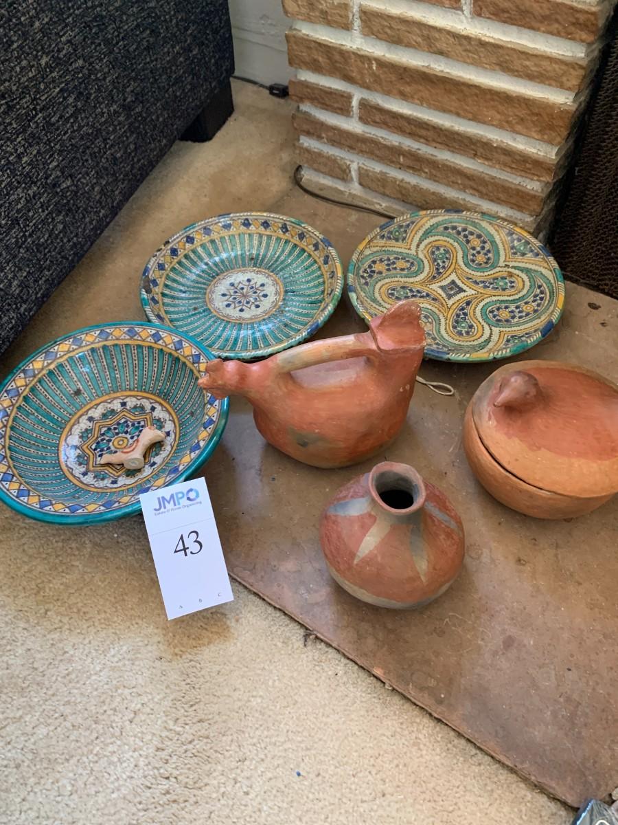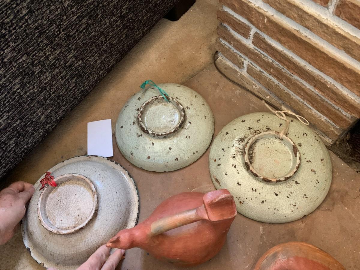 6 pieces. 3 plates with crazing, chips. 3 vessels: lidded bowl, vase, carafe with lid. Small bird figure included.