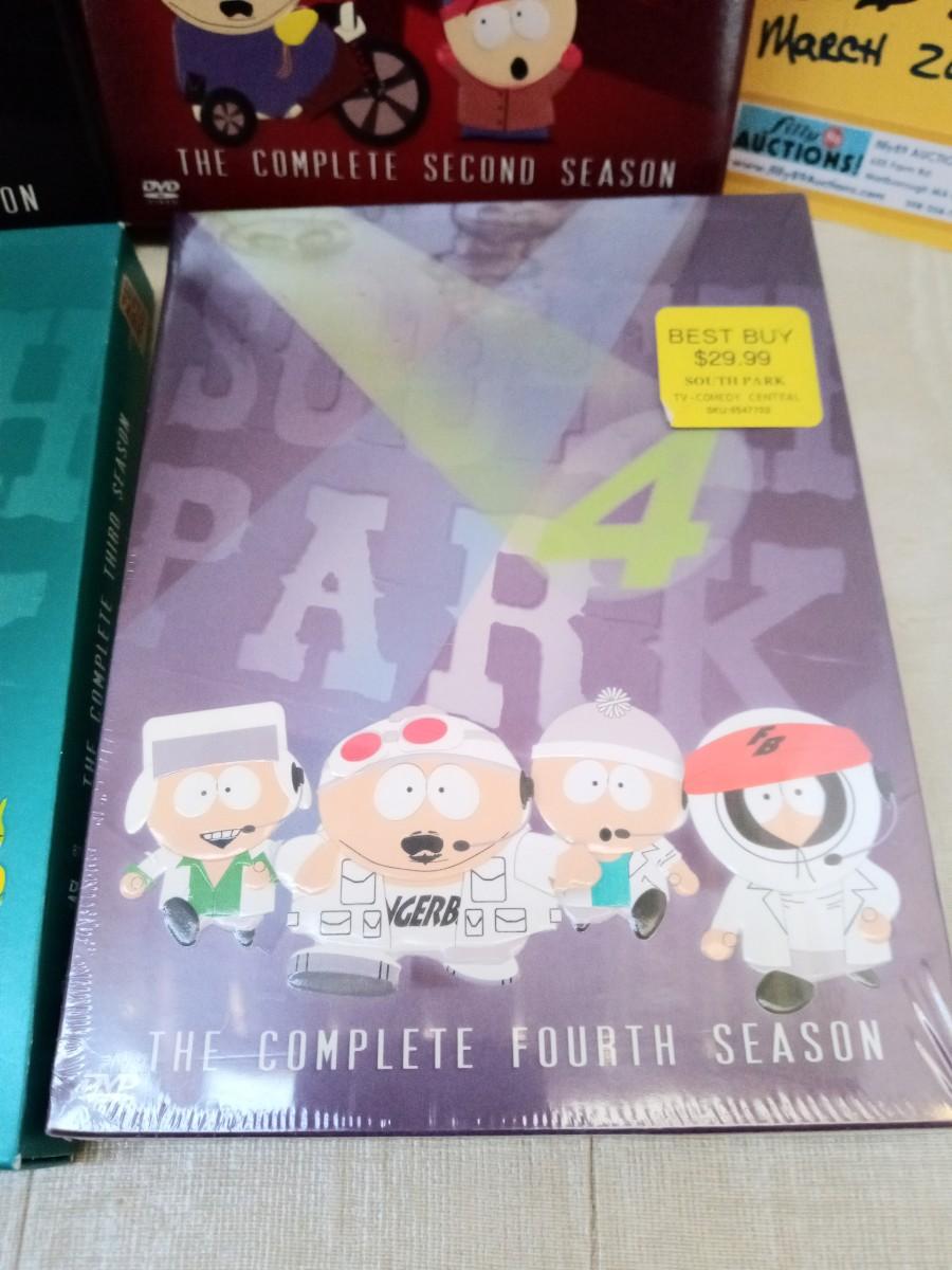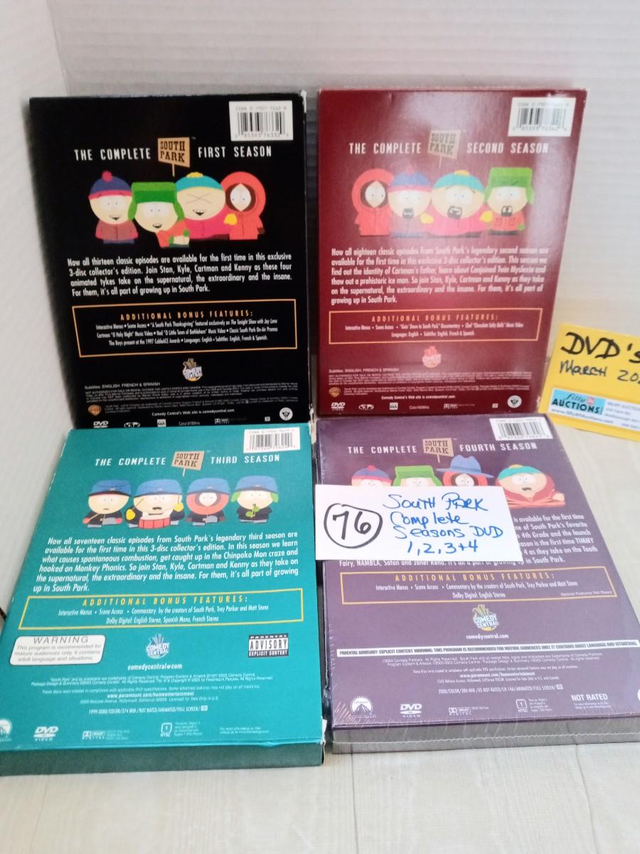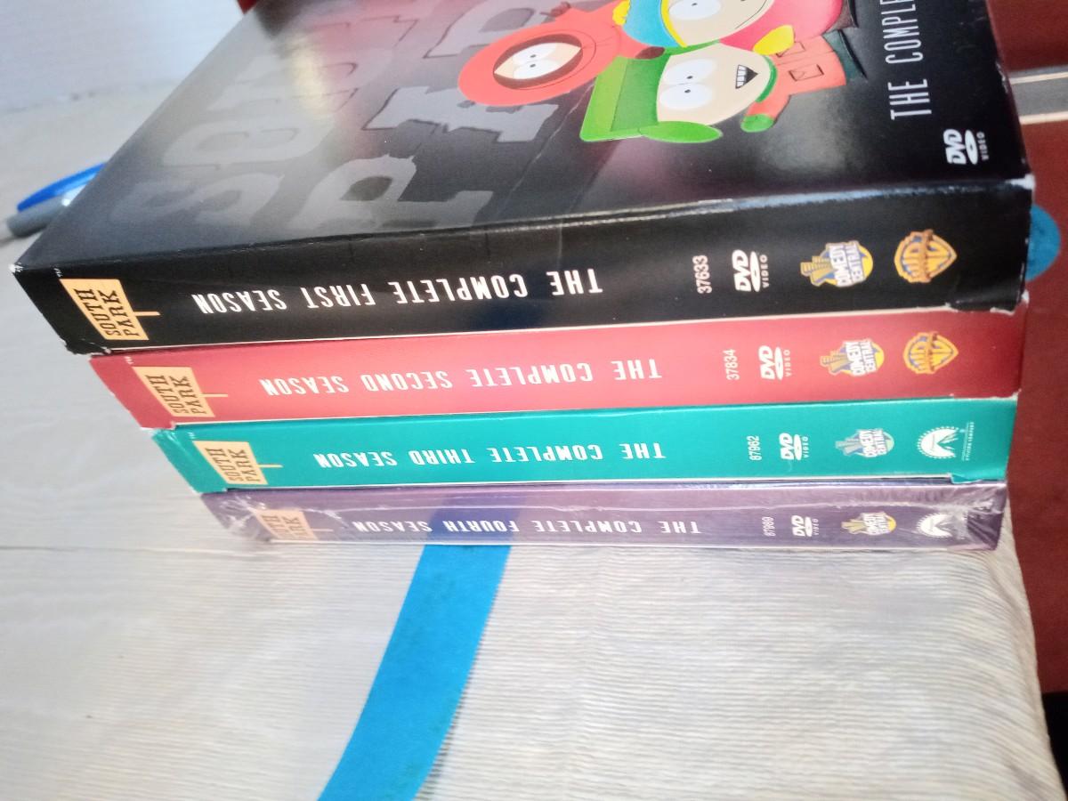 South Park TV Series with Complete DVD Box sets for Seasons First, Second, Third & Fourth. Note: 4-th Season is SEALED. Very Good Condition. See PHOTOS.