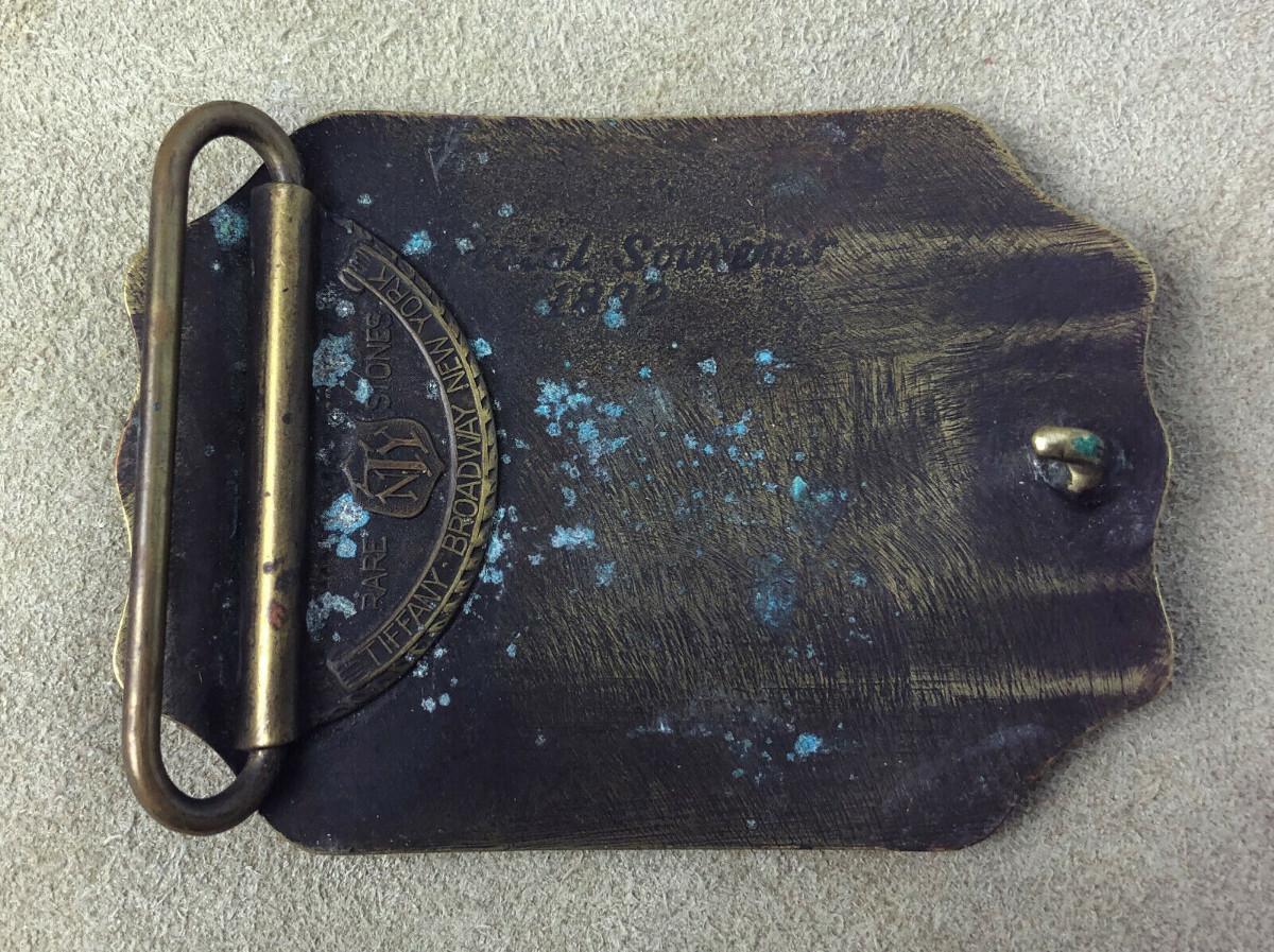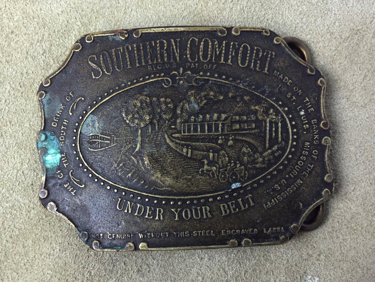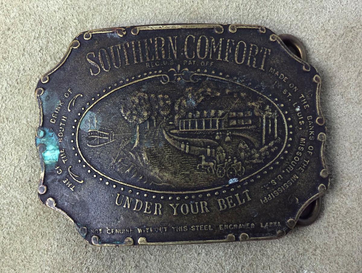 Here is a western-style solid brass Southern Comfort 'Under Your Belt' belt buckle...Tiffany 1892 markings on back of this vintage reproduction...3 3/4" by 2 3/4"..Accepts a large belt up to 2 1/4" wide...Some verdigris..Nice patina...Offered with no reserve...