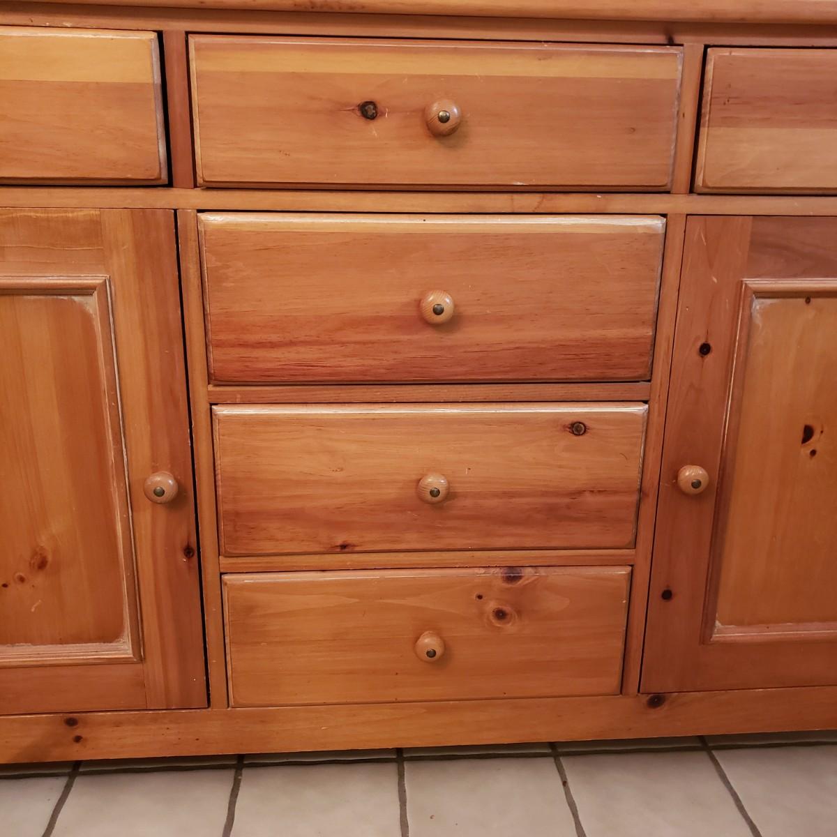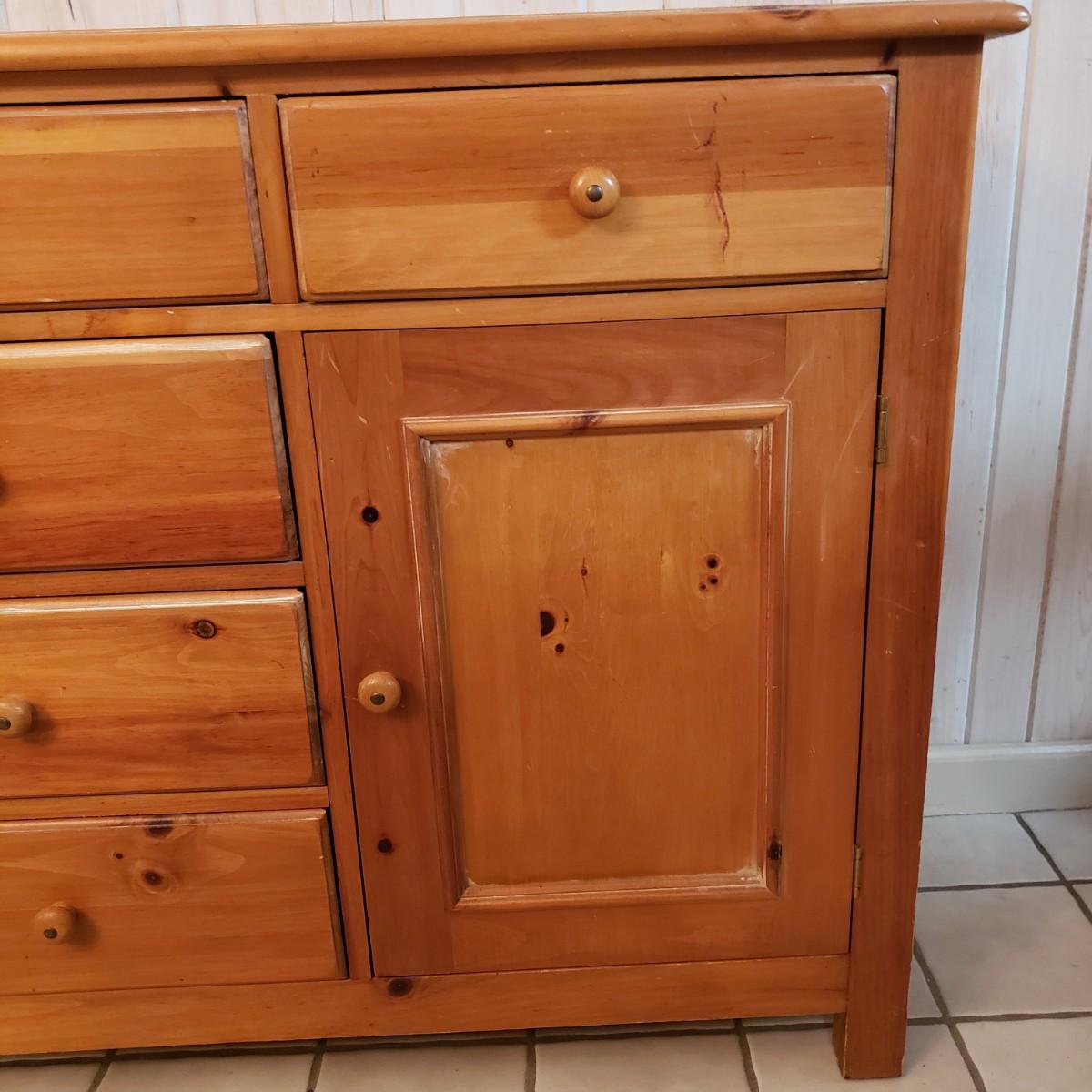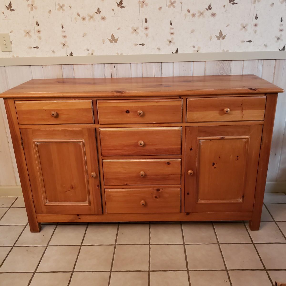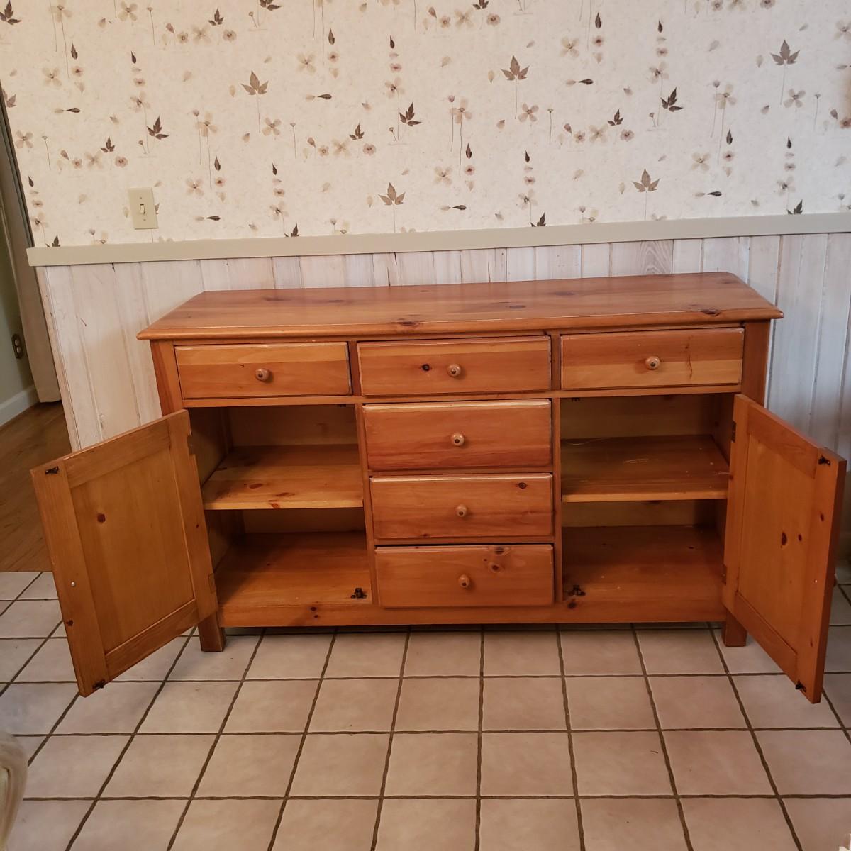 This is a Southern Furniture solid wood buffet from Elizabethtown, North Carolina. The buffet has six drawers and two cabinets. This piece measures 18" x 60" x 36"H. There are some scratches on the top and drawers, see pictures.