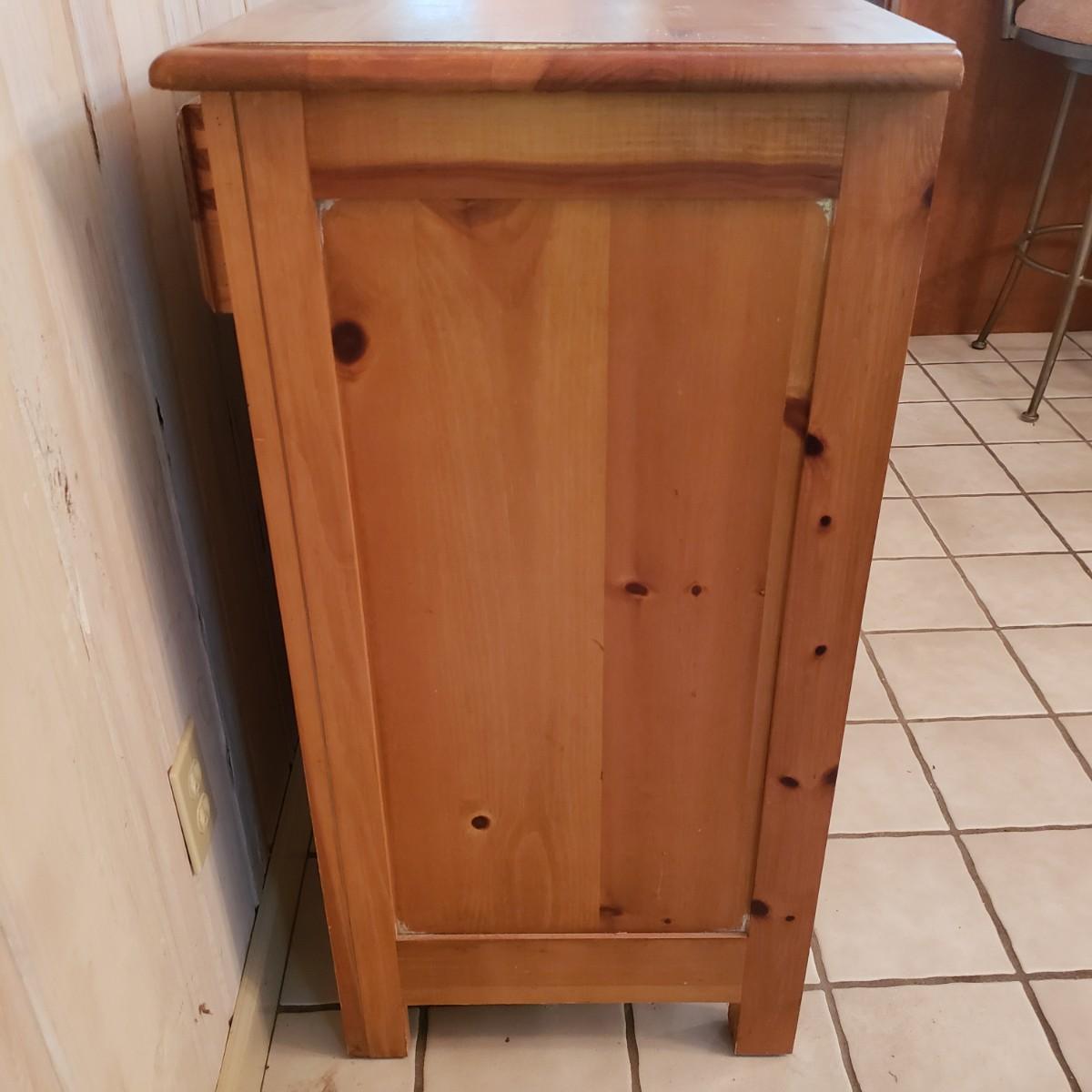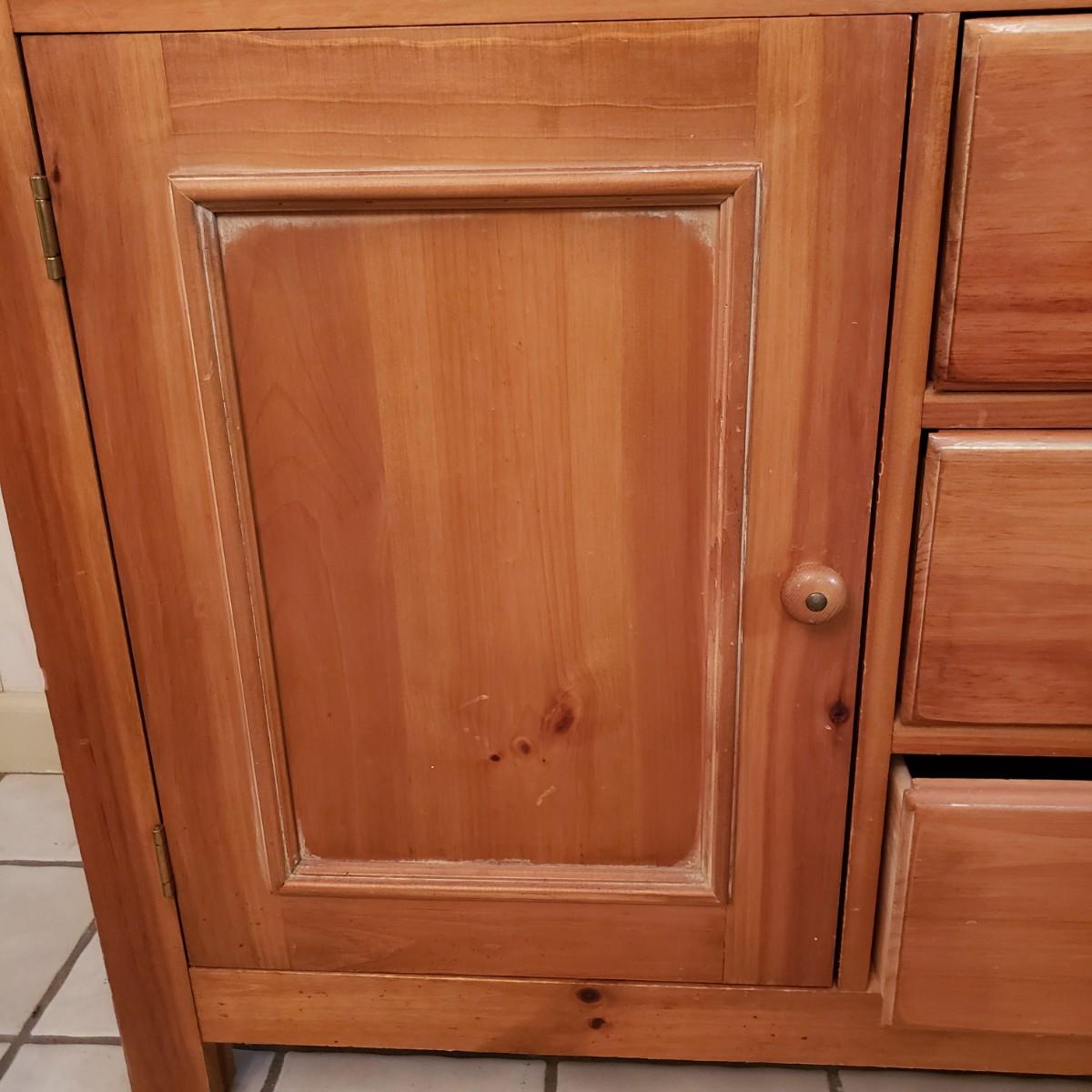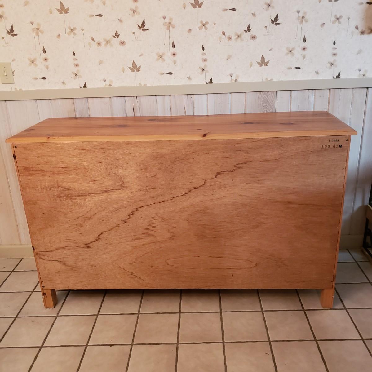 This is a Southern Furniture solid wood buffet from Elizabethtown, North Carolina. The buffet has six drawers and two cabinets. This piece measures 18" x 60" x 36"H. There are some scratches on the top and drawers, see pictures.