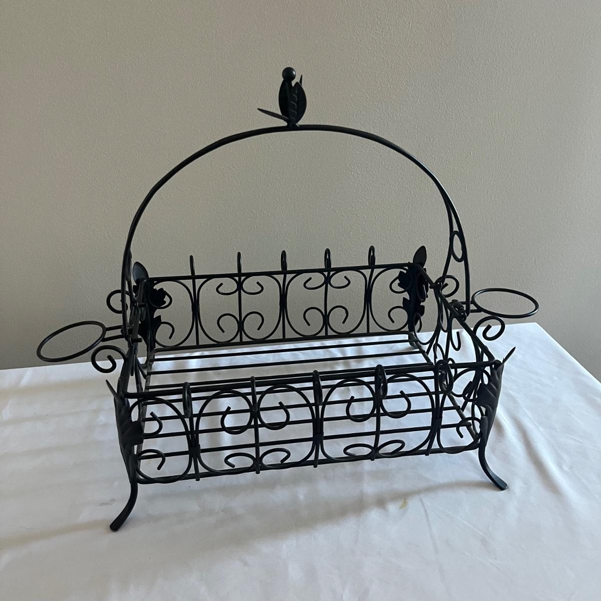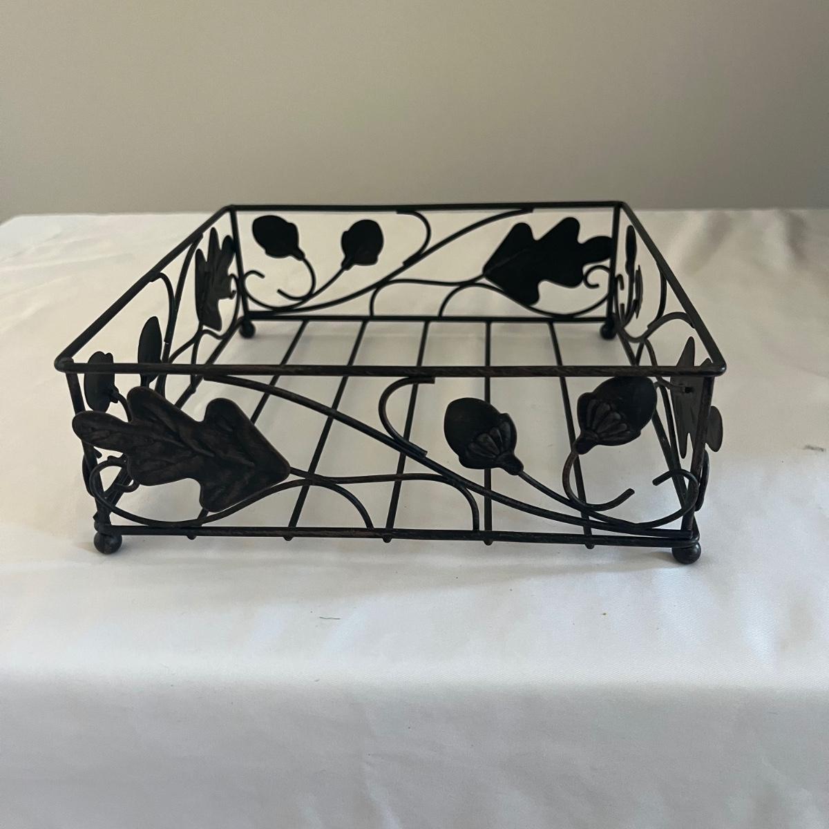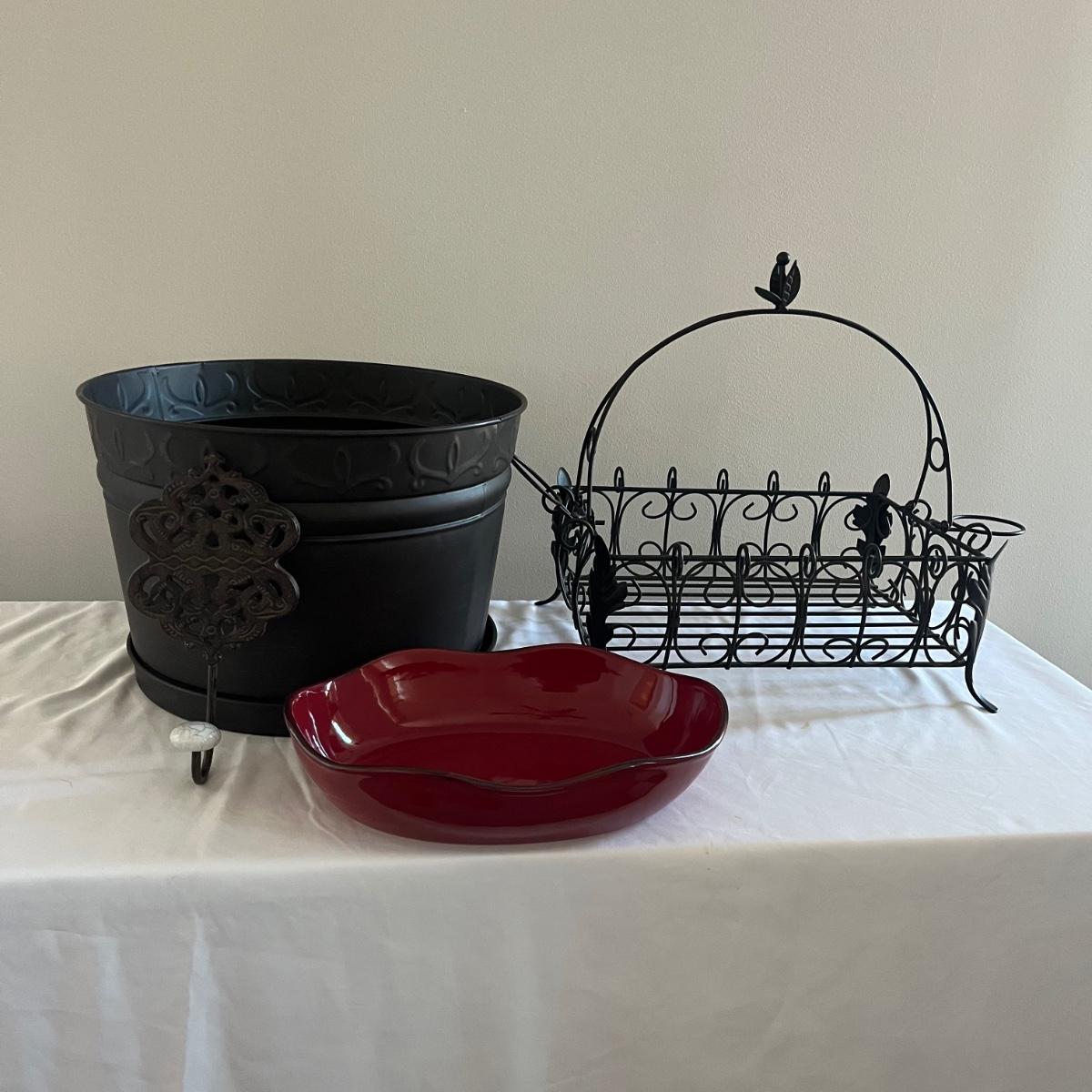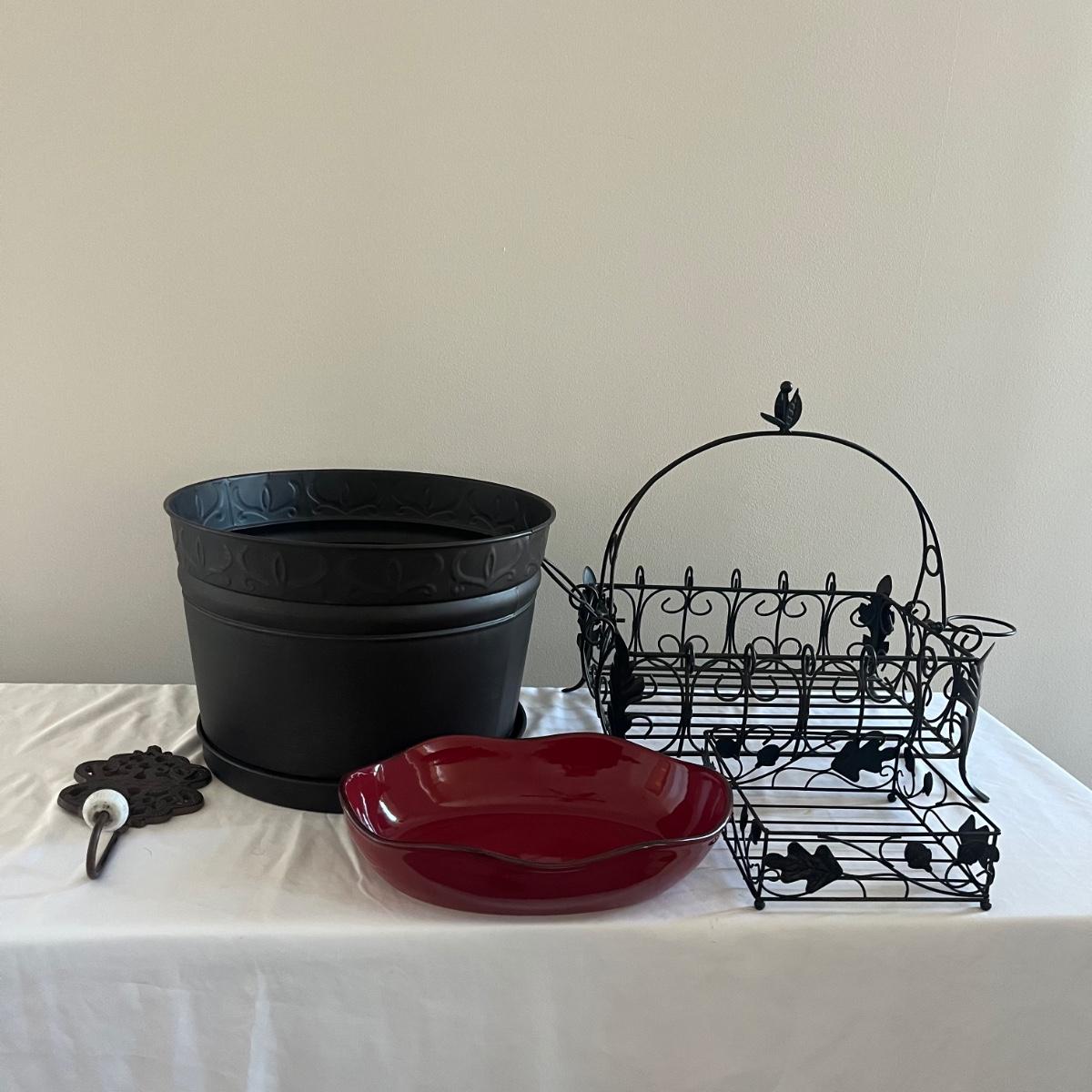 Lot includes a Southern Living at Home ceramic red dish, two piece metal ice bucket or planter, and a cast iron wall hook. Also included is a metal basket with handle and metal napkin holder. Metal plant pot measures 13.5”D x 9.5” tall. Metal items all appear to be brown.