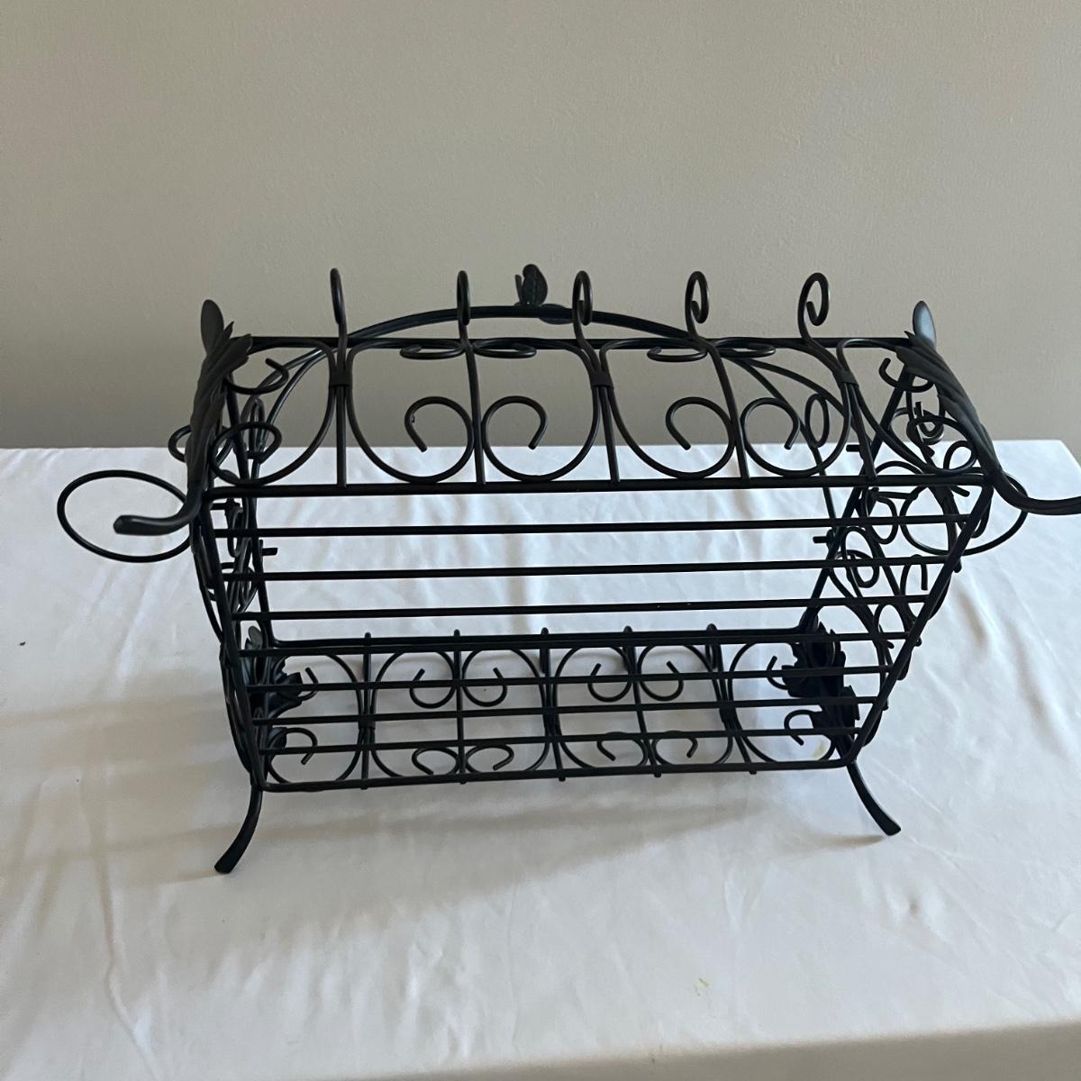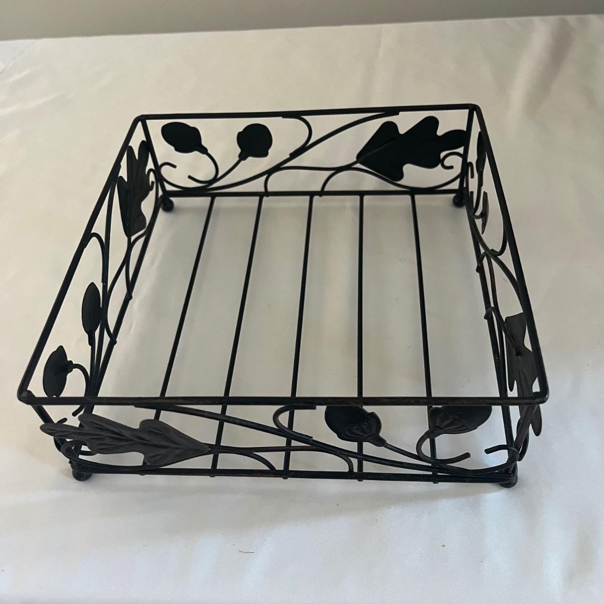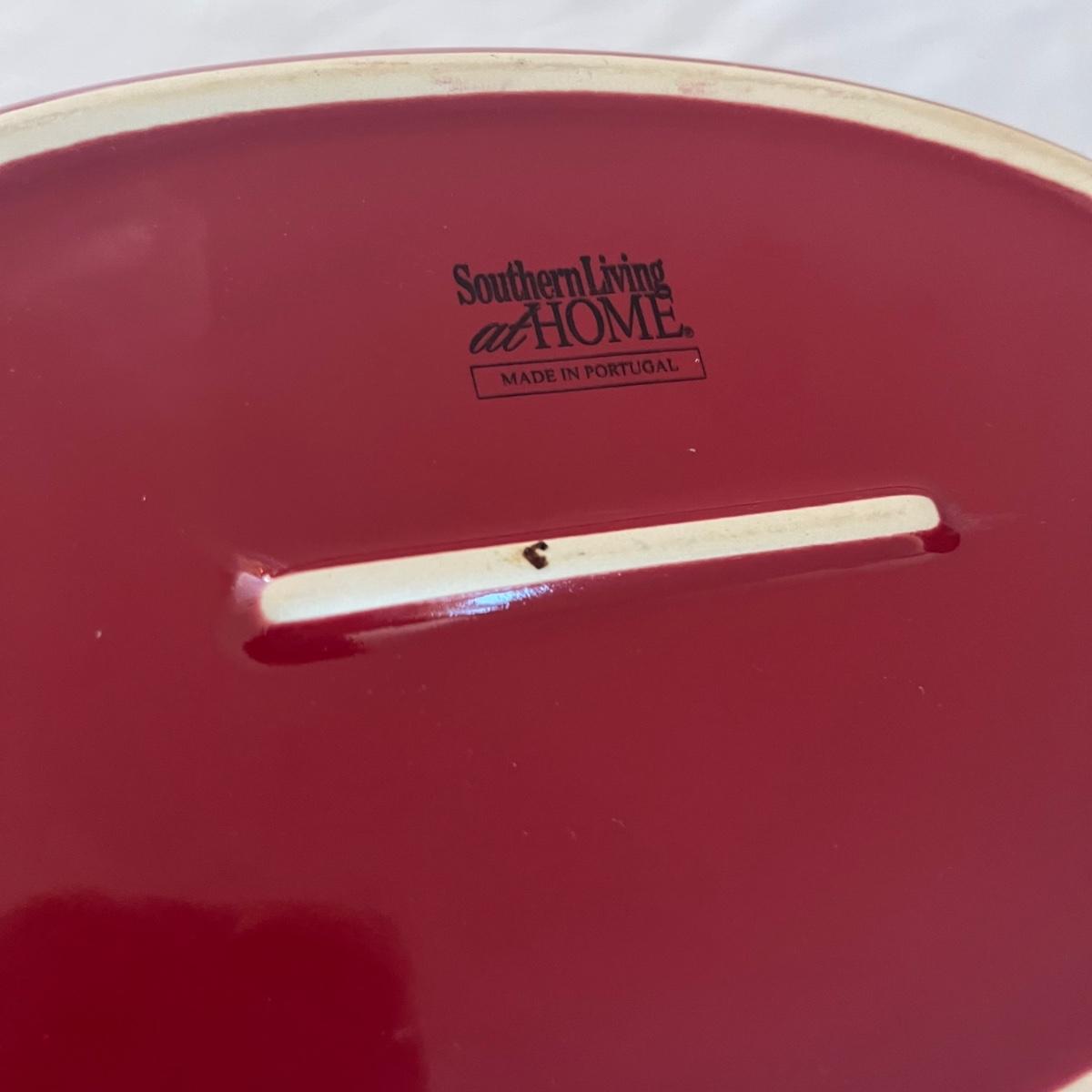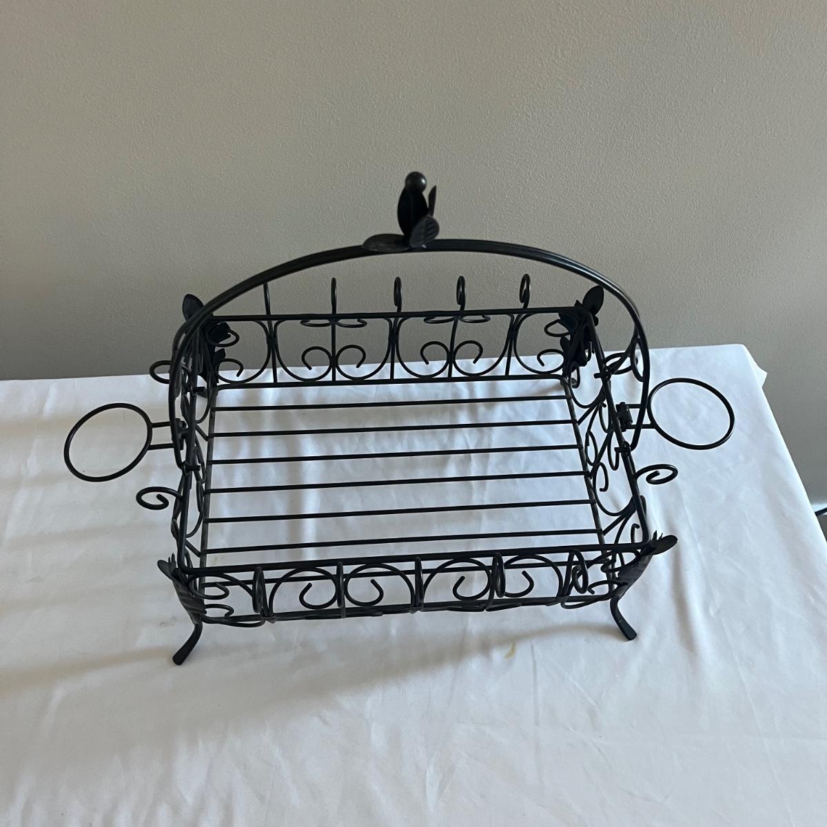 Lot includes a Southern Living at Home ceramic red dish, two piece metal ice bucket or planter, and a cast iron wall hook. Also included is a metal basket with handle and metal napkin holder. Metal plant pot measures 13.5”D x 9.5” tall. Metal items all appear to be brown.