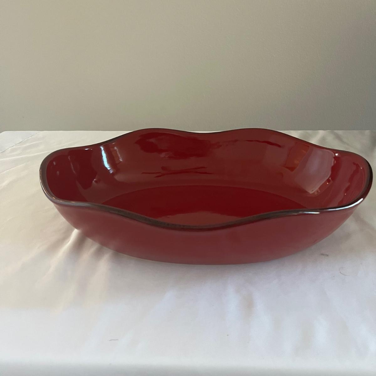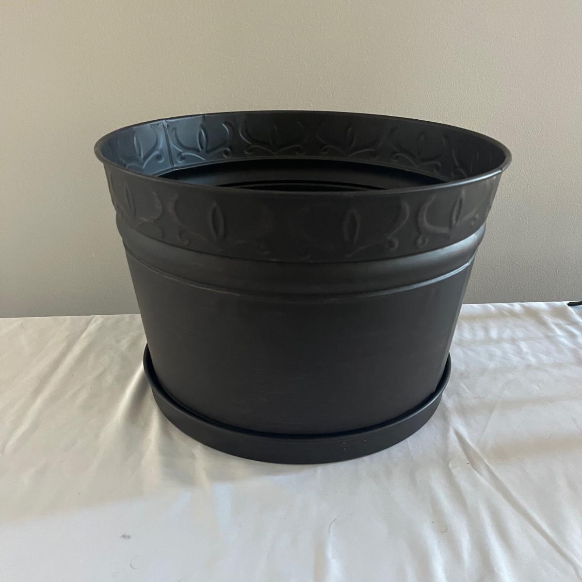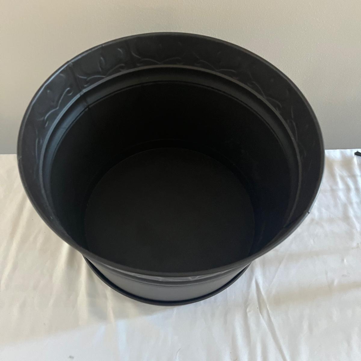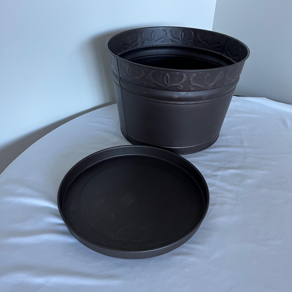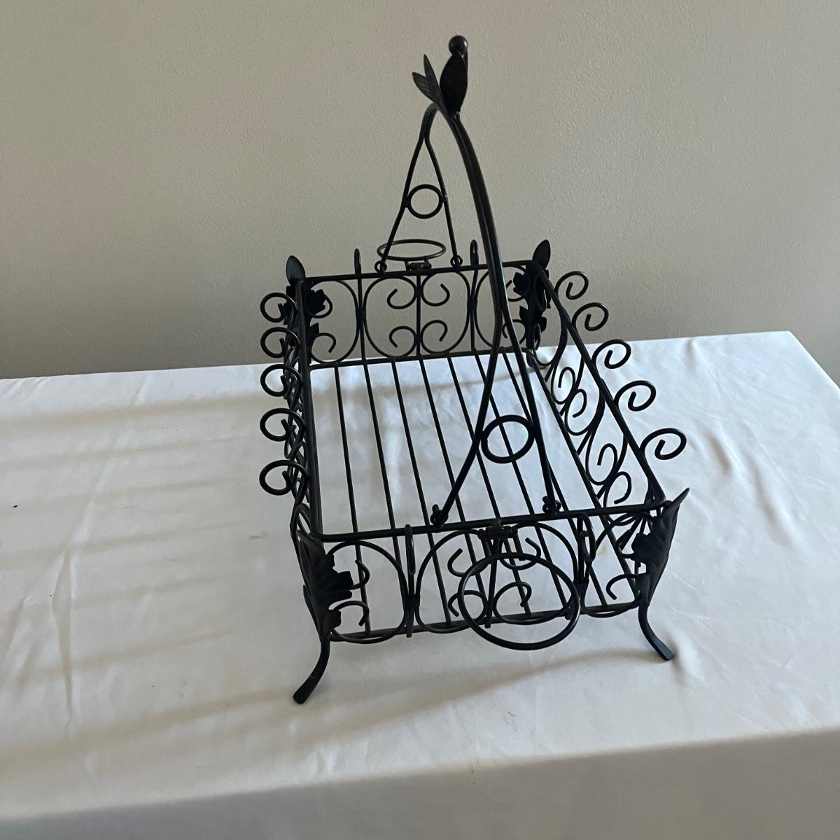 Lot includes a Southern Living at Home ceramic red dish, two piece metal ice bucket or planter, and a cast iron wall hook. Also included is a metal basket with handle and metal napkin holder. Metal plant pot measures 13.5”D x 9.5” tall. Metal items all appear to be brown.