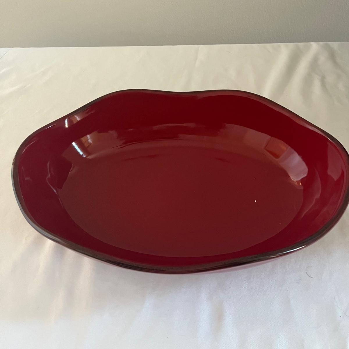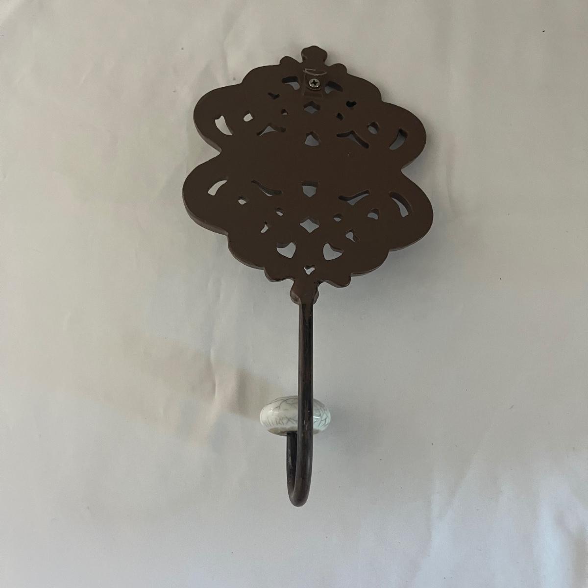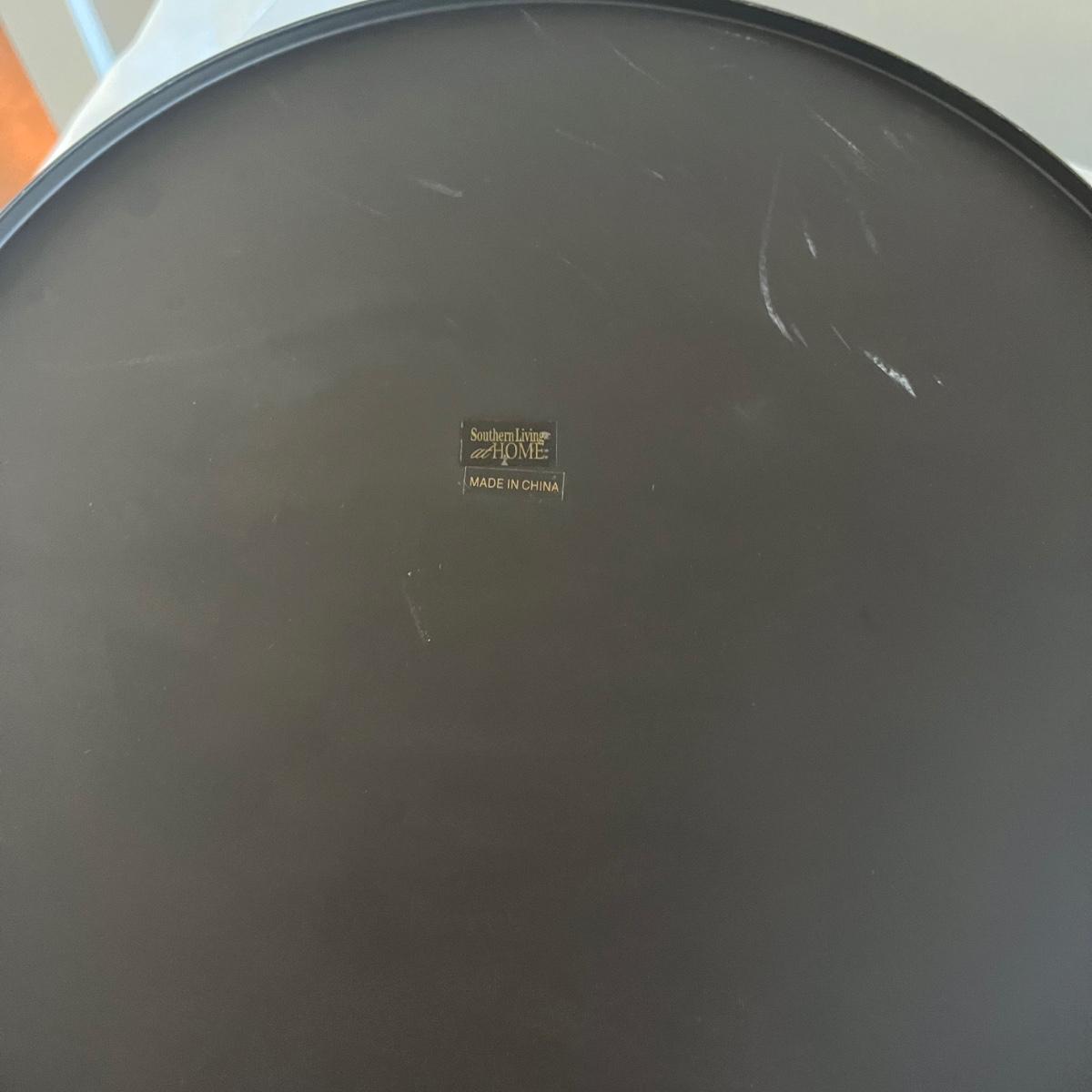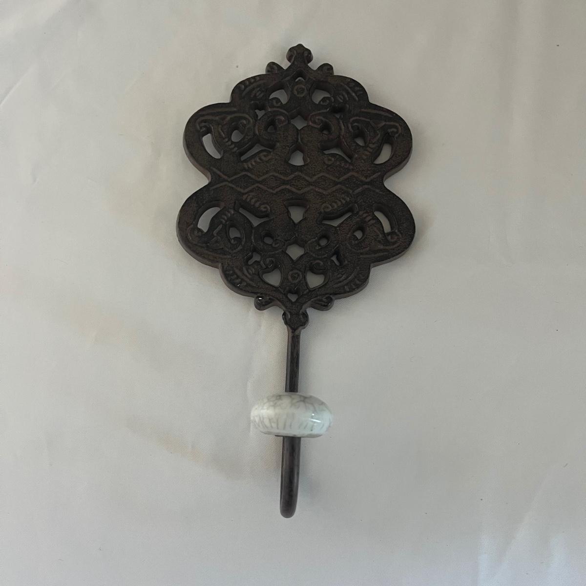 Lot includes a Southern Living at Home ceramic red dish, two piece metal ice bucket or planter, and a cast iron wall hook. Also included is a metal basket with handle and metal napkin holder. Metal plant pot measures 13.5”D x 9.5” tall. Metal items all appear to be brown.