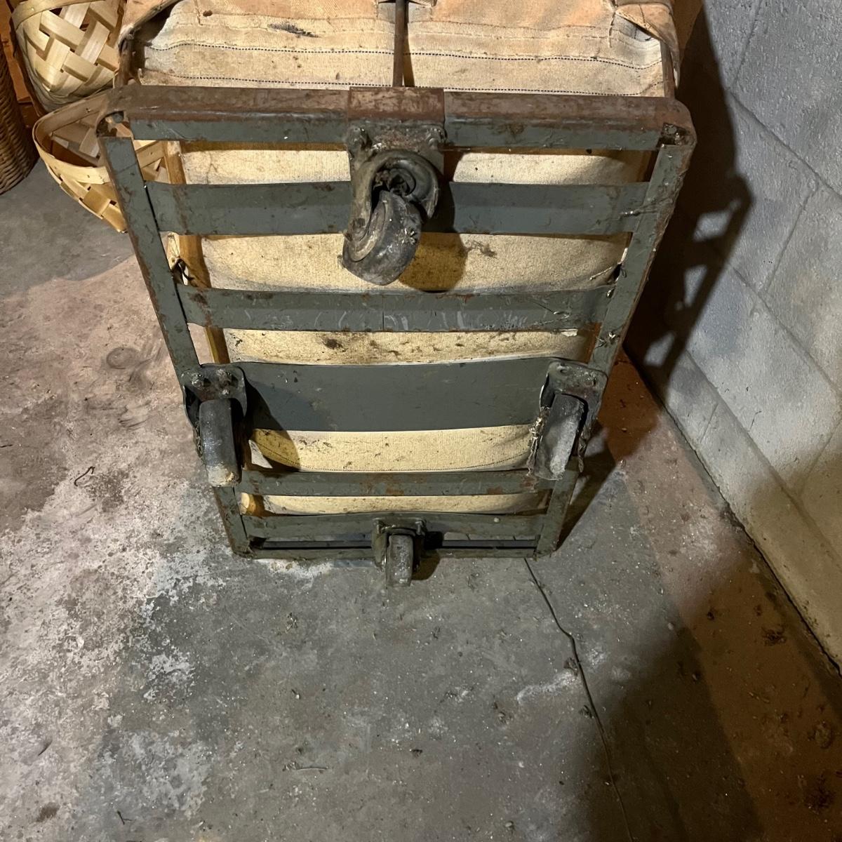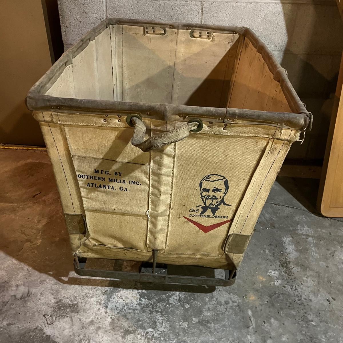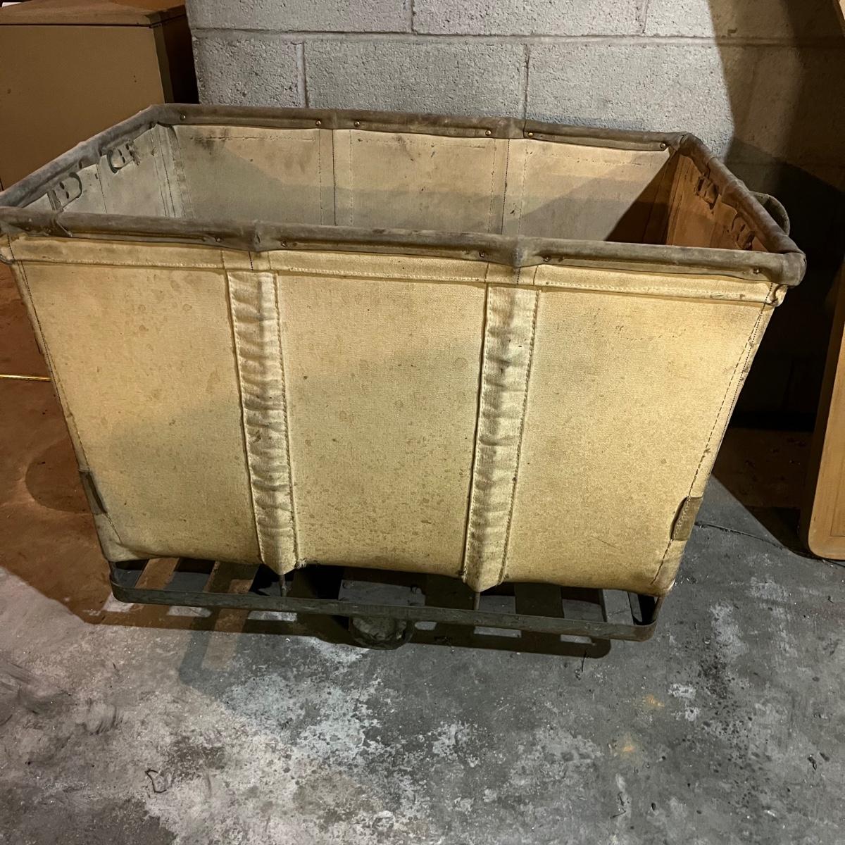 Lot includes a heavy duty Southern Mills metal and canvas laundry cart. Cart is dirty and middle wheels are bent, but it still rolls easy. Cart measures 23” x 35” x 27”.