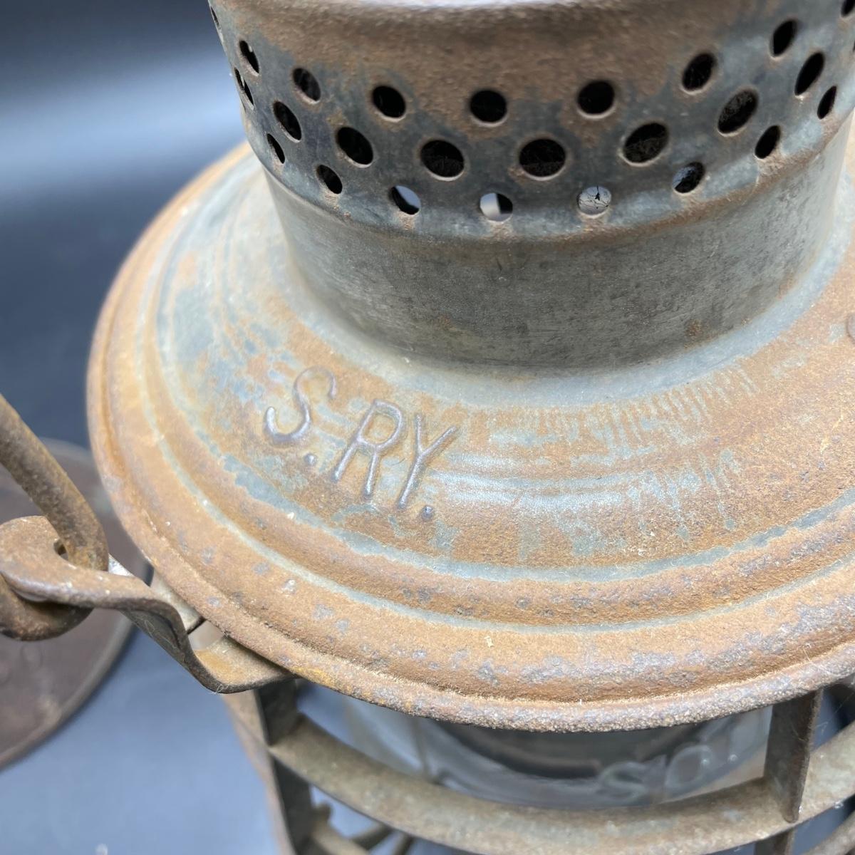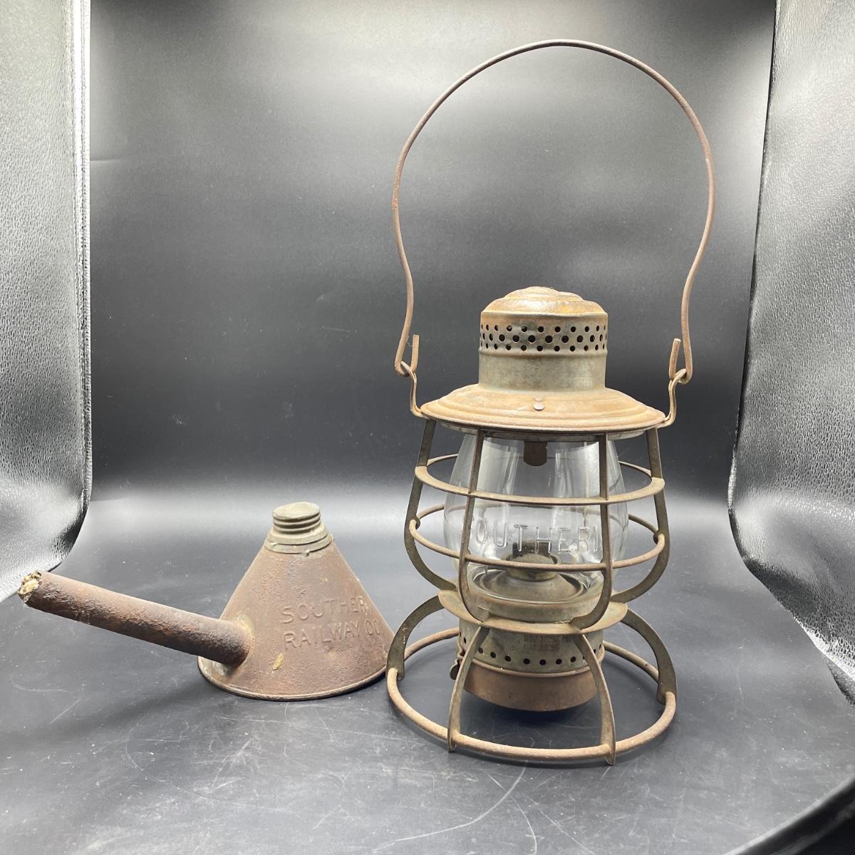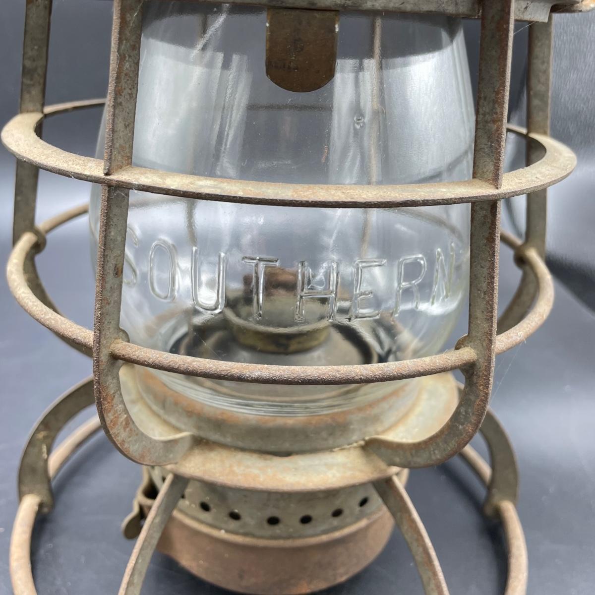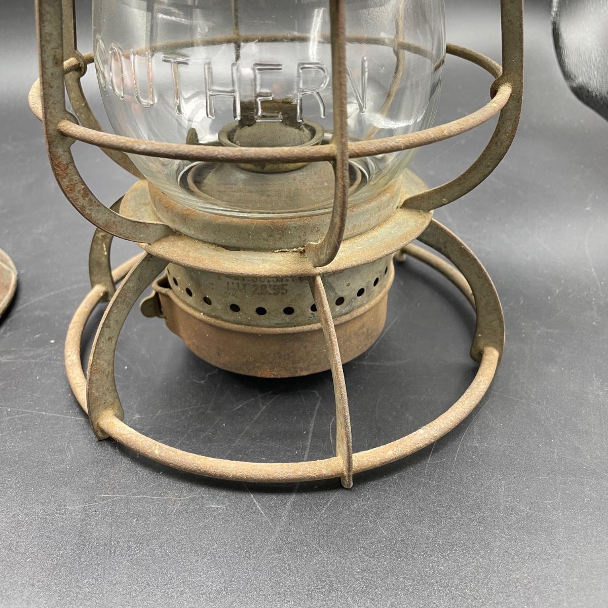 S. RY lantern has Southern marked on the clear glass globe and a worn manufacturer mark that appears to be Armspear. Lantern is 10” tall without its handle extended. Lantern is paired with a Southern Railroad oil lamp. Lamp measures 10” x 4.25” with a reservoir diameter of 5.25”