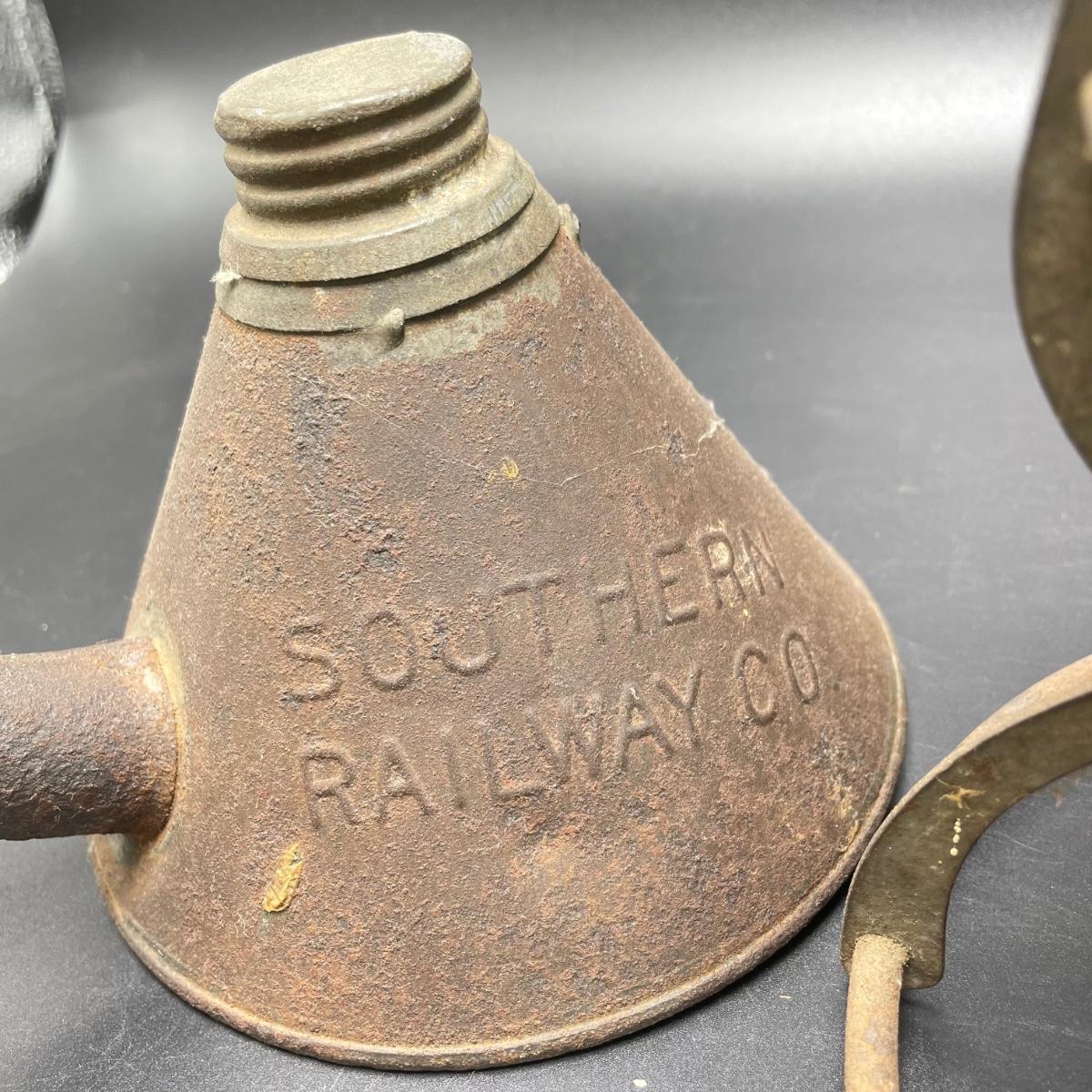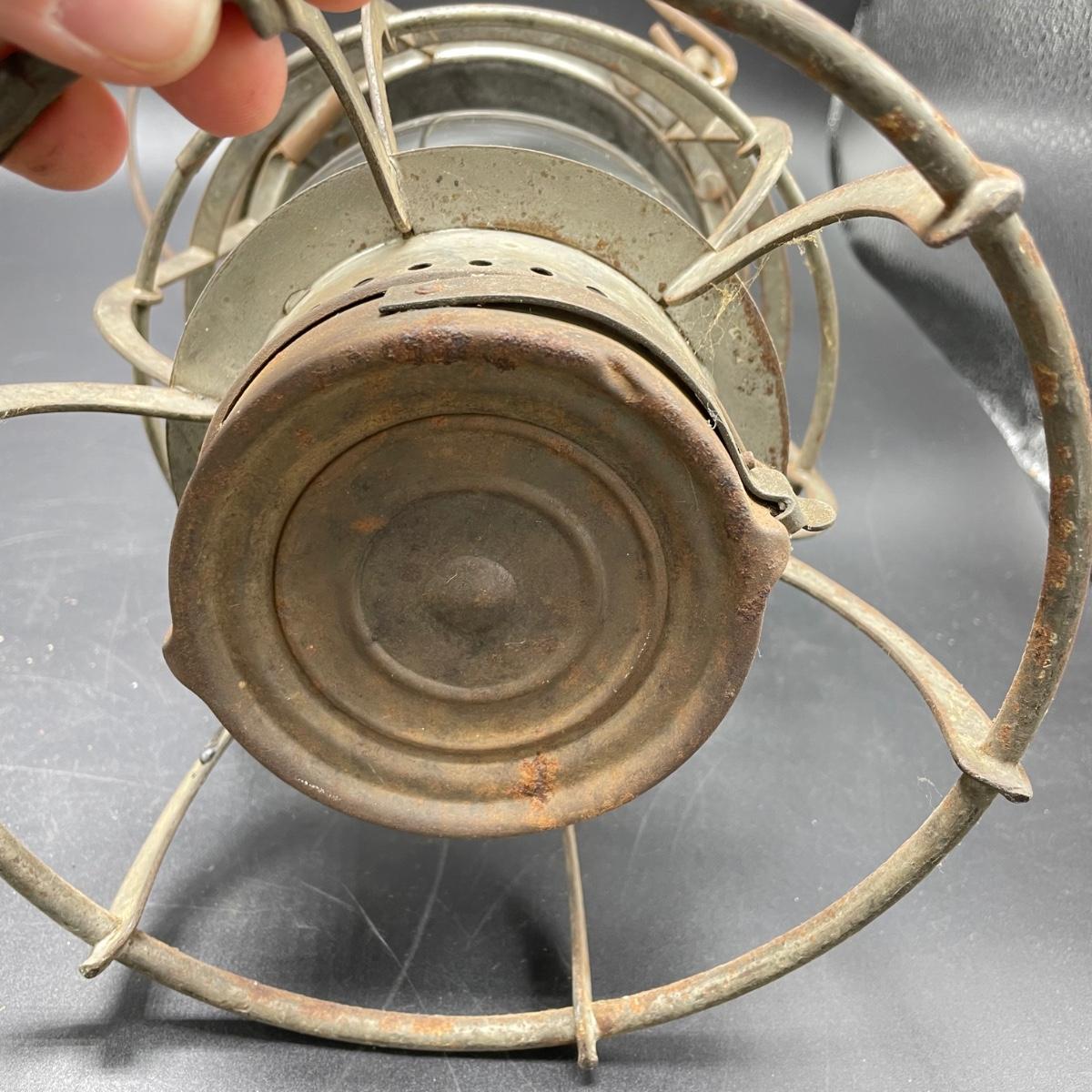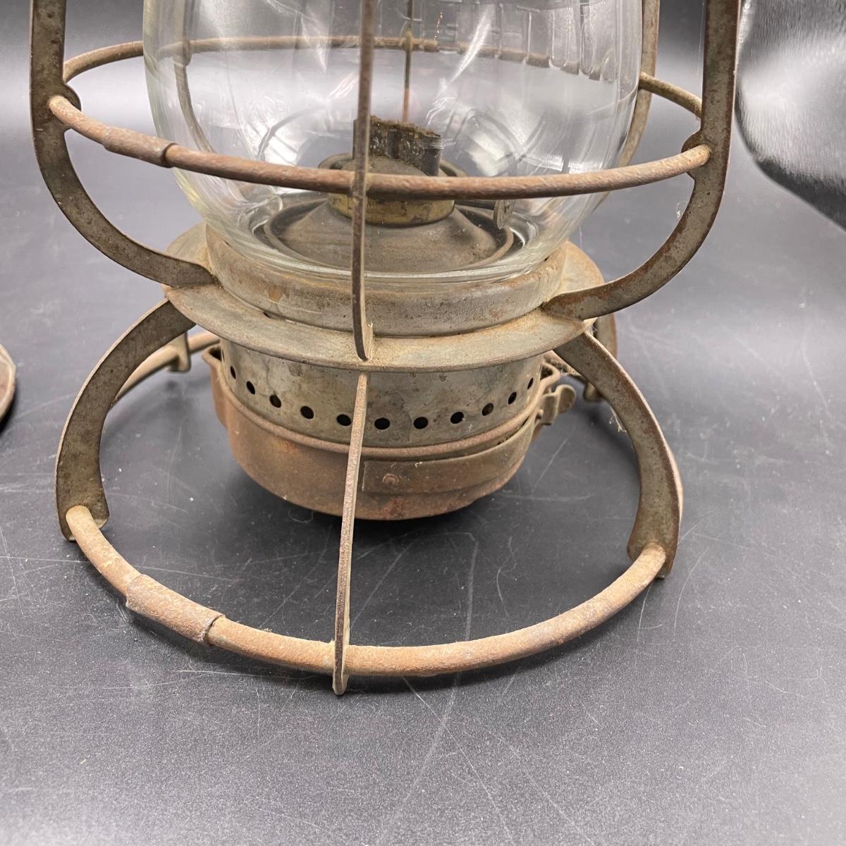 S. RY lantern has Southern marked on the clear glass globe and a worn manufacturer mark that appears to be Armspear. Lantern is 10” tall without its handle extended. Lantern is paired with a Southern Railroad oil lamp. Lamp measures 10” x 4.25” with a reservoir diameter of 5.25”