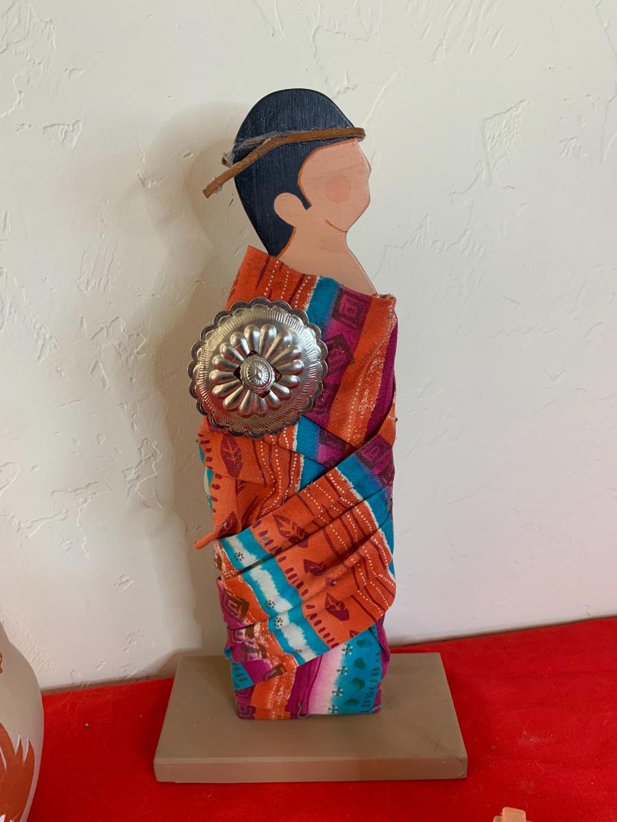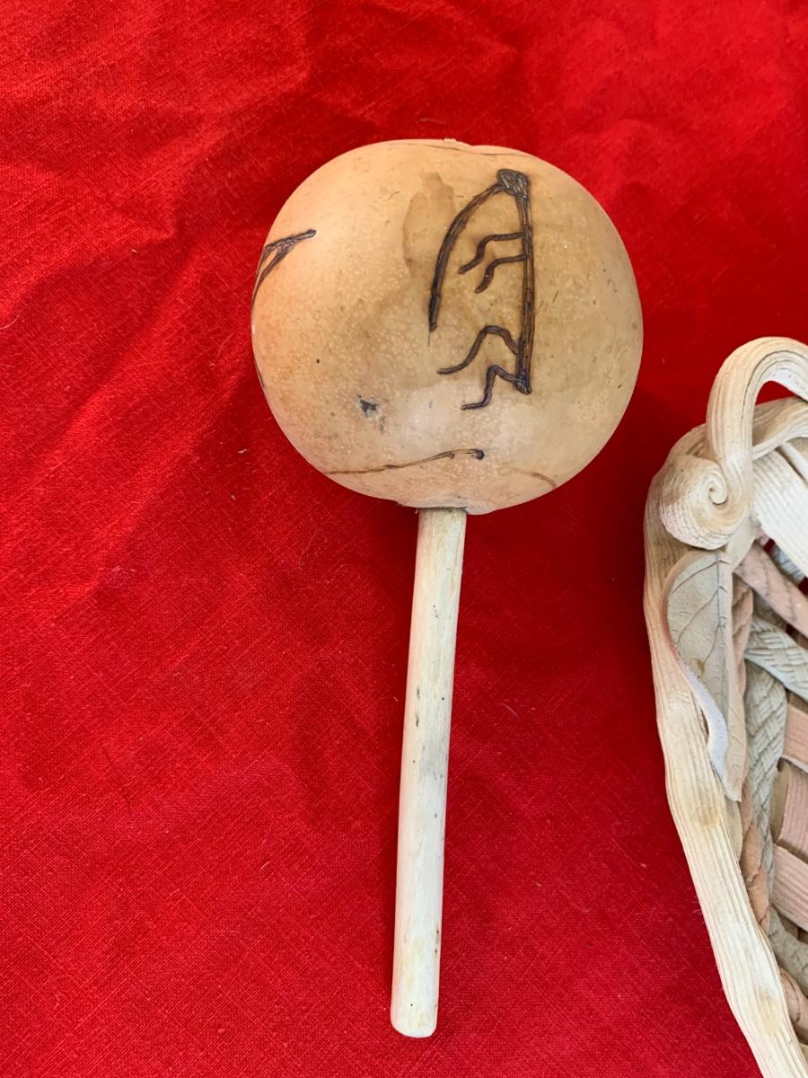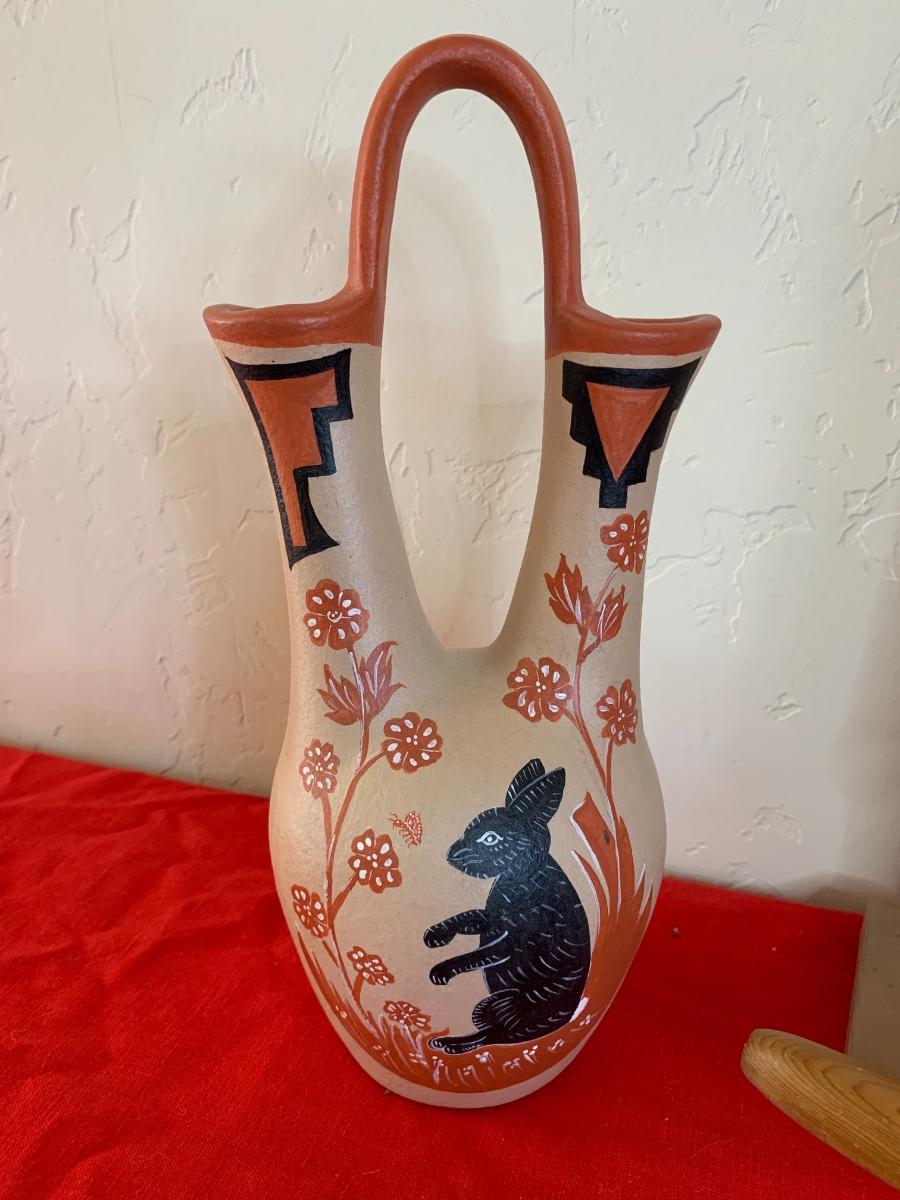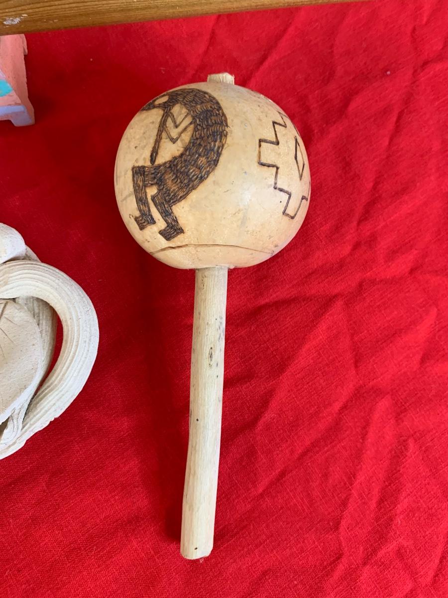 Includes a pottery wedding vase depicting a rabbit, signed L. Mitchell. Two wood burned pyrography cord maracas, a wood carved flute, a woven pottery bowl, small painted bench and painted wood southwest figure.