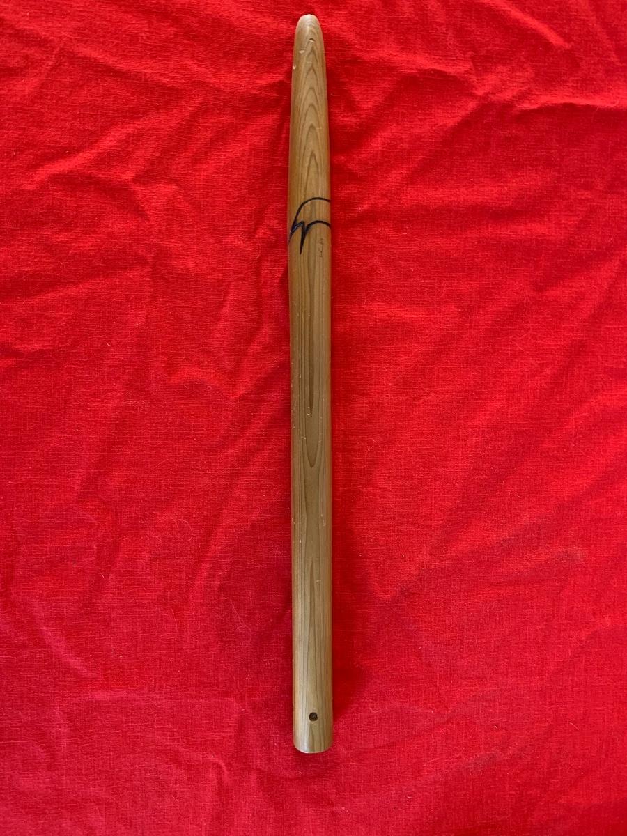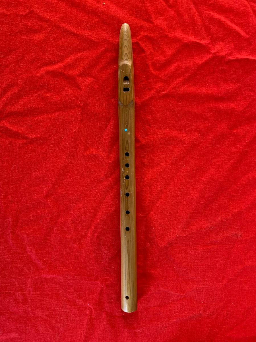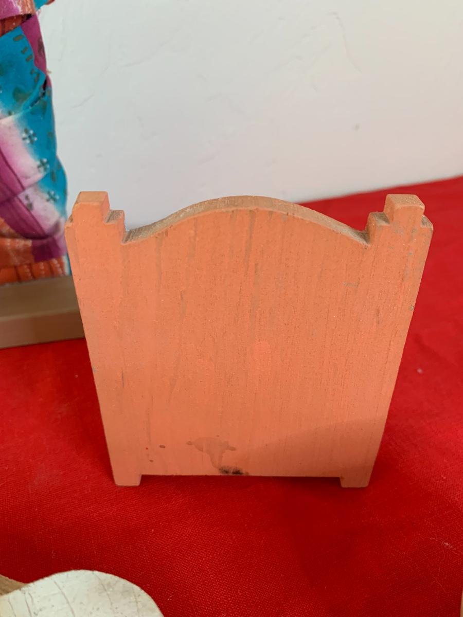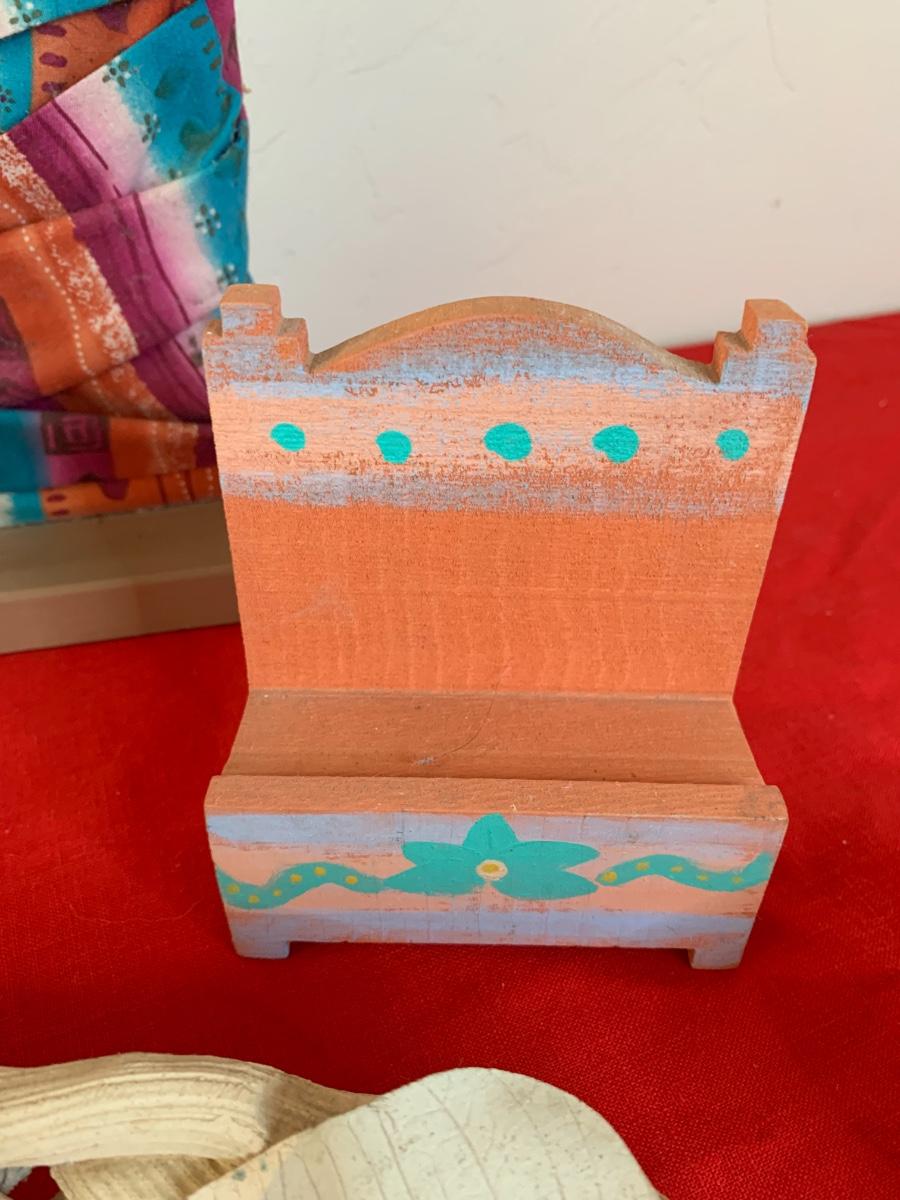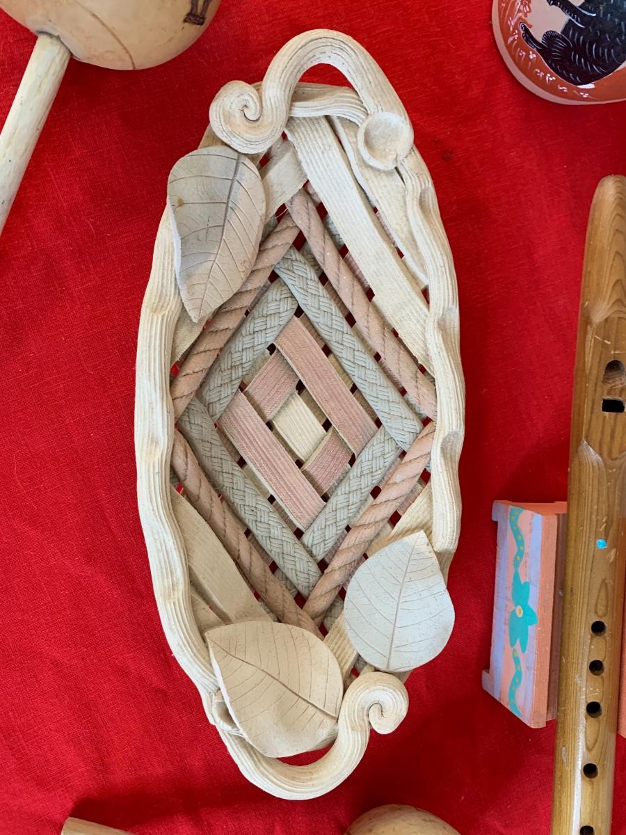 Includes a pottery wedding vase depicting a rabbit, signed L. Mitchell. Two wood burned pyrography cord maracas, a wood carved flute, a woven pottery bowl, small painted bench and painted wood southwest figure.