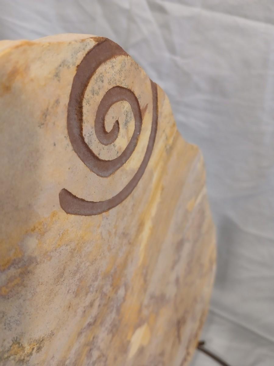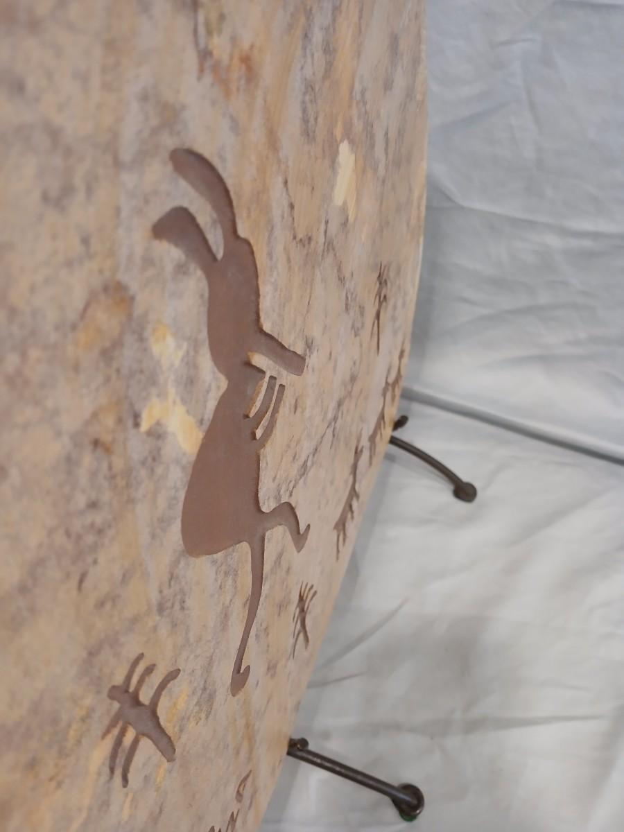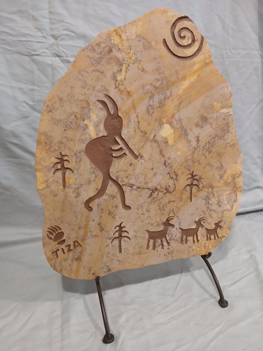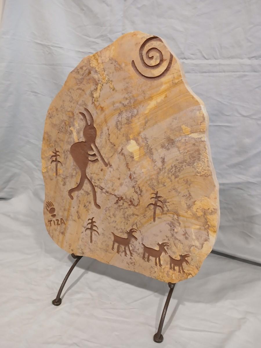 Southwest Native Incised Sandstone Slab signed Tiza w/Wrought Iron Stand - Kokopelli