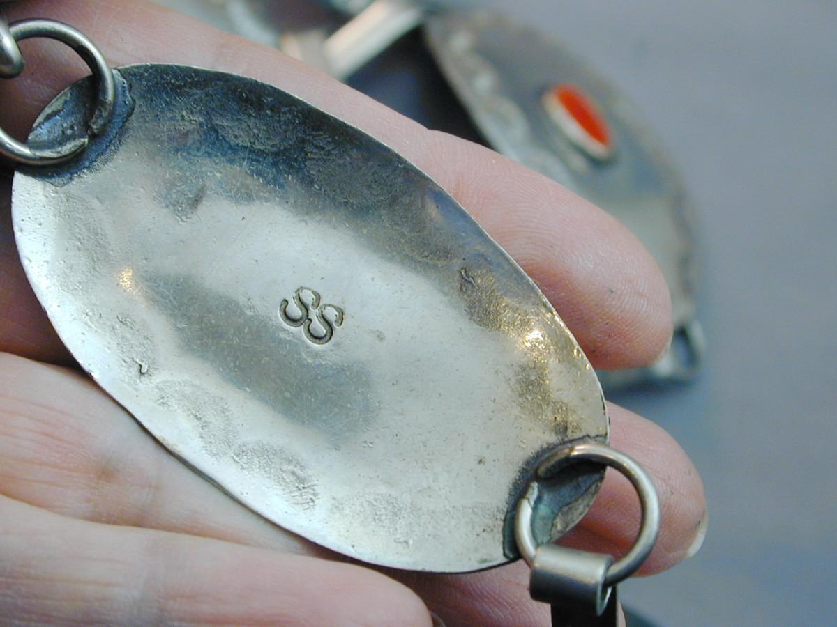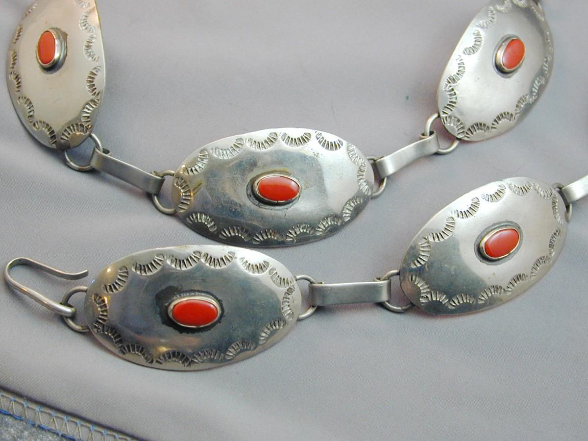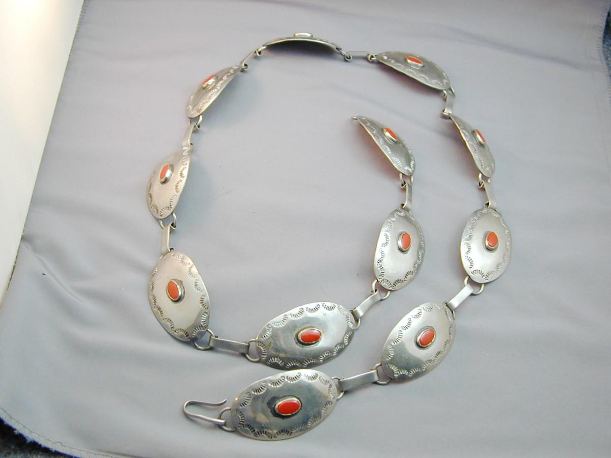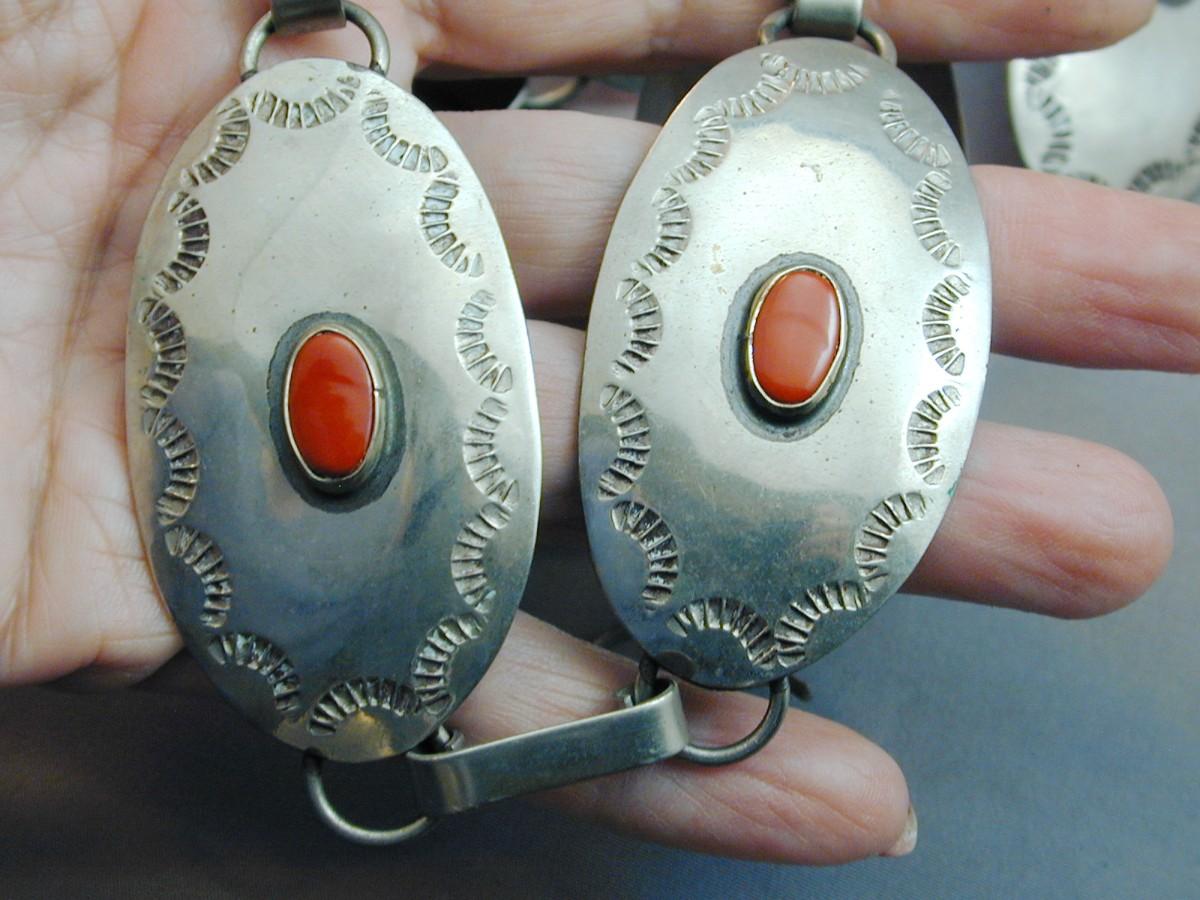 This southwest 12 stamped concho belt is signed SS. It is a low grade silver or silver tone metal - tests green with acid. It has deep red stones and is in great condition. It measures 38.5 inches long.