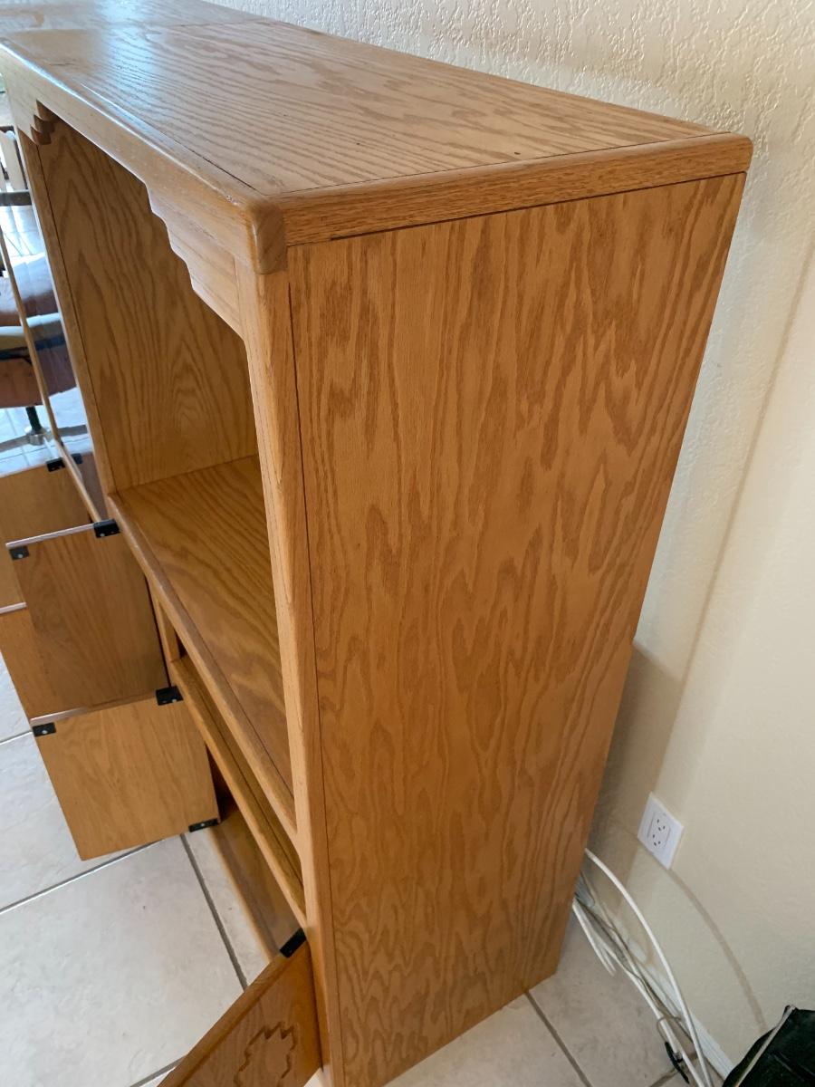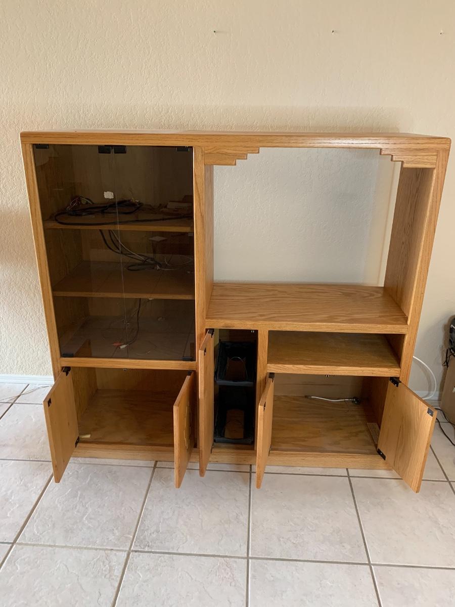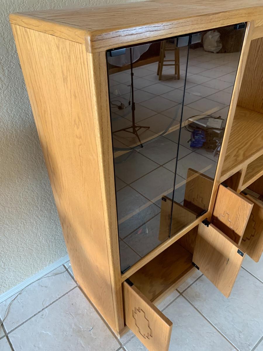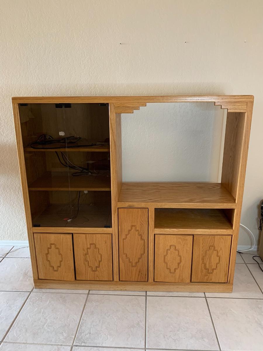 Smaller scale oak entertainment center with southwest designs on corners and cabinet doors. Glass doors on the left, tall storage space for Cds. 55” wide 16.5” deep x 52” tall. Great condition, just dusty.