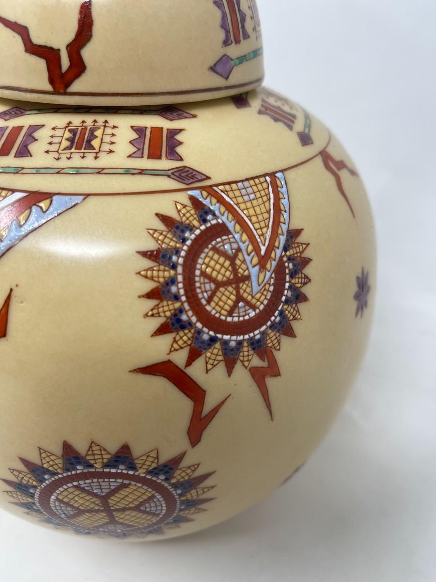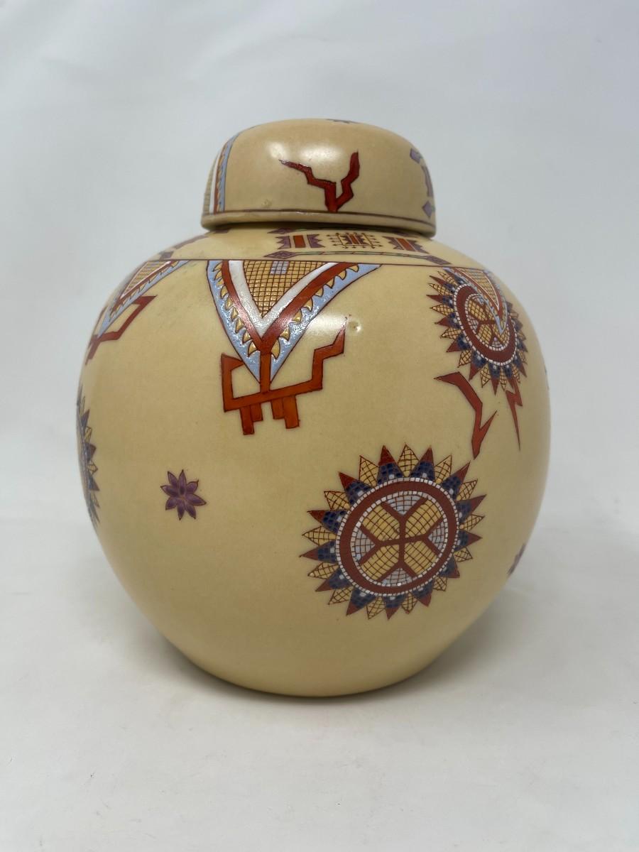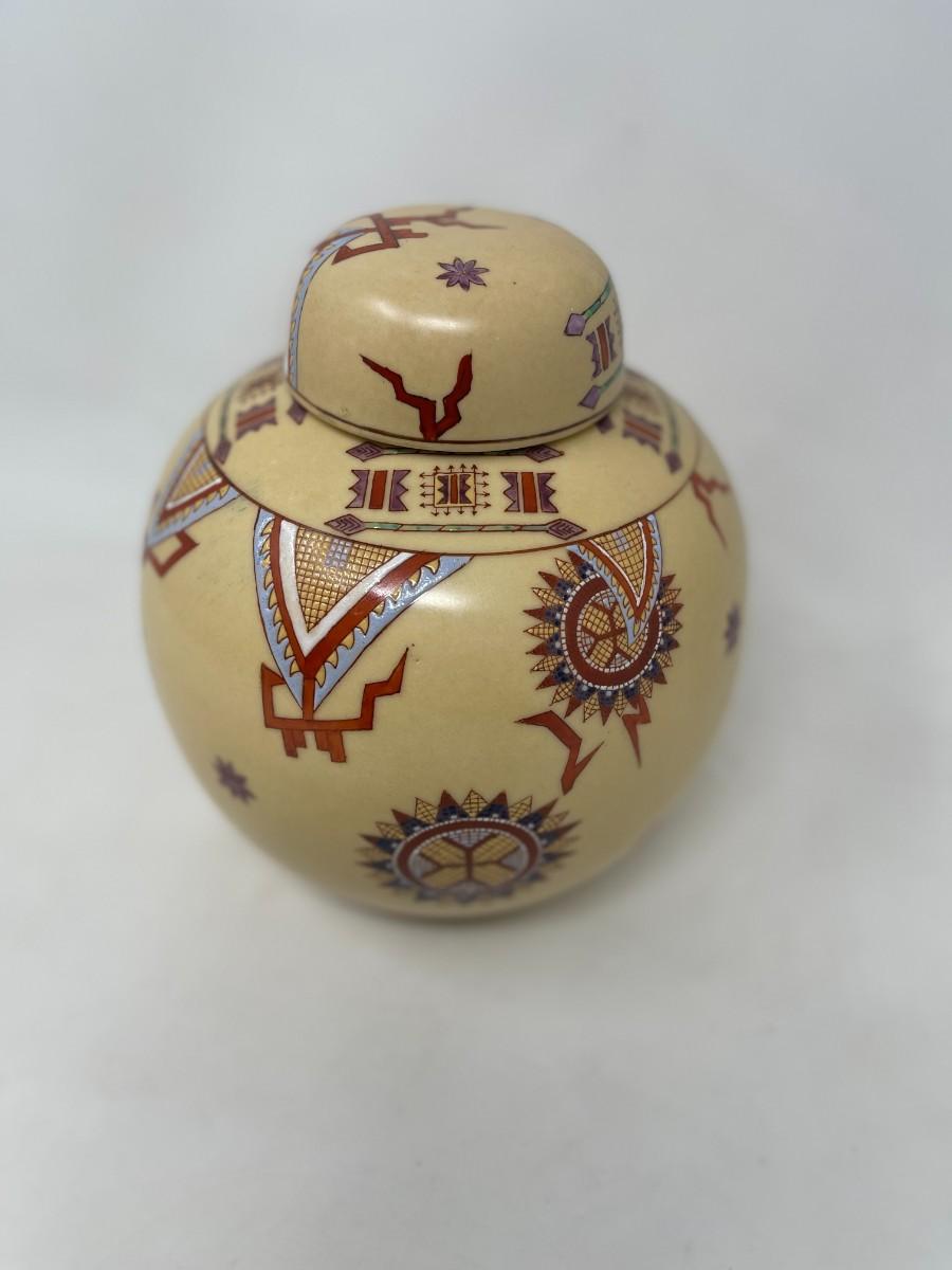 Beige hand-painted & decorated Chinese jar with lid with a southwest design. Nicely made with accent colors of blues, yellows, & deep red or burgundy. 8" H x 6" W# 421