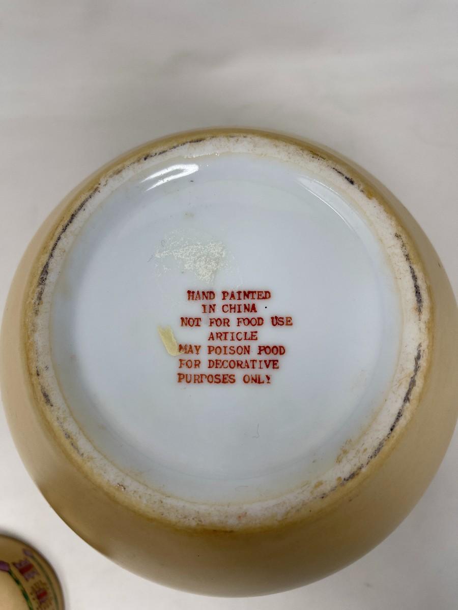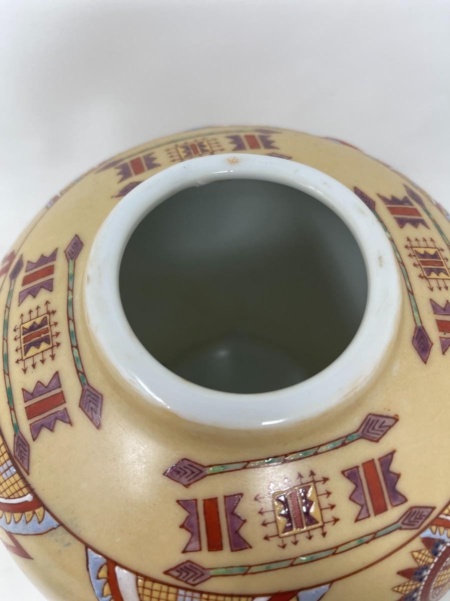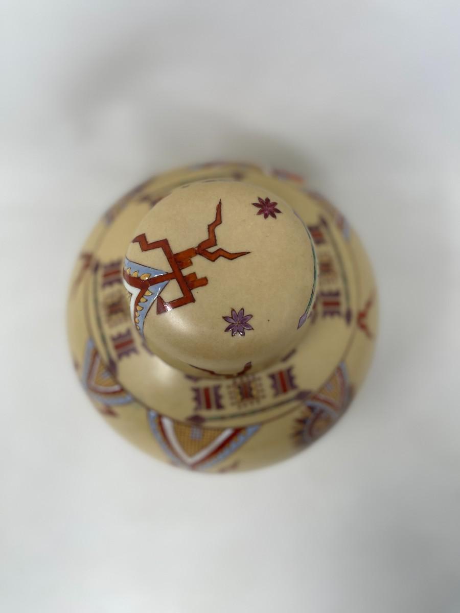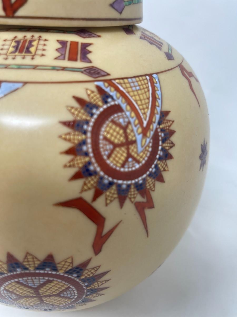 Beige hand-painted & decorated Chinese jar with lid with a southwest design. Nicely made with accent colors of blues, yellows, & deep red or burgundy. 8" H x 6" W# 421