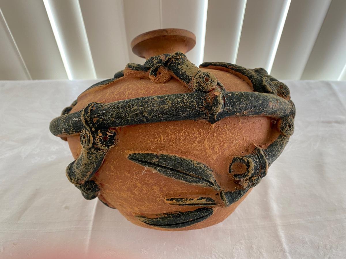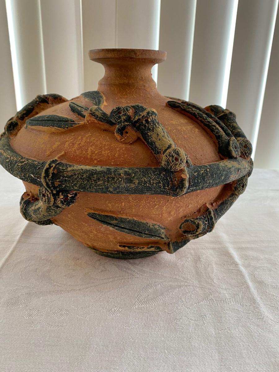 Southwest style pottery vase with vines. Approx 9” x 11”dia