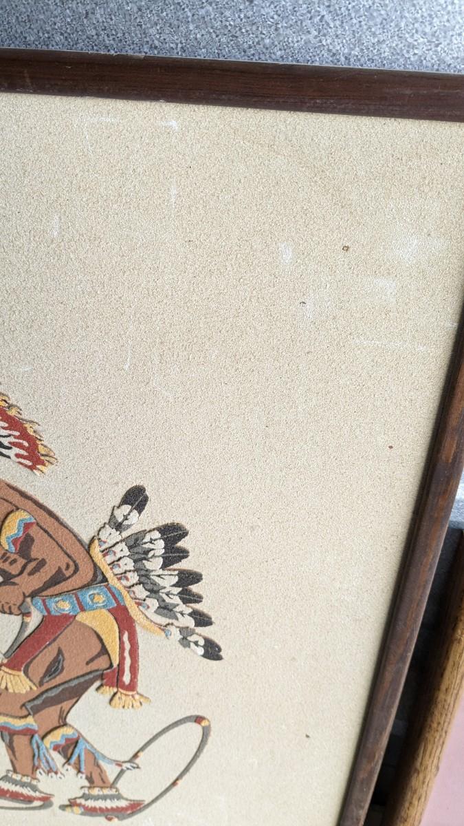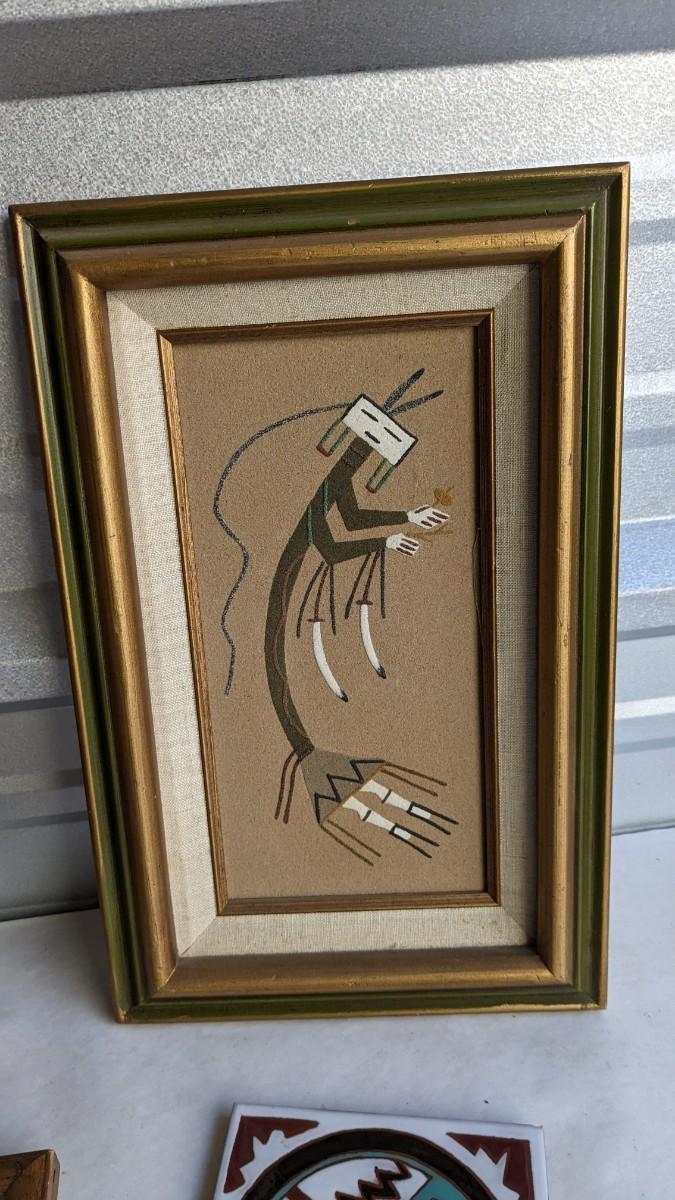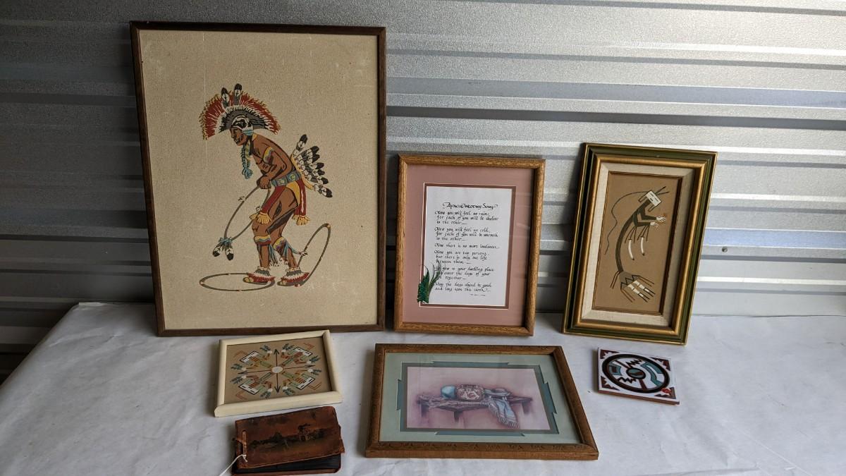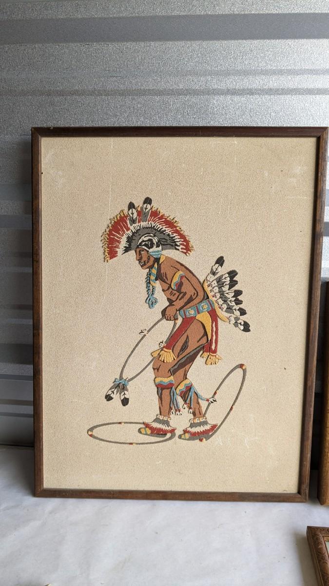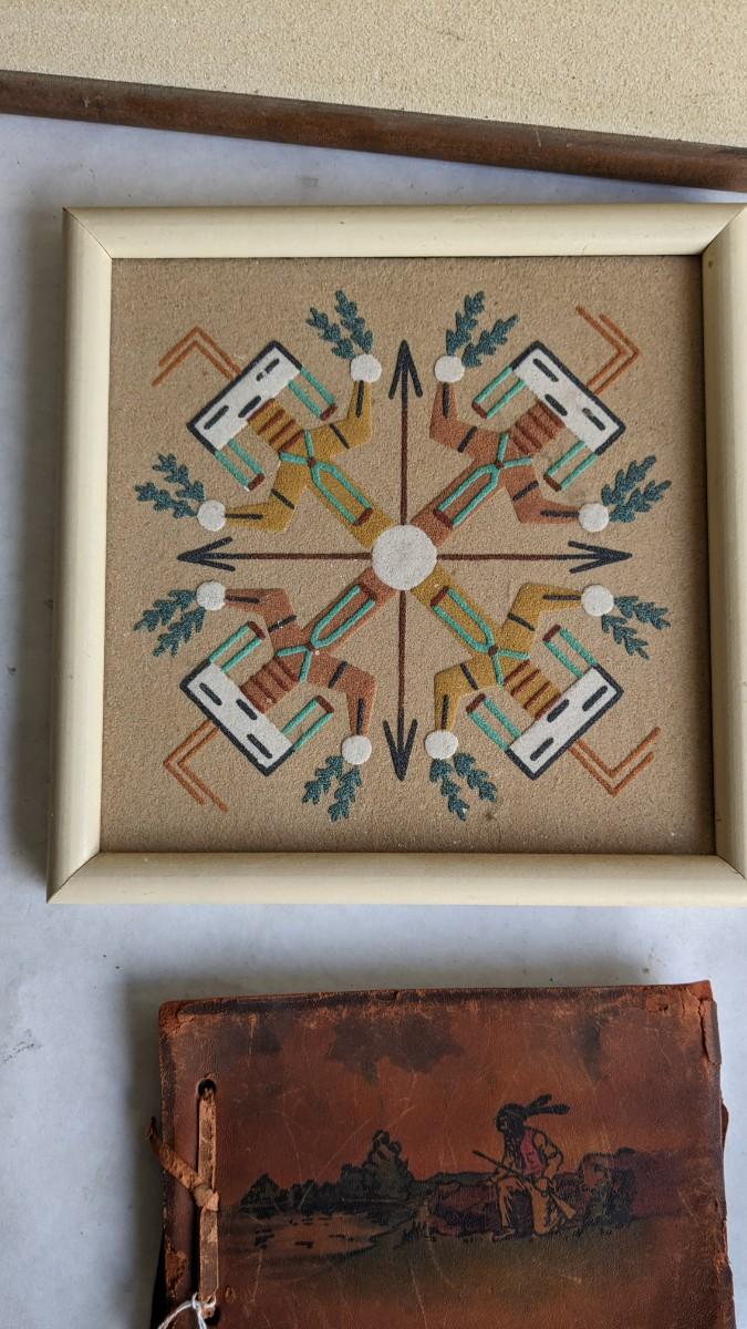 beautiful sand art and more in this assortment, note wear present on each piece. Includes early leather bound photo album. largest piece at 24.75"x19". No shipping. 2604