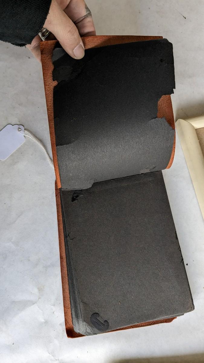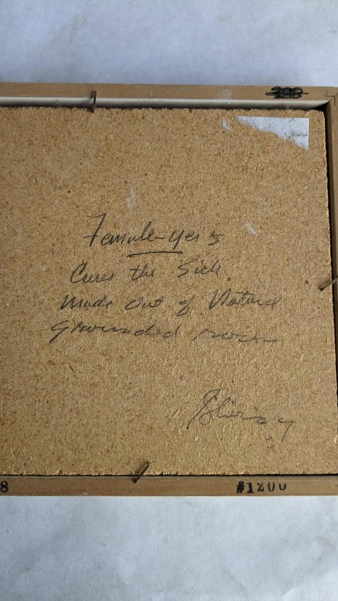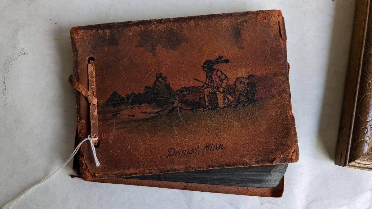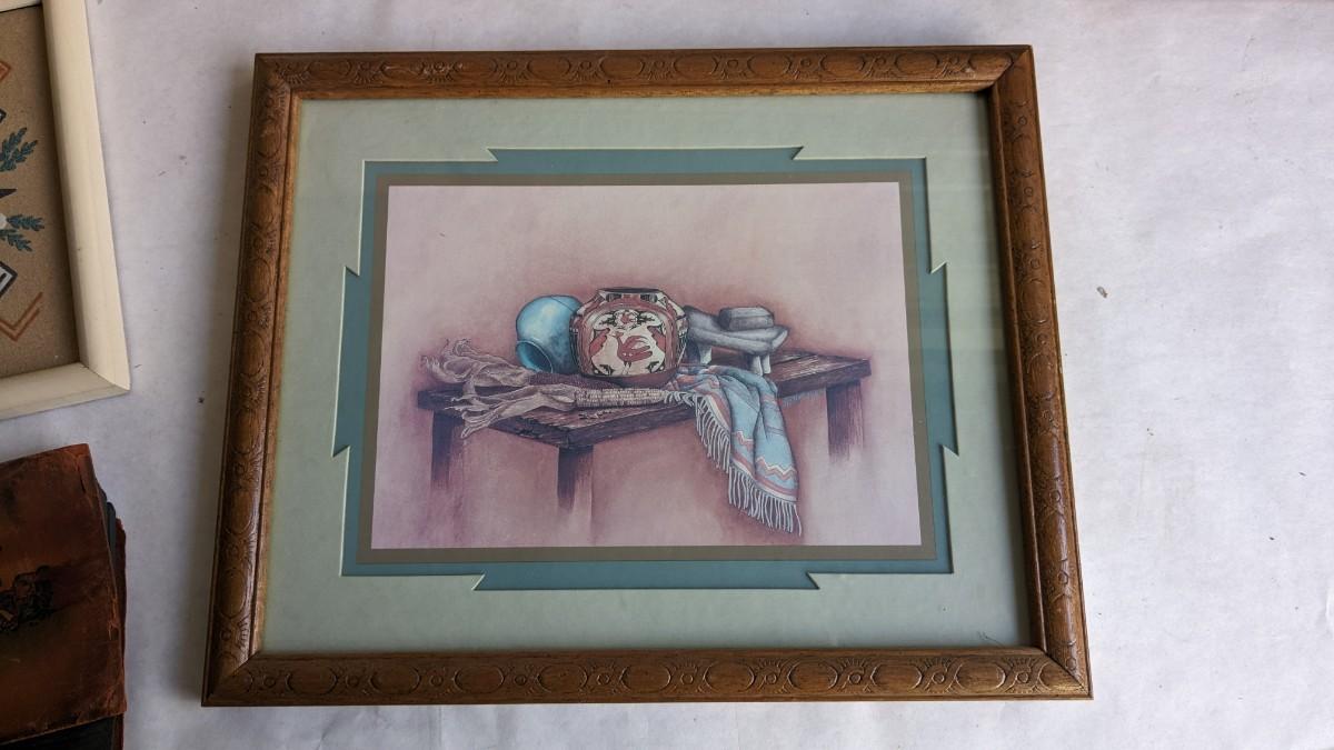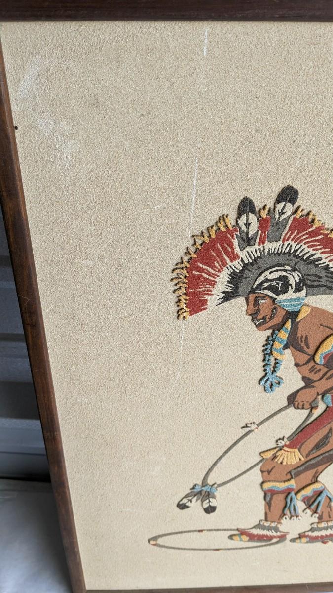 beautiful sand art and more in this assortment, note wear present on each piece. Includes early leather bound photo album. largest piece at 24.75"x19". No shipping. 2604