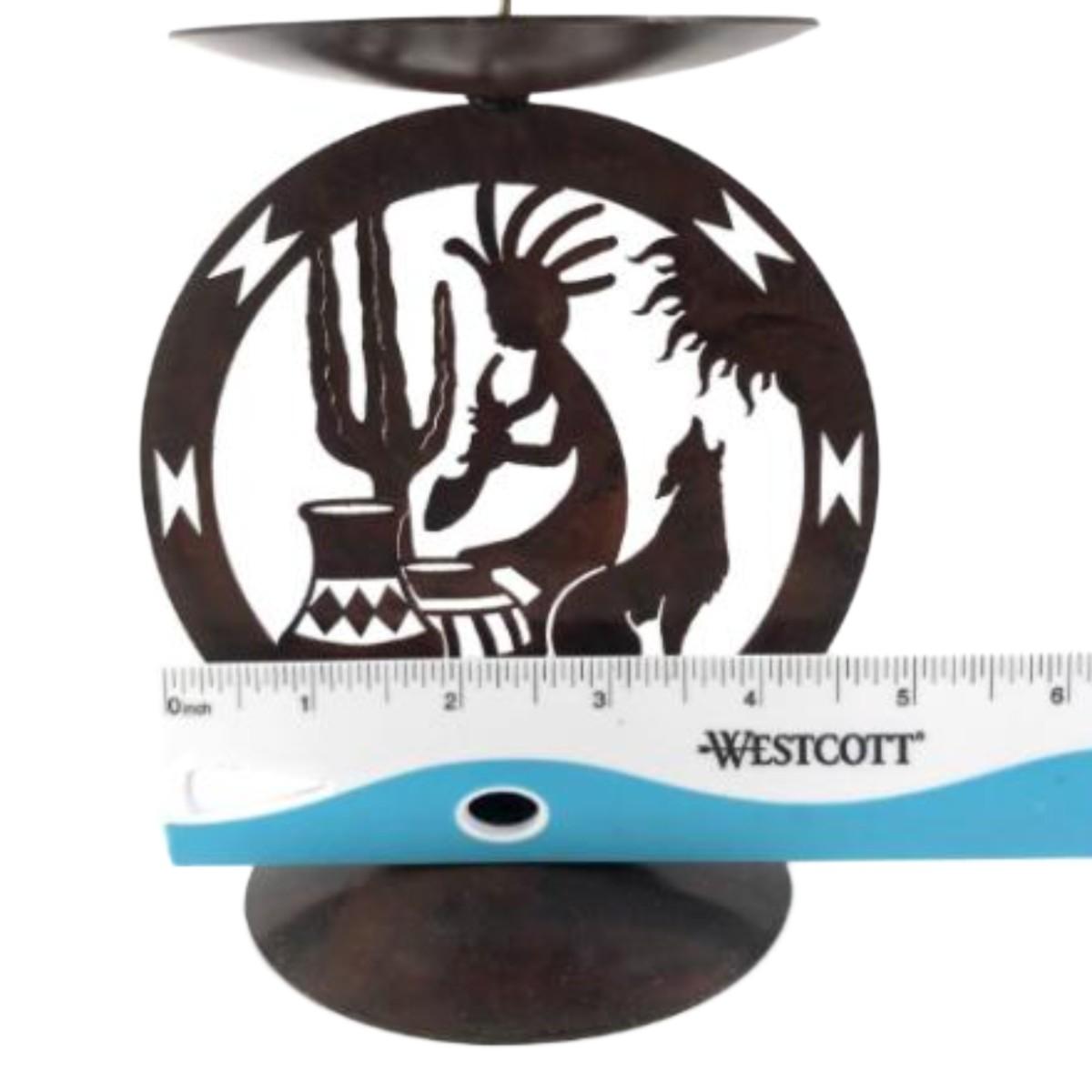 Metal pillar candle stand with coyote, Kokopelli, and saguaro cactus. Super neat southwest design! Please see photos for measurements.
