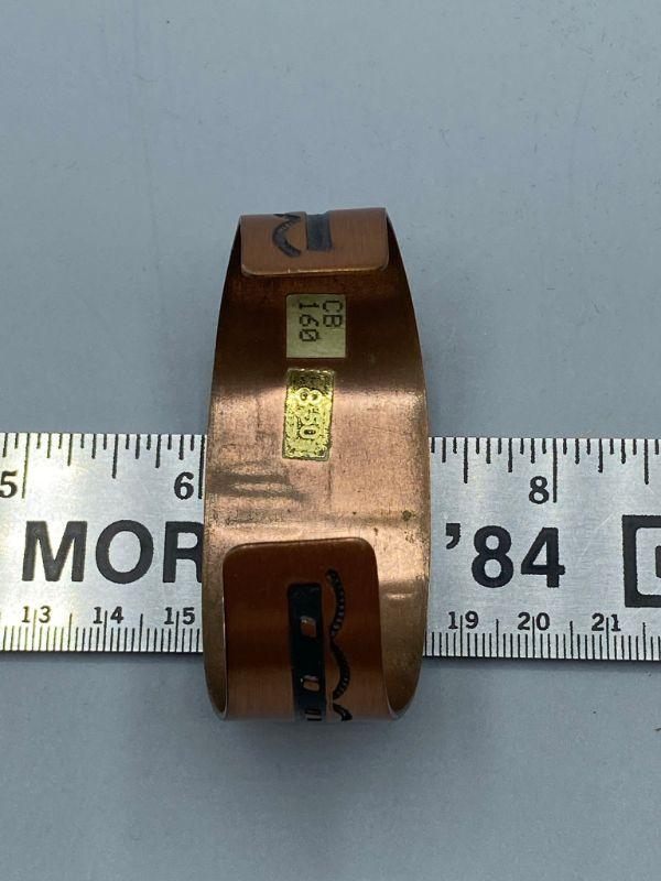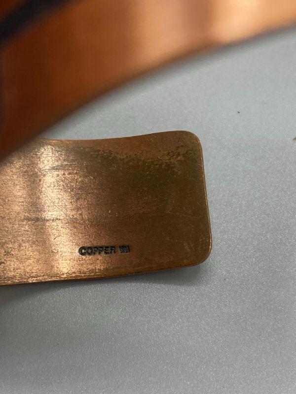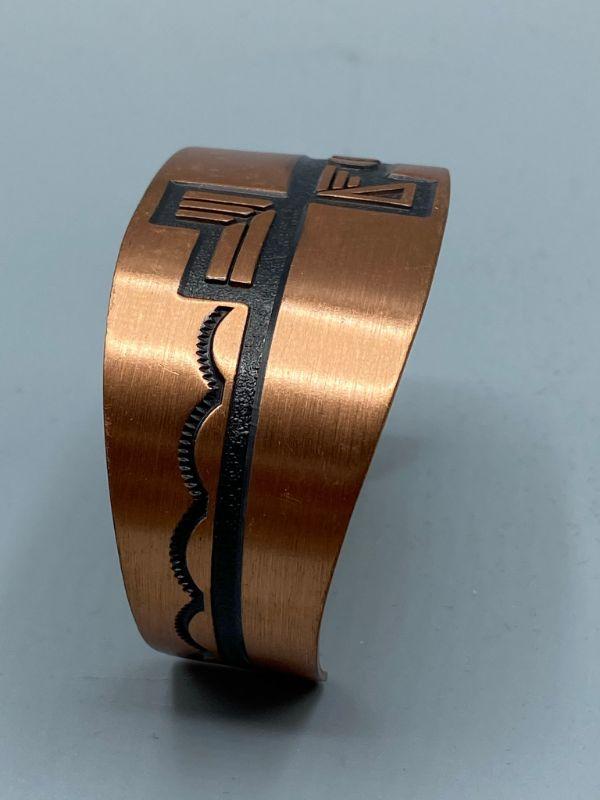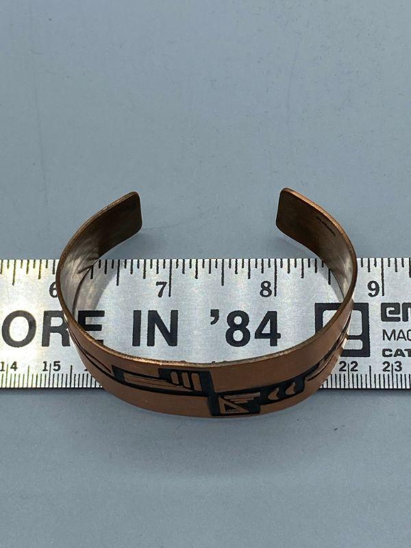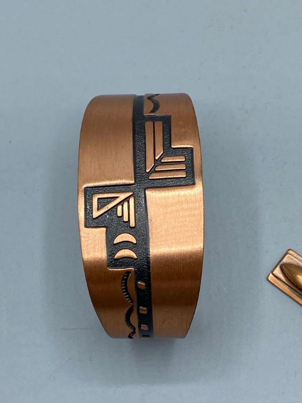 Brushed copper men's jewelry. Southwestern design style. Unbranded, bracelet is stamped copper. Adjustable size
