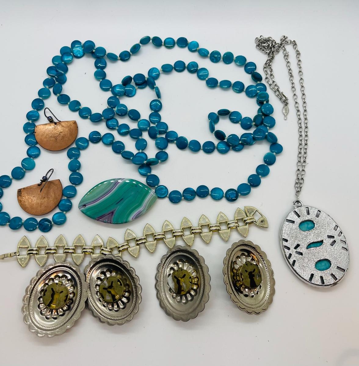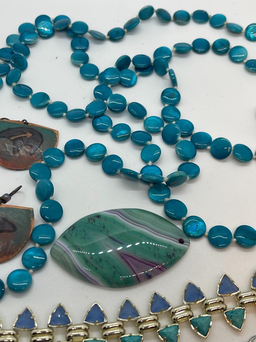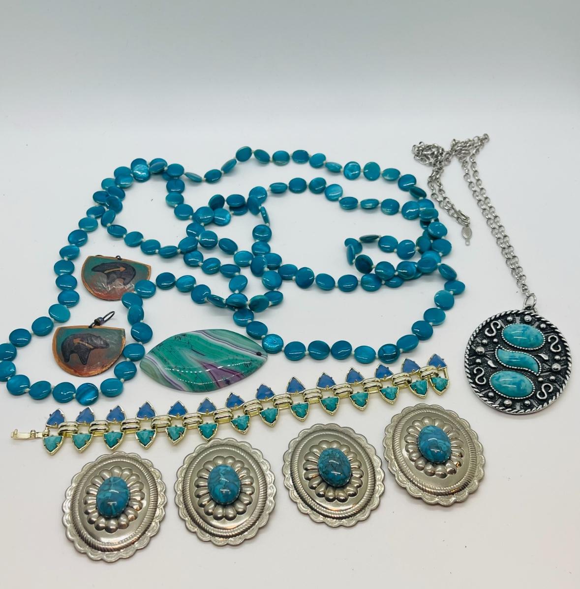 Lots of cute pieces to include super cool button covers, and cute necklaces! Cute bracelet -stone pendant has tiny hole for string. Blue circle neck is 48” and other is 24”. Southwest blue is perfect for spring and Summer.