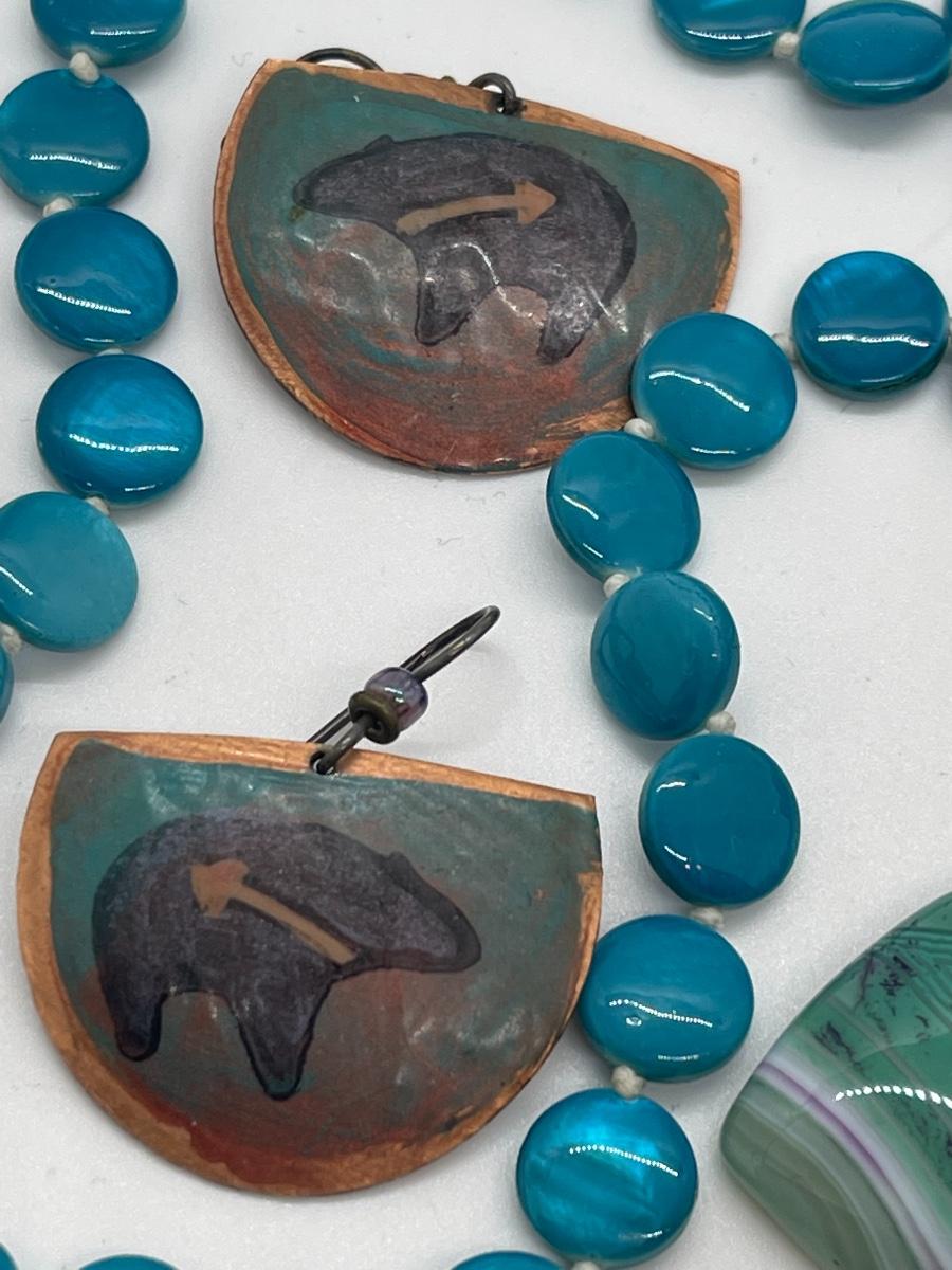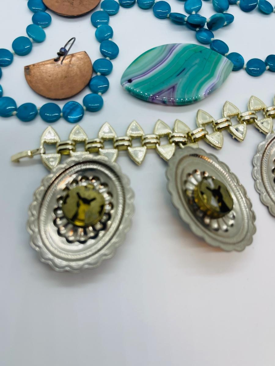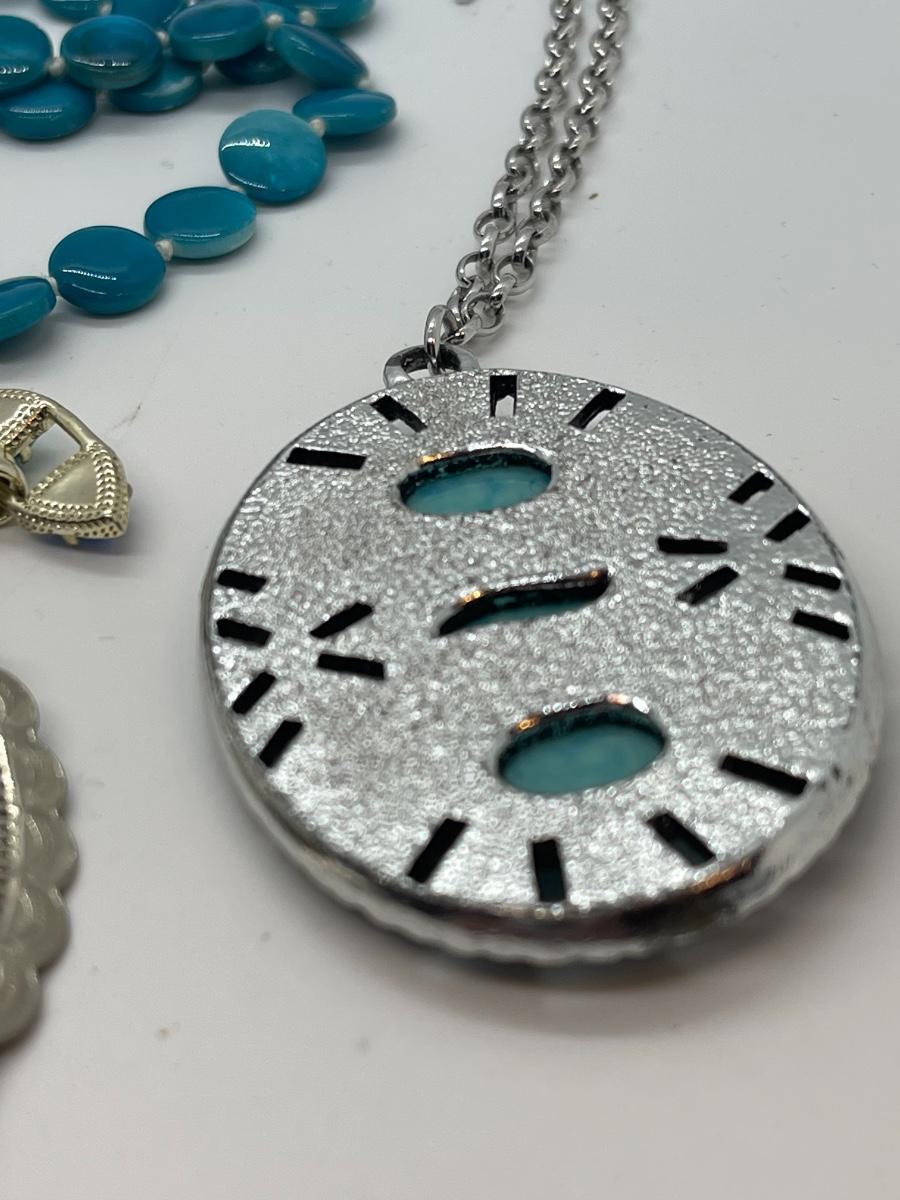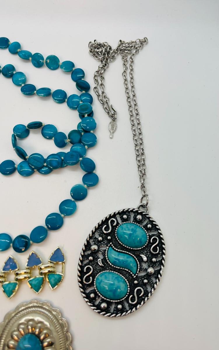 Lots of cute pieces to include super cool button covers, and cute necklaces! Cute bracelet -stone pendant has tiny hole for string. Blue circle neck is 48” and other is 24”. Southwest blue is perfect for spring and Summer.