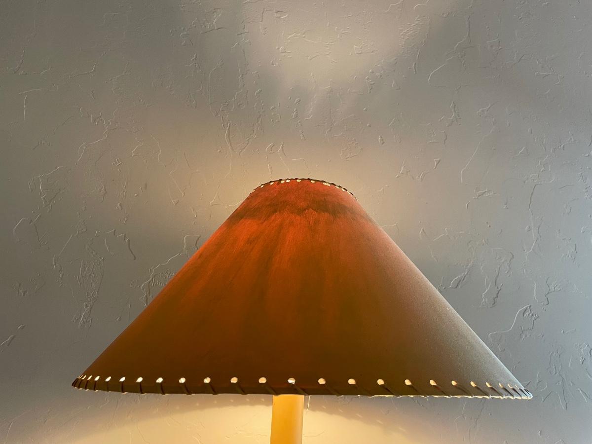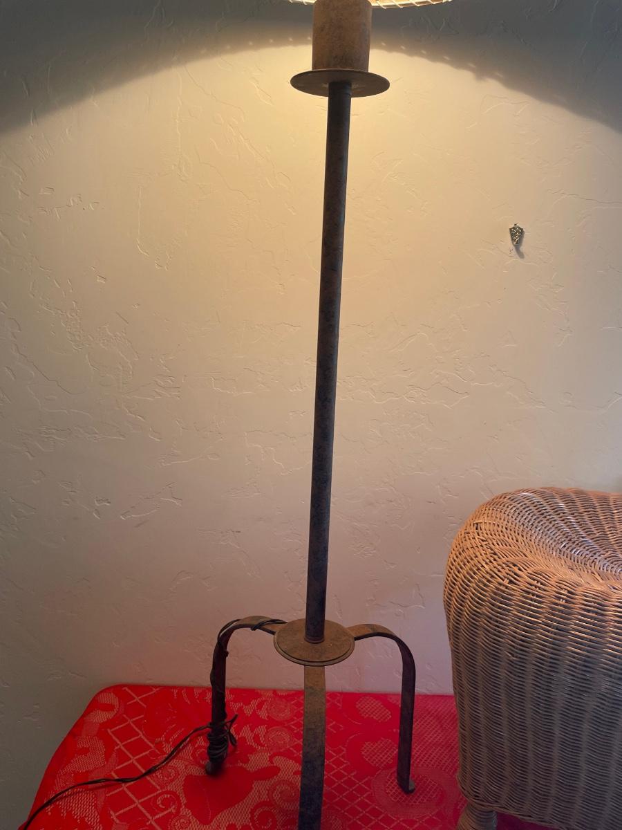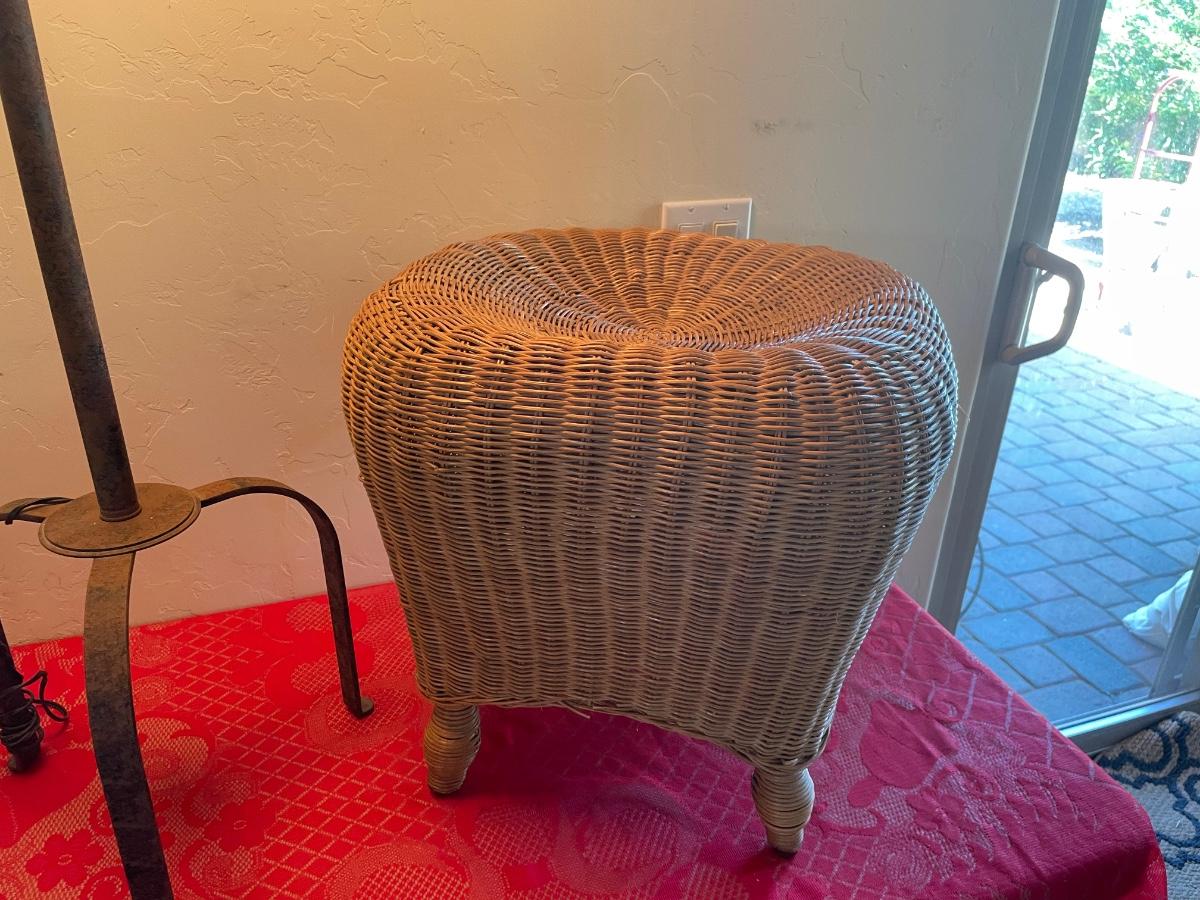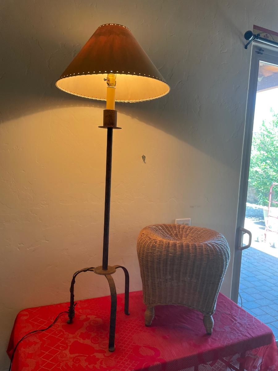 One whicker ottoman in good condition and a lamp with a metal base and southwest style lamp shade.