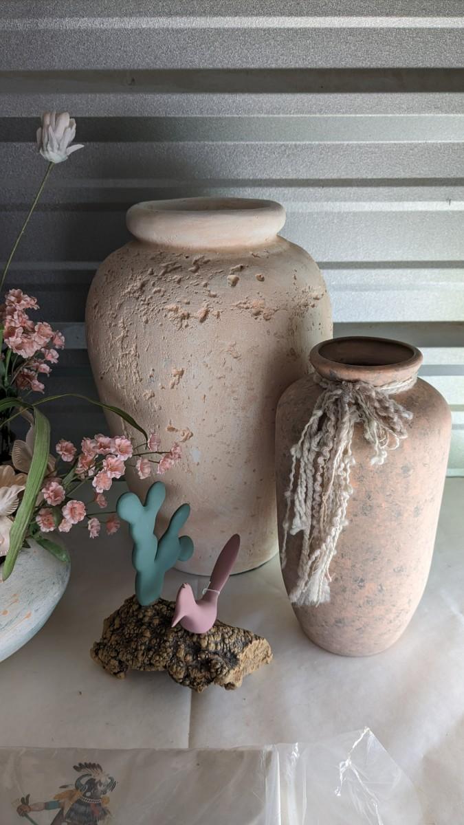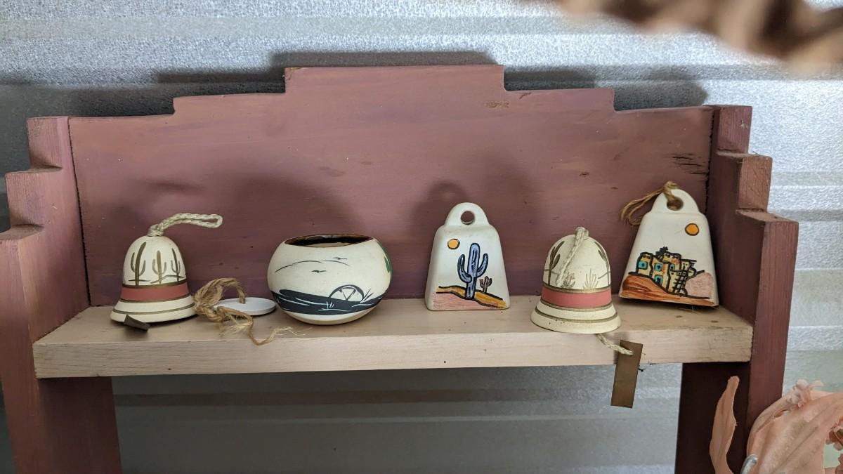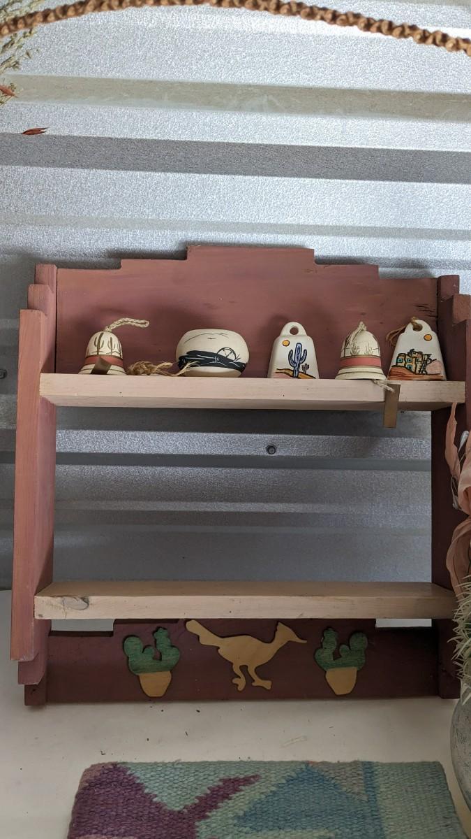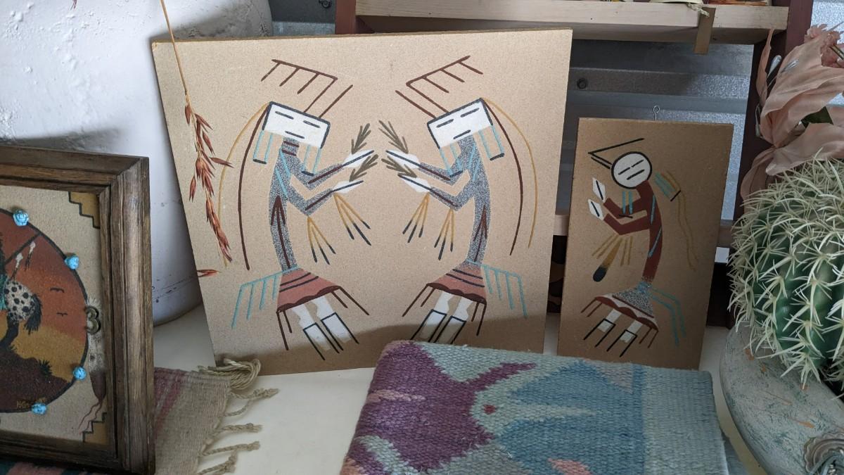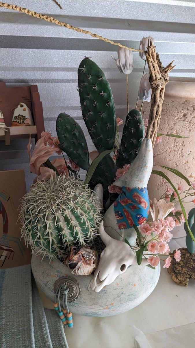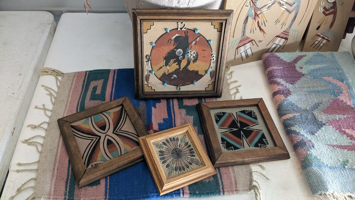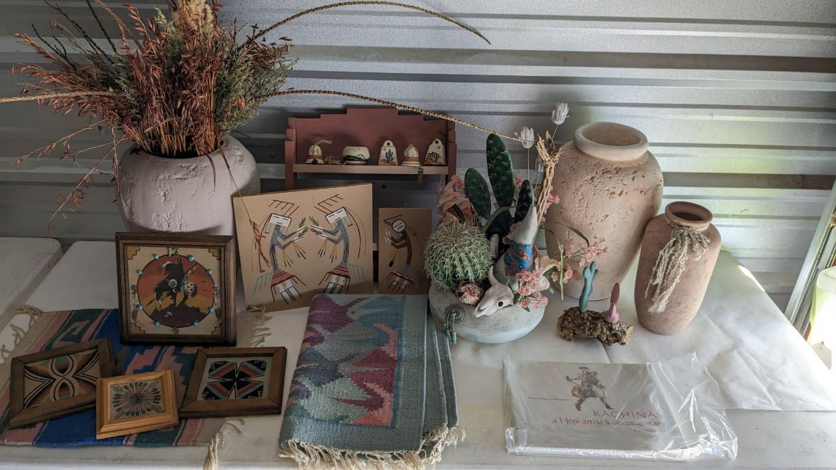 3 pots, 6 sand art pieces, 2 hand crafted fiber art pieces, Barton Wright Kachinas hardcover book, a beautiful Nemadji style pot with varied faux florals, 5 small pieces of pottery, and a neat hand crafted shelf. No shipping. 2616