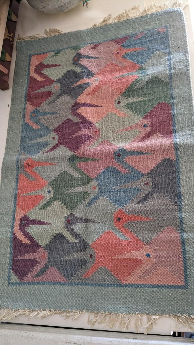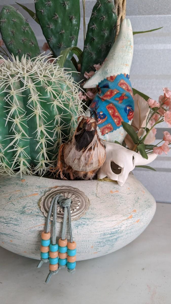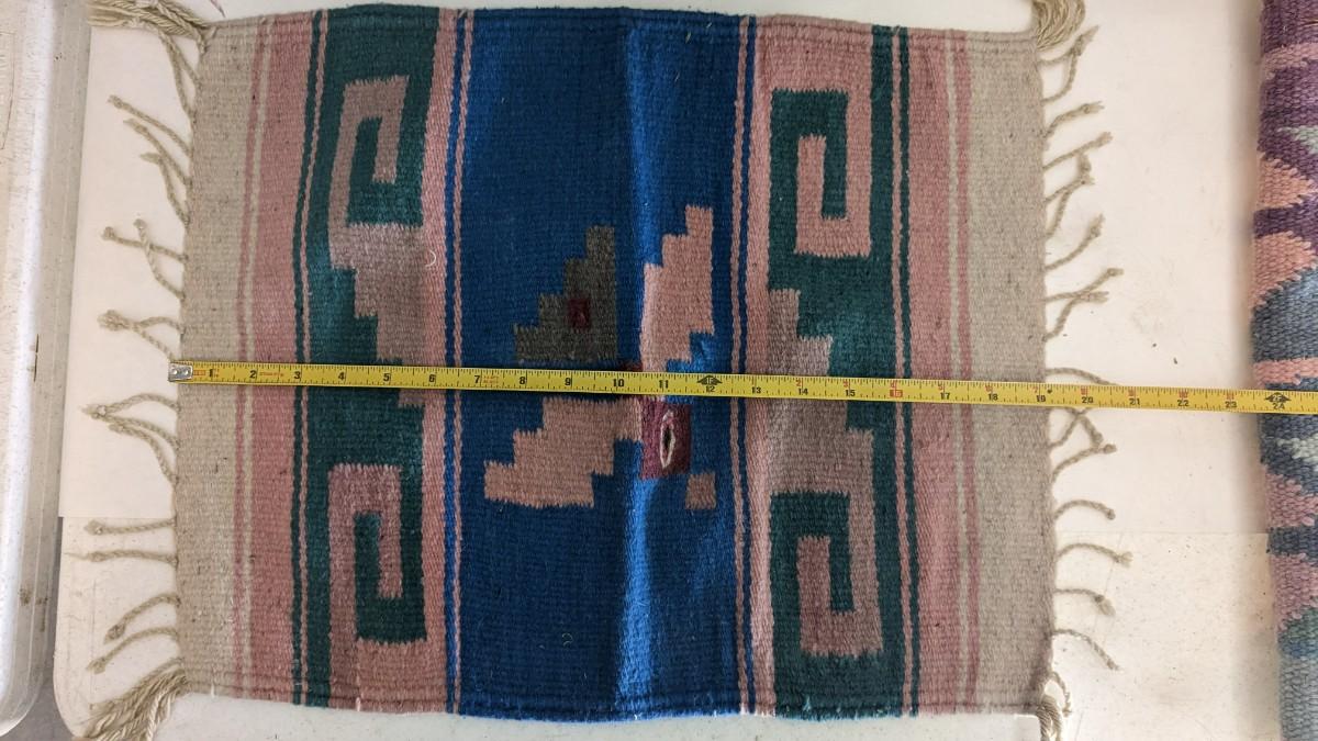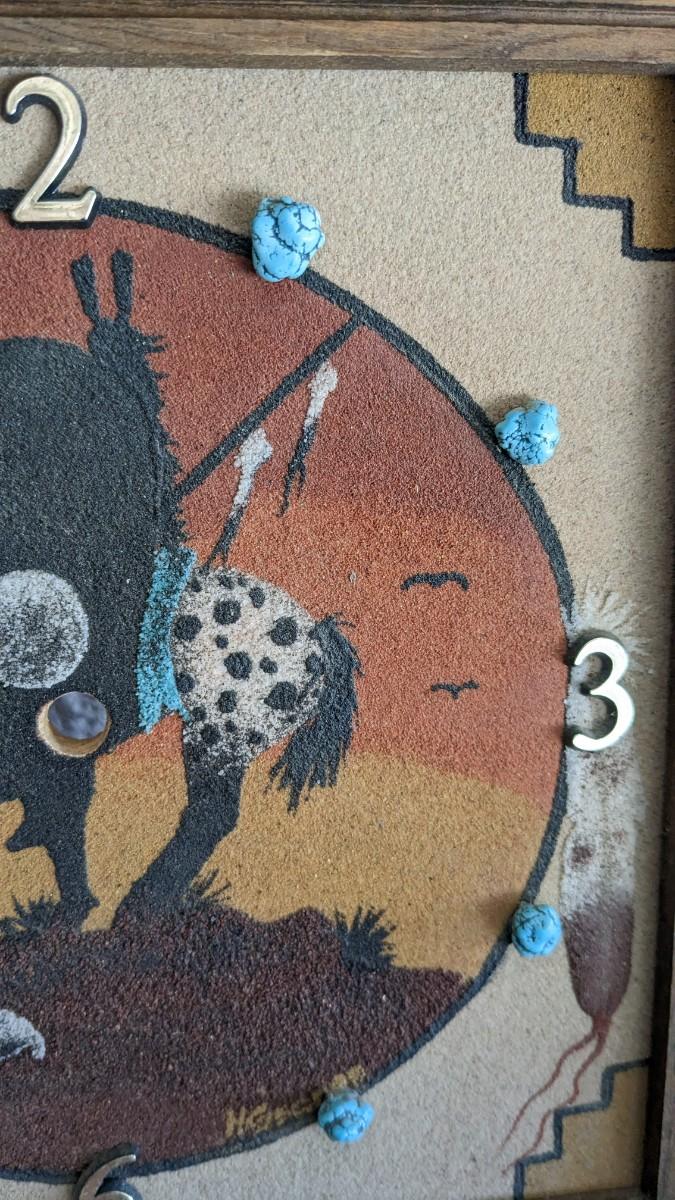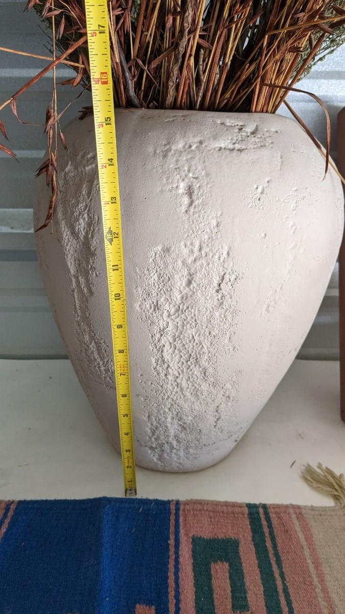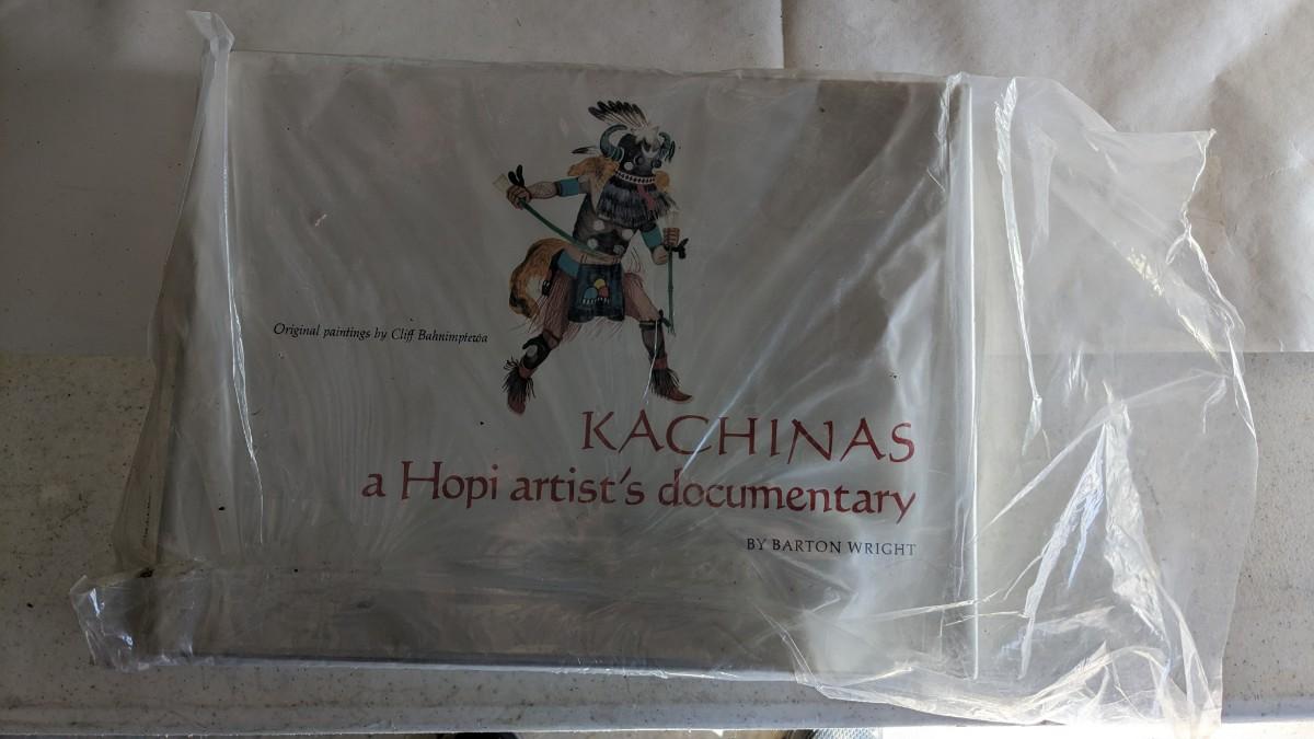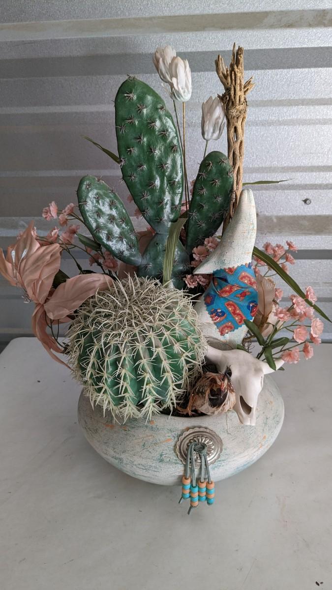 3 pots, 6 sand art pieces, 2 hand crafted fiber art pieces, Barton Wright Kachinas hardcover book, a beautiful Nemadji style pot with varied faux florals, 5 small pieces of pottery, and a neat hand crafted shelf. No shipping. 2616
