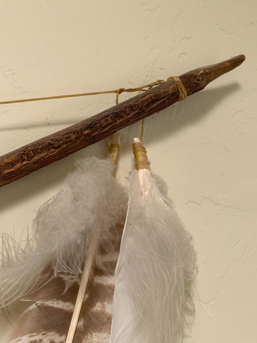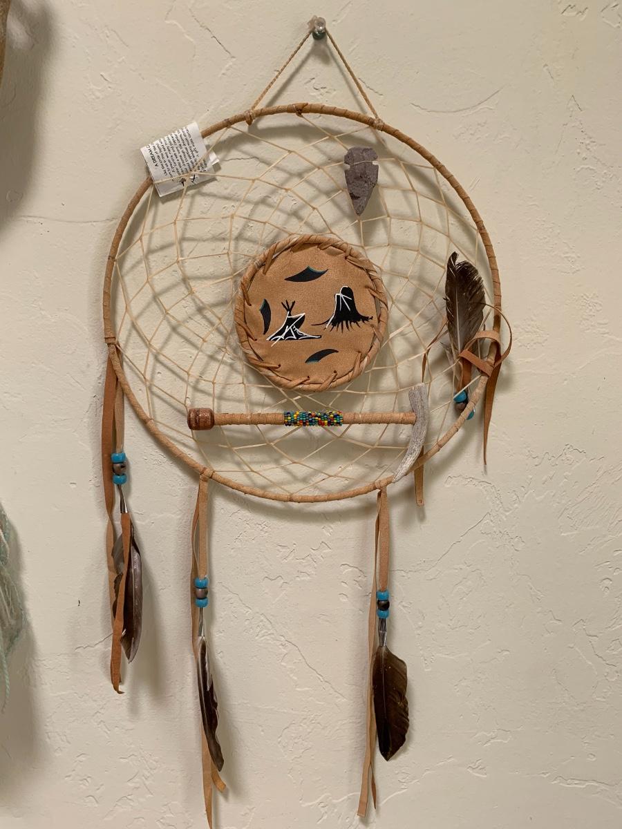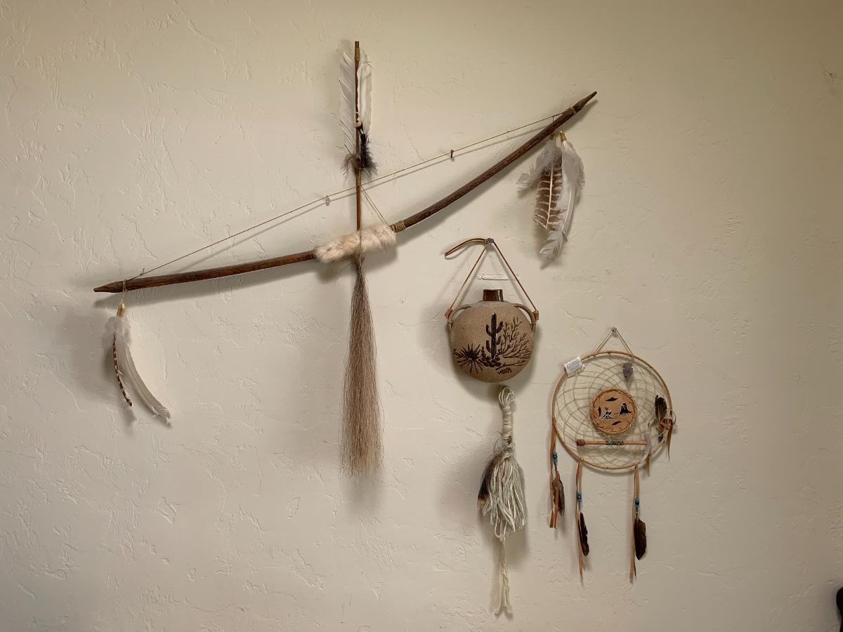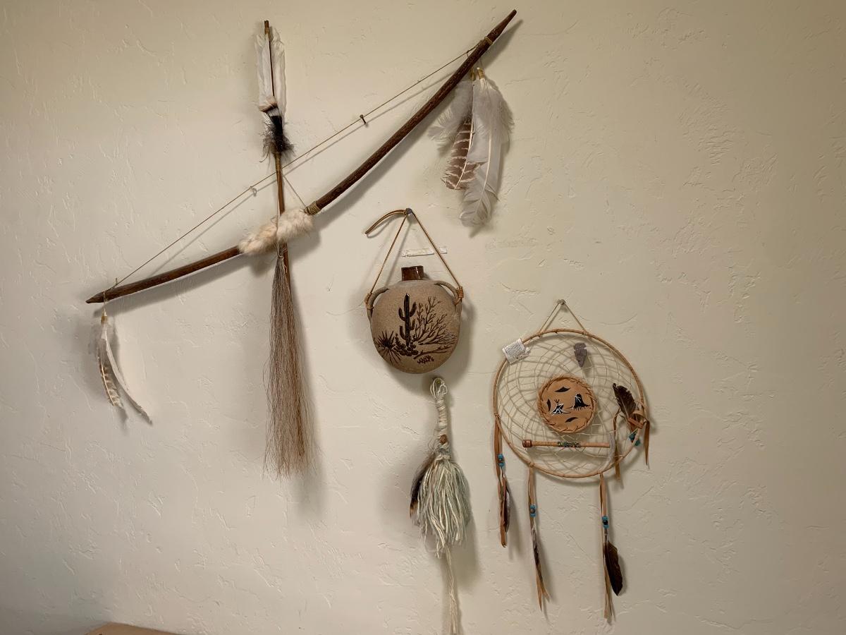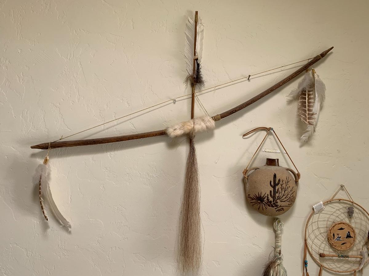 Native American carved bow with horsehair tassels and feathers. One dream catcher with hand painted teepee and a stoneware wall pocket water vessel with saguaro. All pieces in good condition just dusty