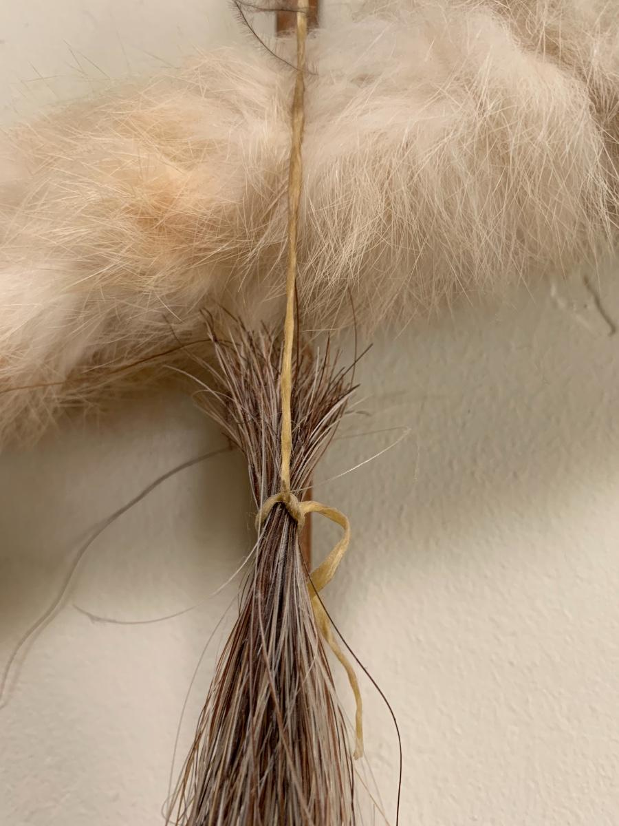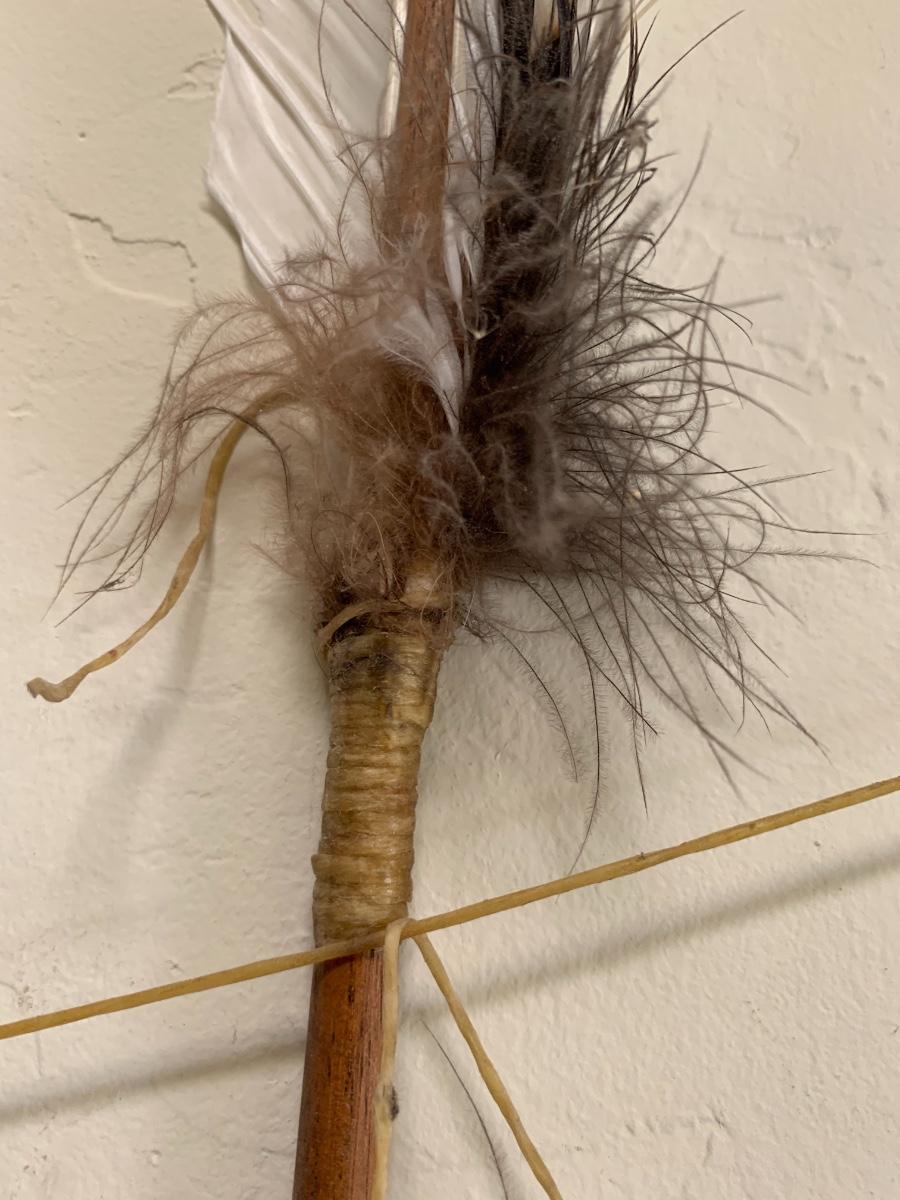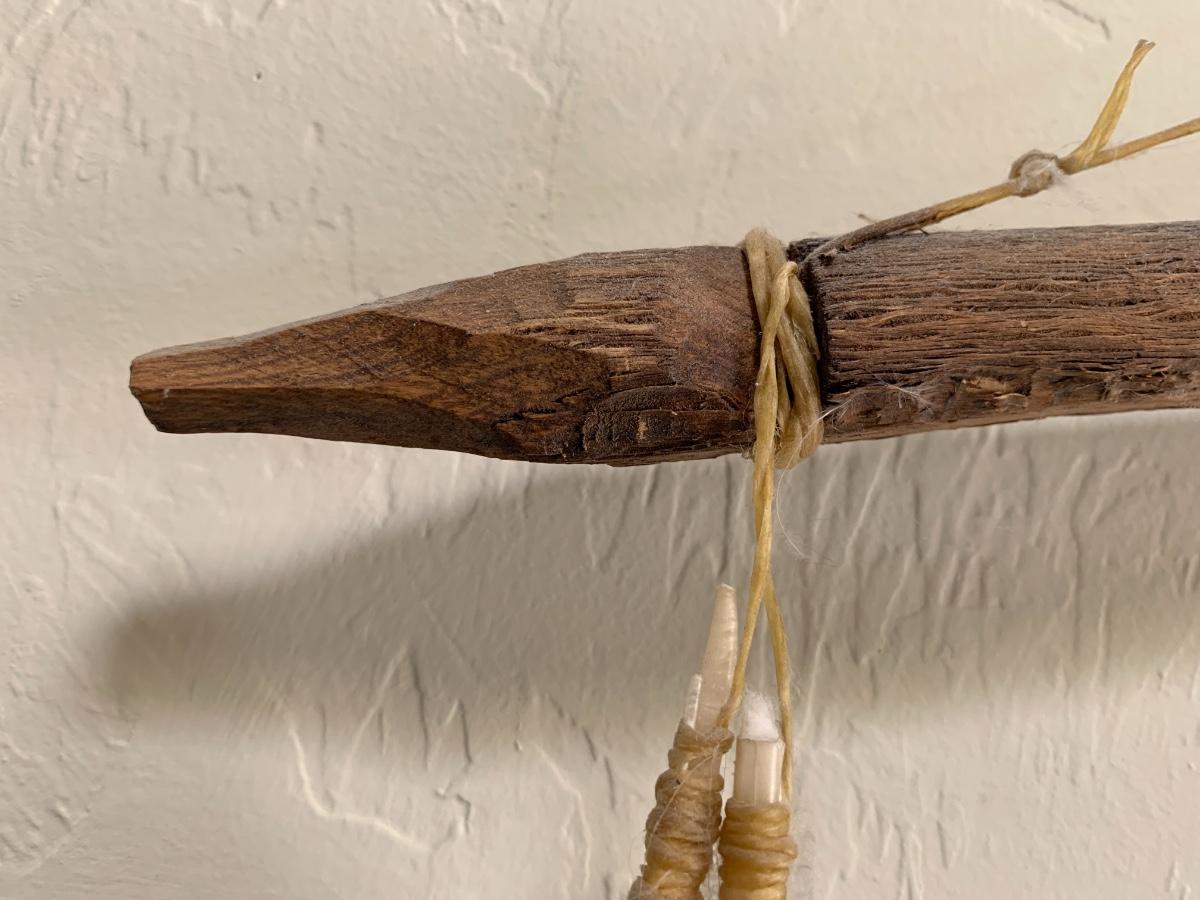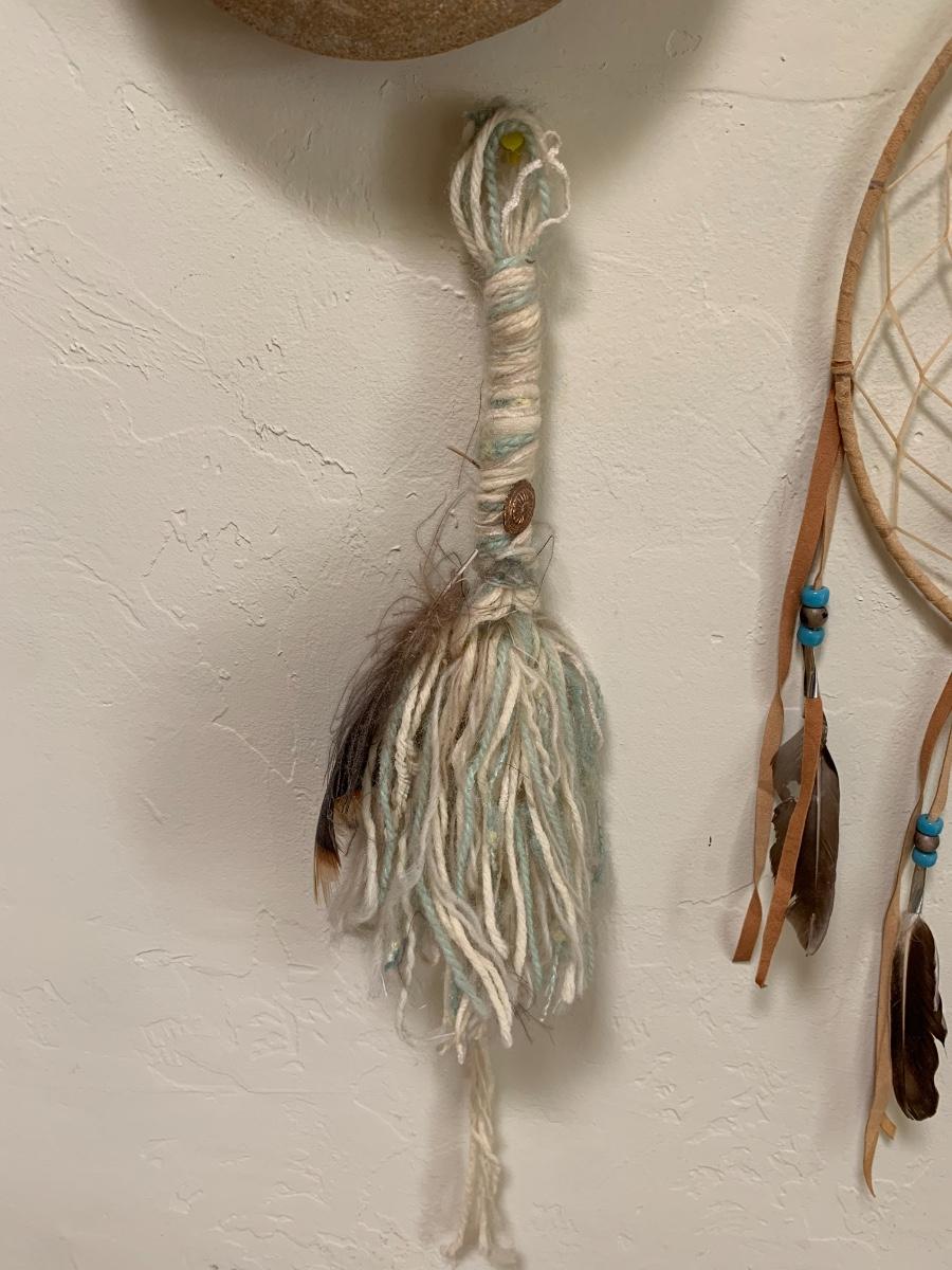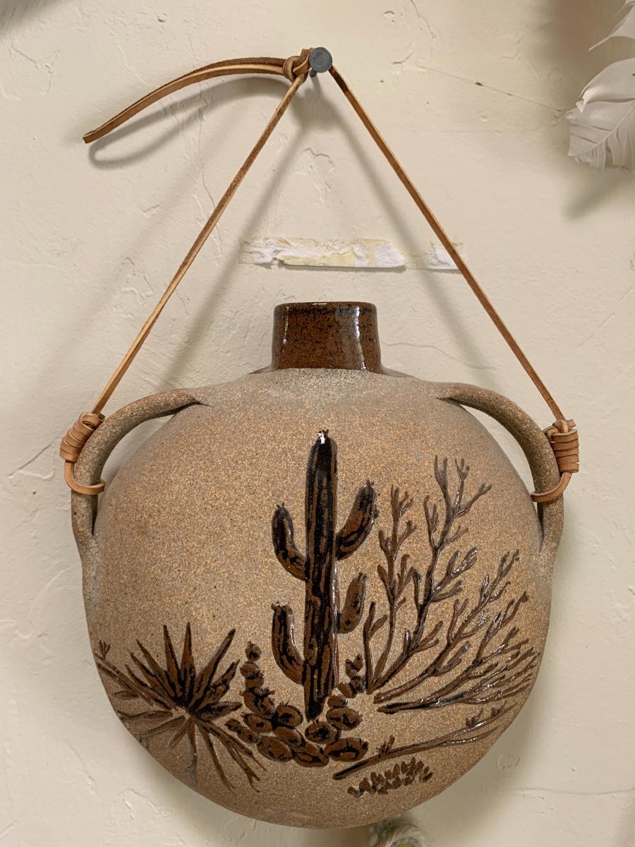 Native American carved bow with horsehair tassels and feathers. One dream catcher with hand painted teepee and a stoneware wall pocket water vessel with saguaro. All pieces in good condition just dusty