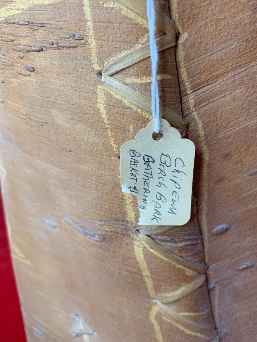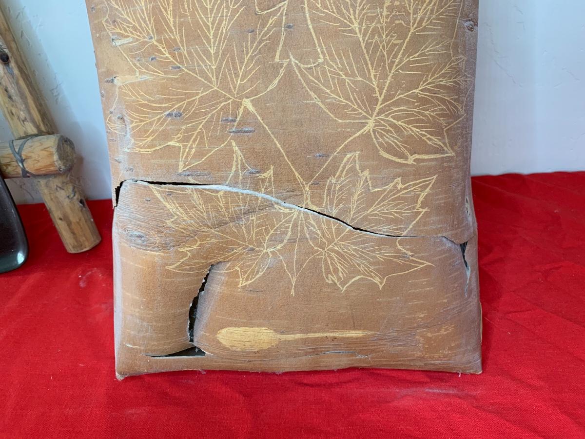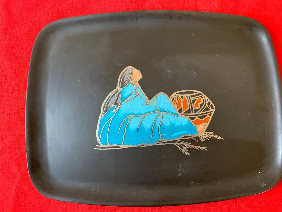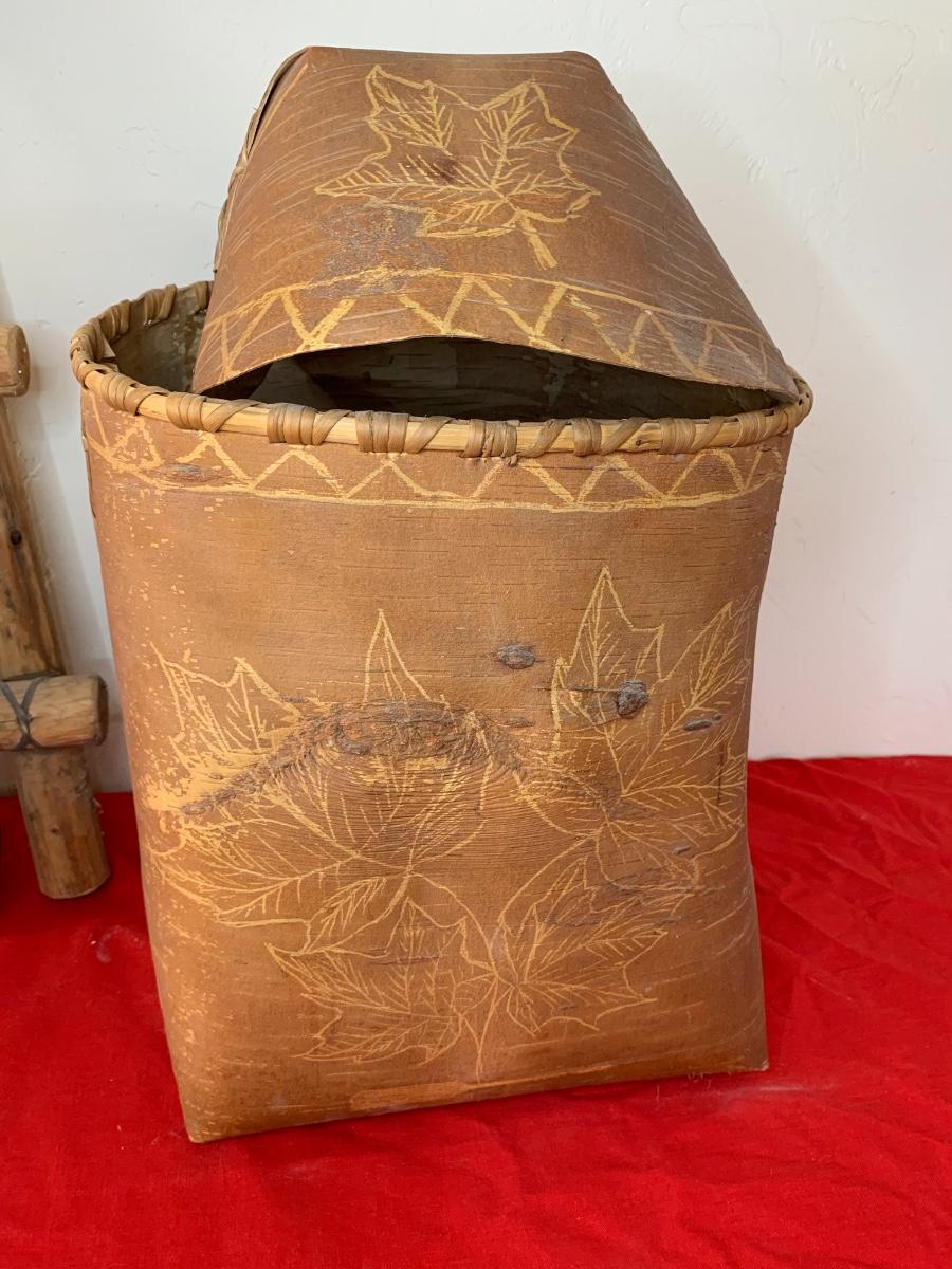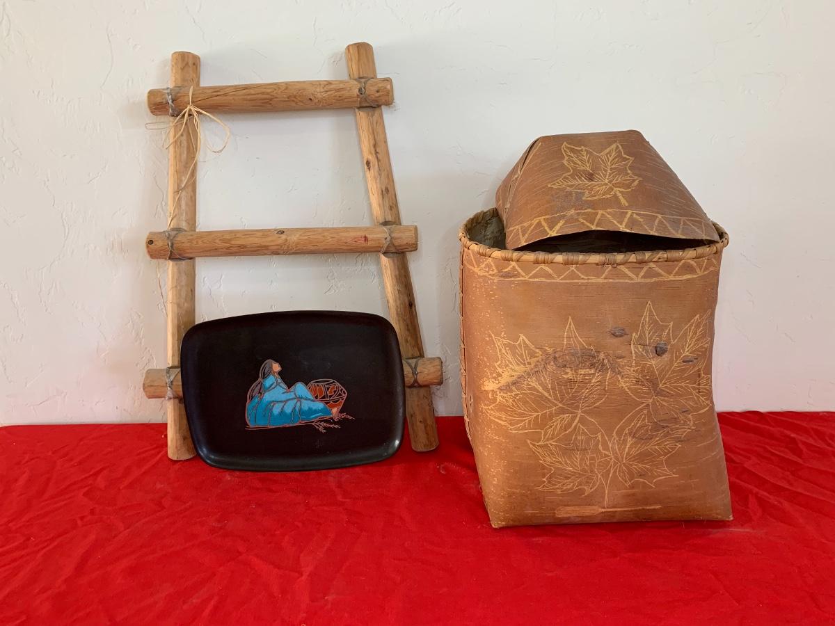 Native American decor including one small kiva ladder, one Chippewa birch bark gathering basket and a mid century couroc platter with native woman inlay. Tray and ladder in good condition, the basket has some damage and ripping to the back and bowing to the lid.