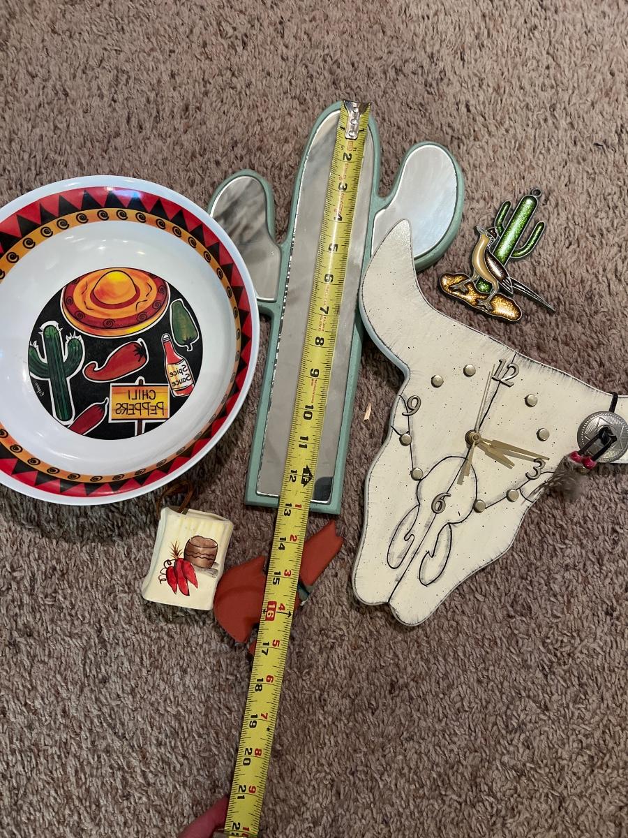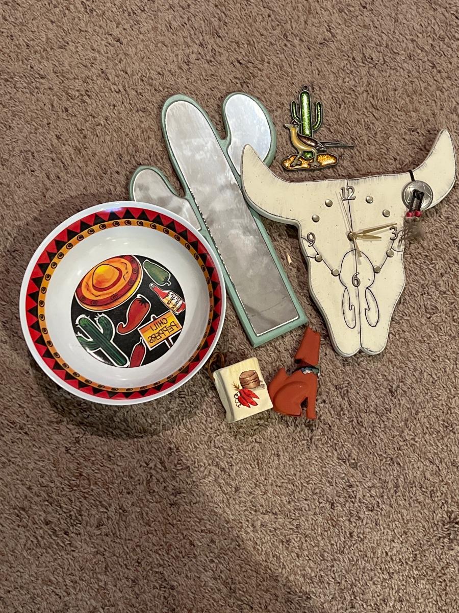 Southwestern decor. Knick knacks, cactus mirror. Clock and bowl