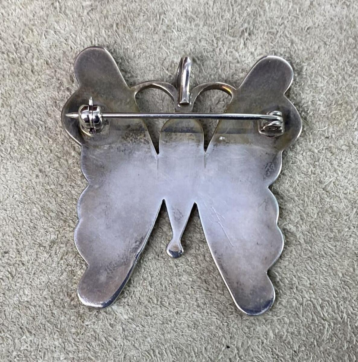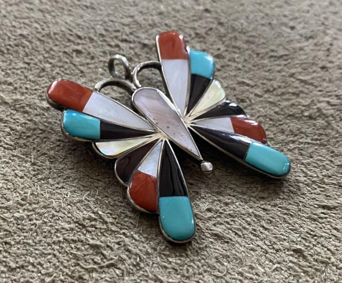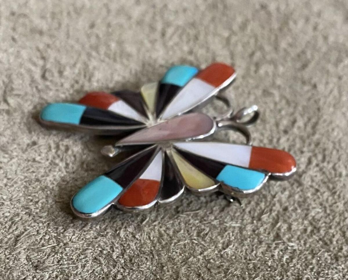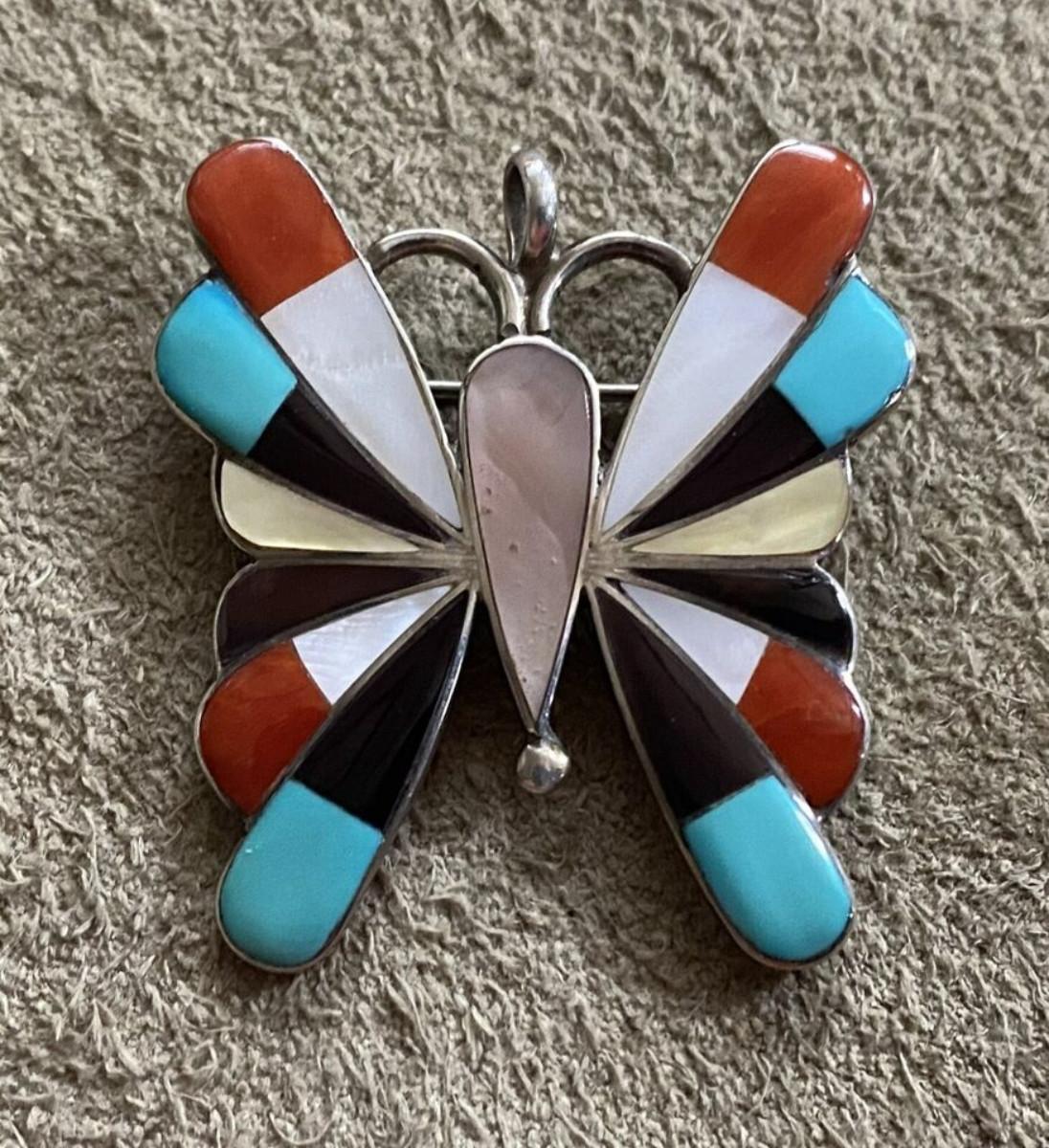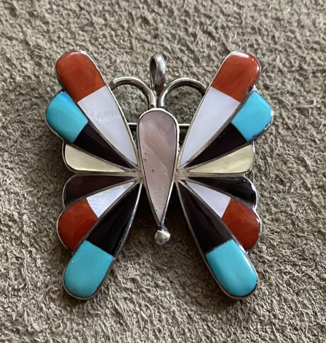 southwestern Inlaid Coral Onyx Turquoise MOP Silver Butterfly Pin Pendant