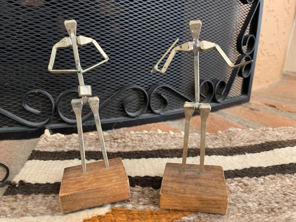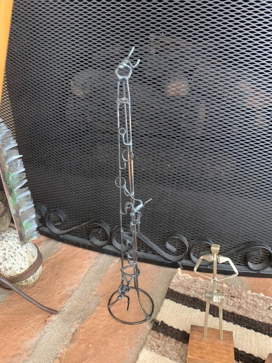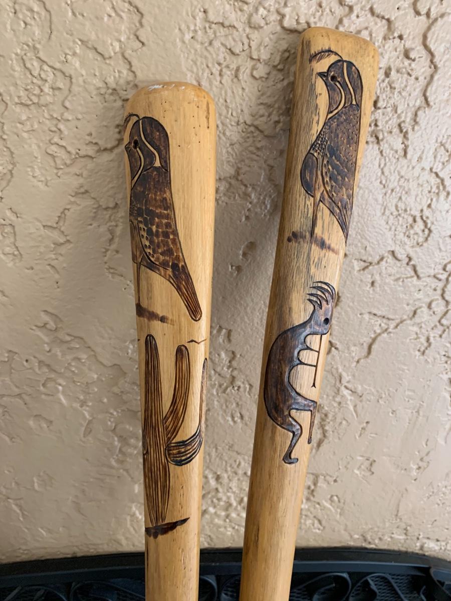 Assorted southwestern decor includes Native American wool woven rug, iron and stone figurines, one fireplace broom and one pair of handmade saguaro rib walking sticks with pyrography desert wildlife all in excellent condition. (Rug measurements, 34 inches X 17 inches) (walking sticks, 62 inches in height)
