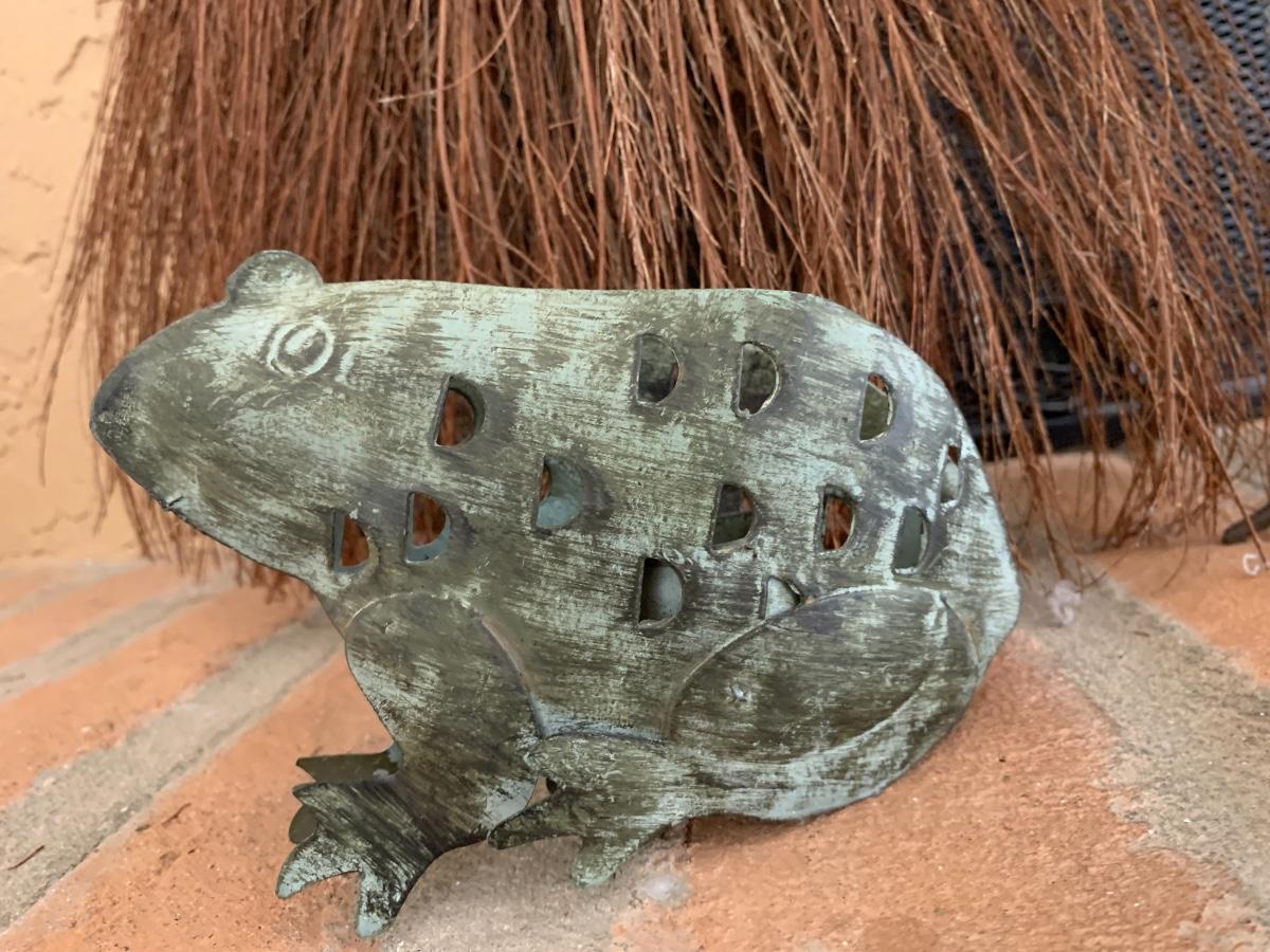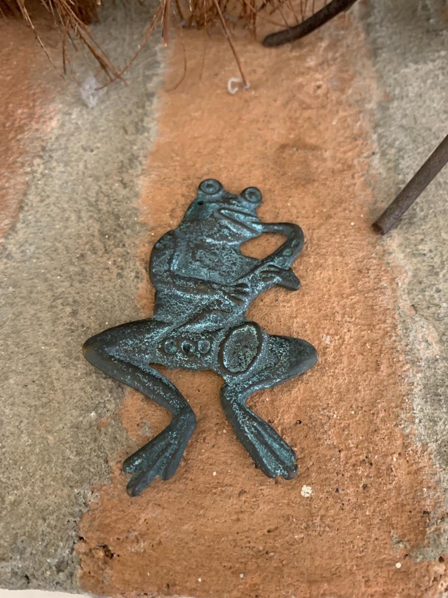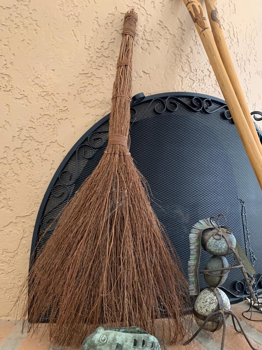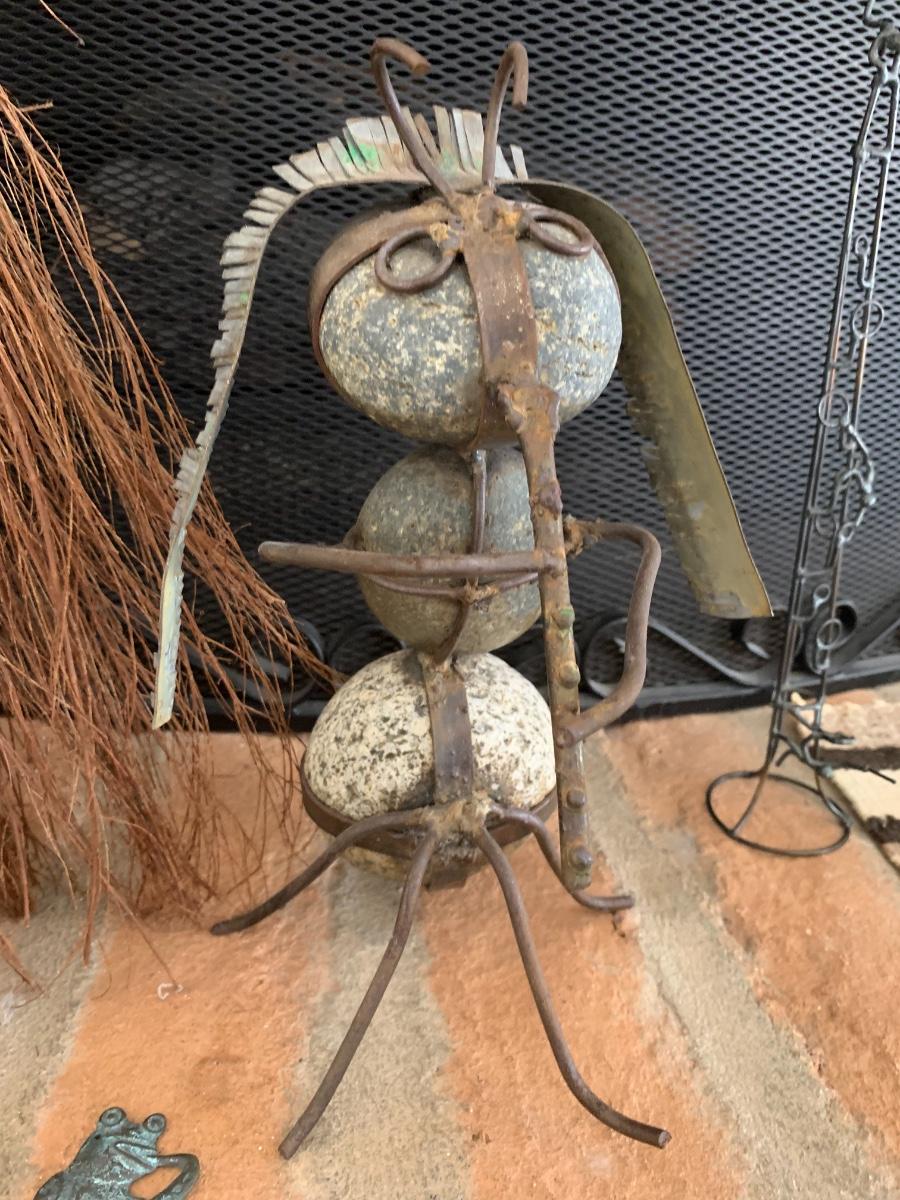 Assorted southwestern decor includes Native American wool woven rug, iron and stone figurines, one fireplace broom and one pair of handmade saguaro rib walking sticks with pyrography desert wildlife all in excellent condition. (Rug measurements, 34 inches X 17 inches) (walking sticks, 62 inches in height)
