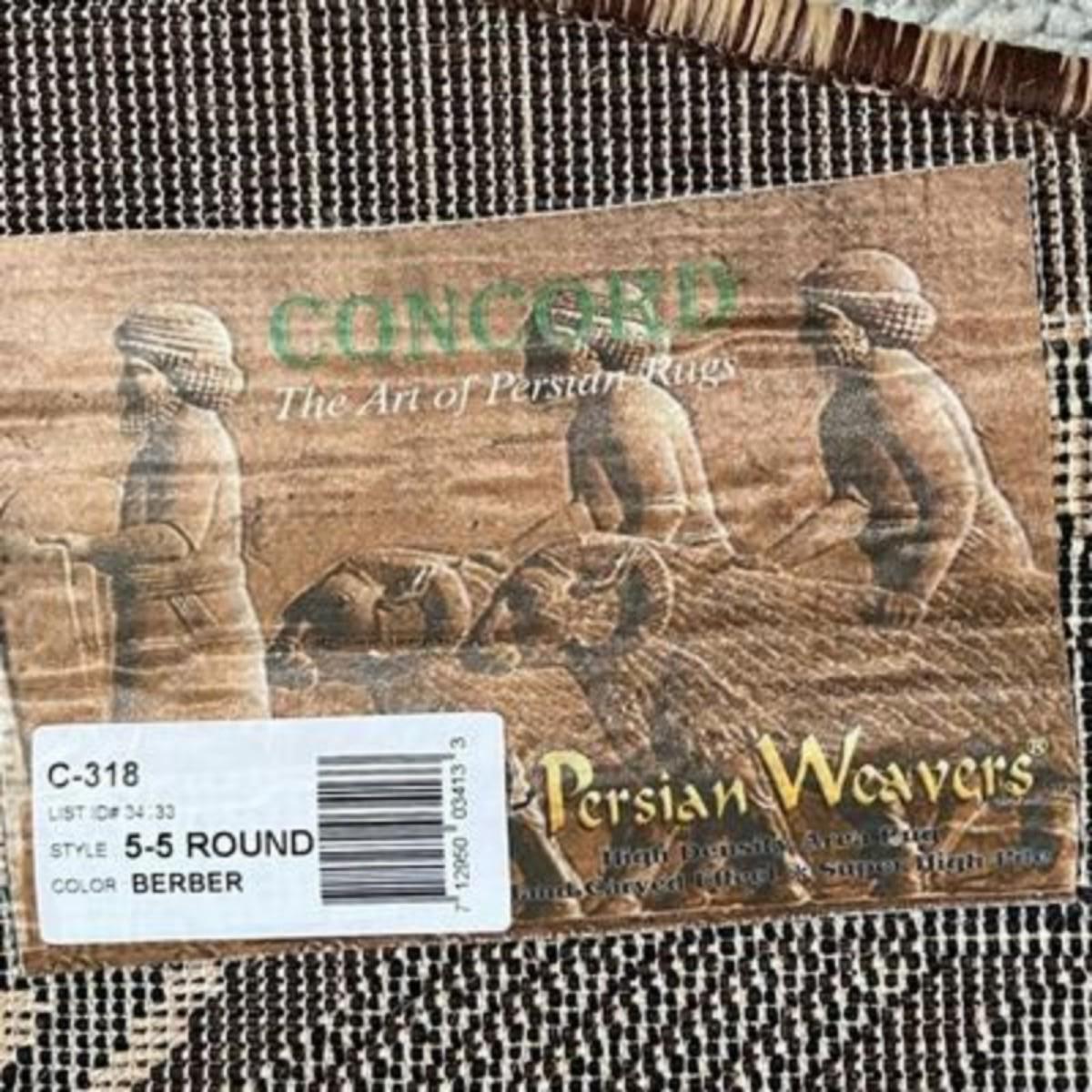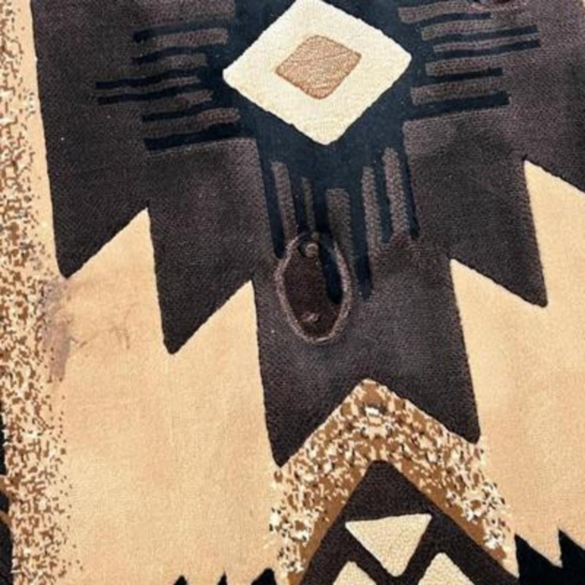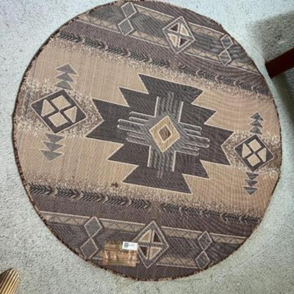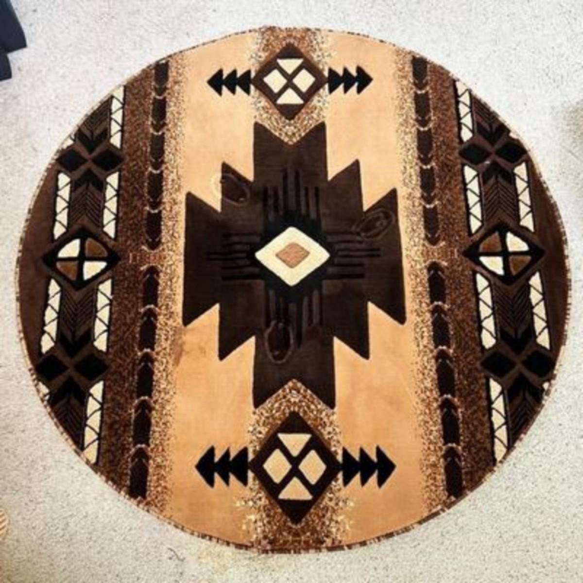 Round Brown & Tan Southwestern Style Rug. In good used condition. About 59" diameter. Table legs have left imprints, not sure if/how well they will come up.
