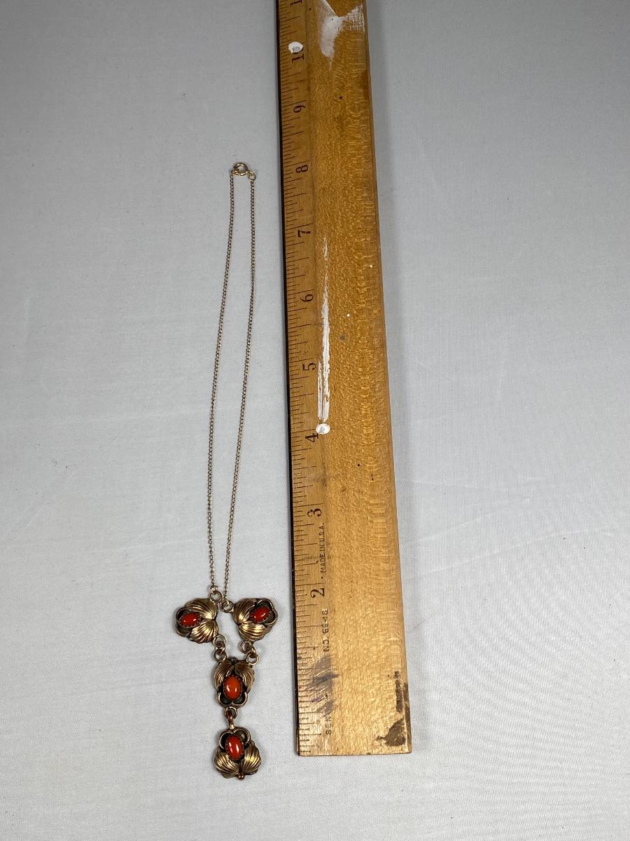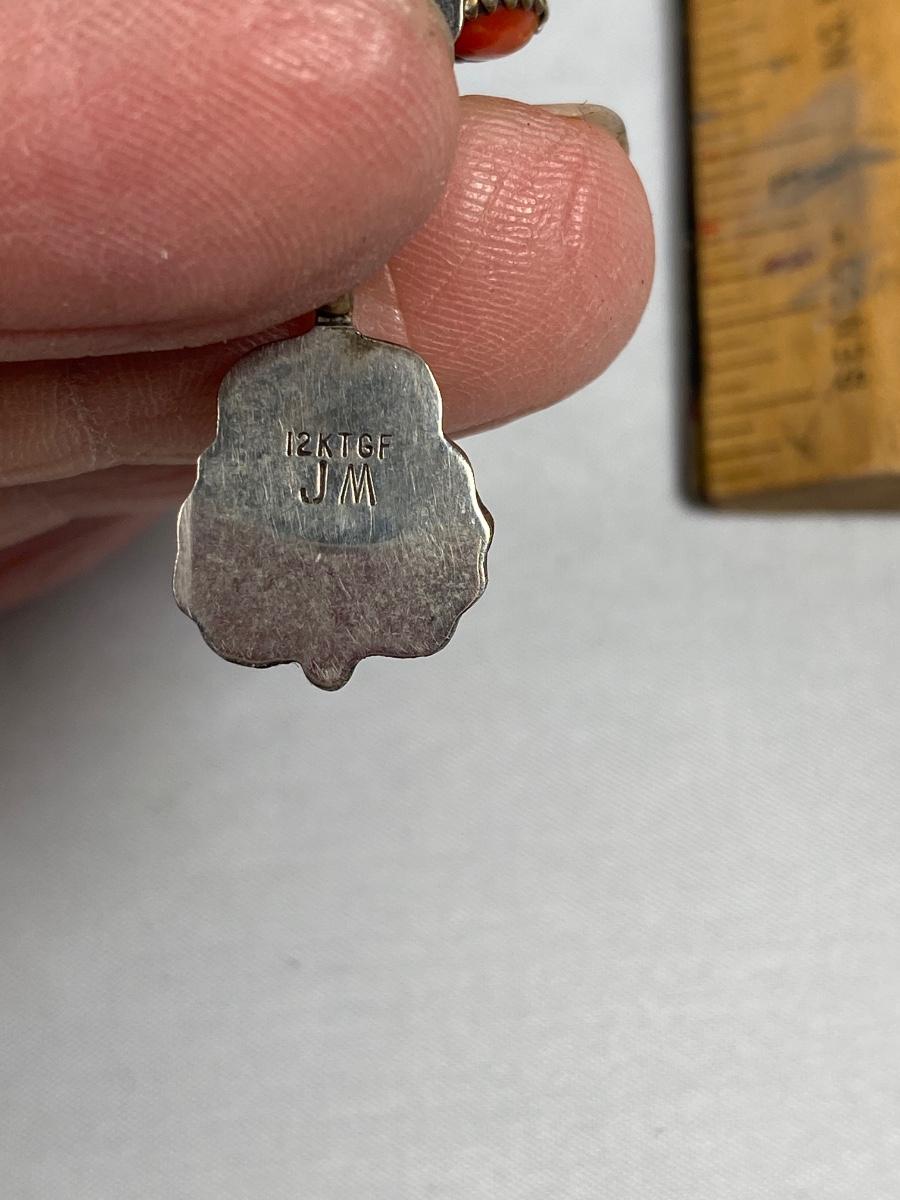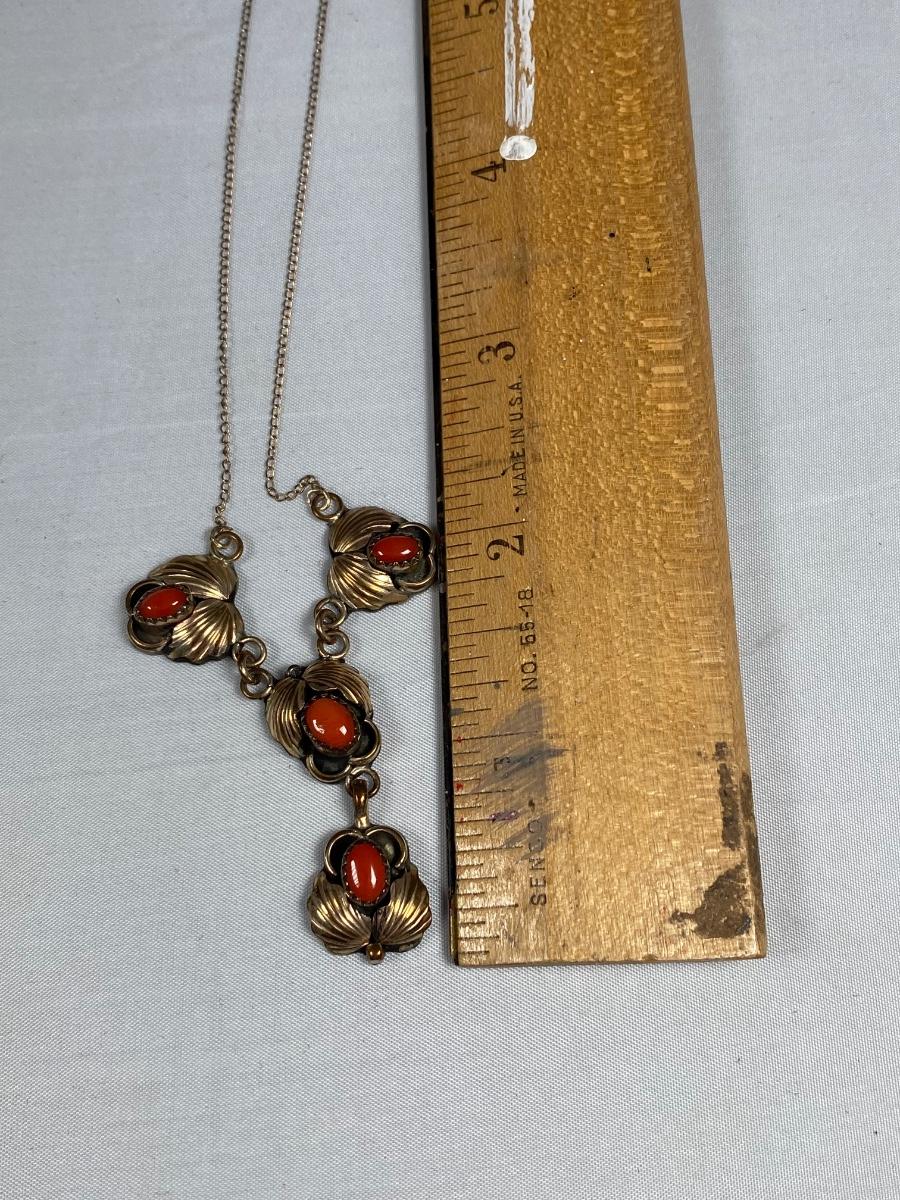 Beautiful red coral bracelet & necklace. Bracelet is multistrand small bead with sterling clasp. Necklace is 12kGF, stamped 12KTGF JM on the back. JM would be the artist initials. Dainty chain with Y shape medallion pieces.