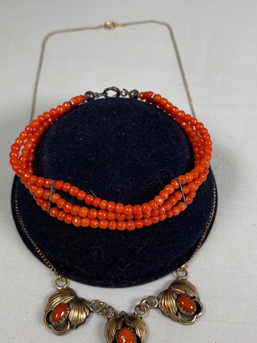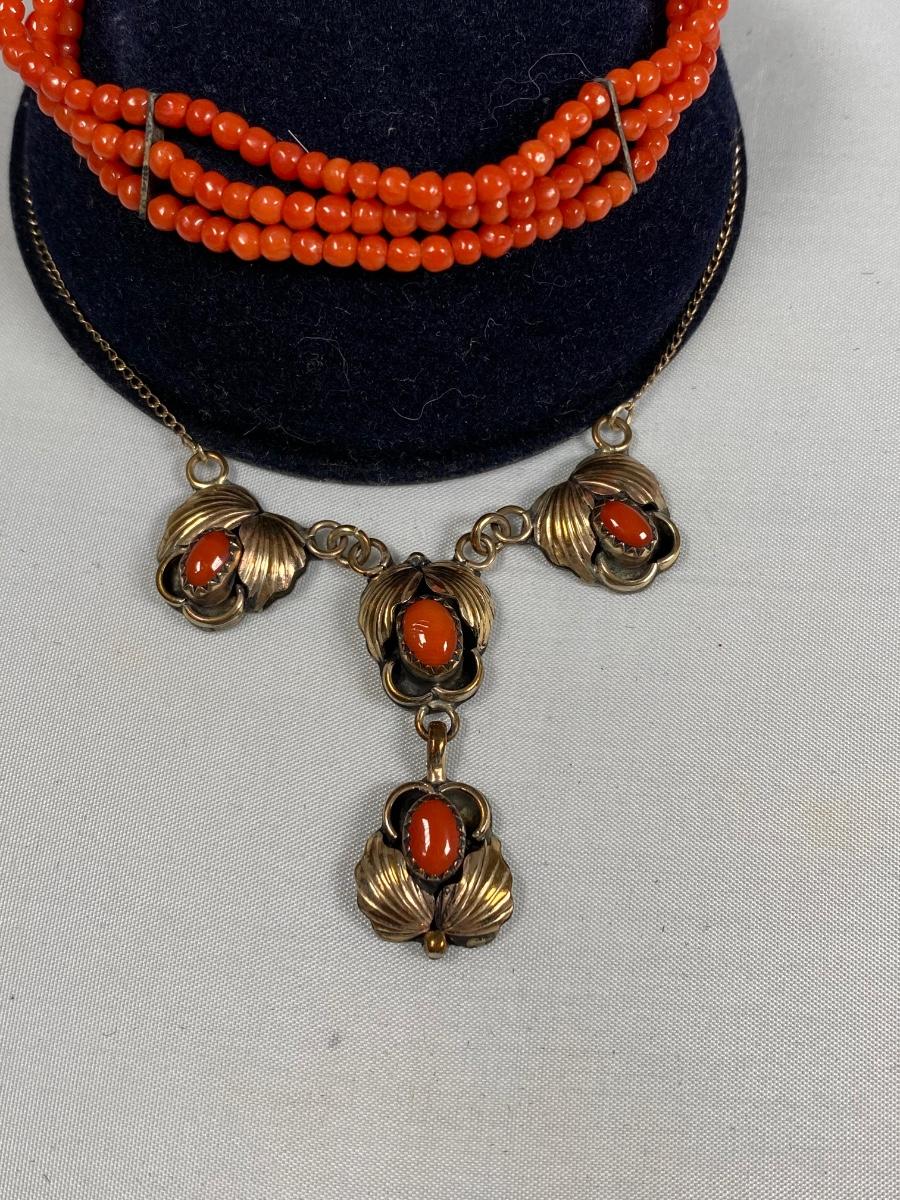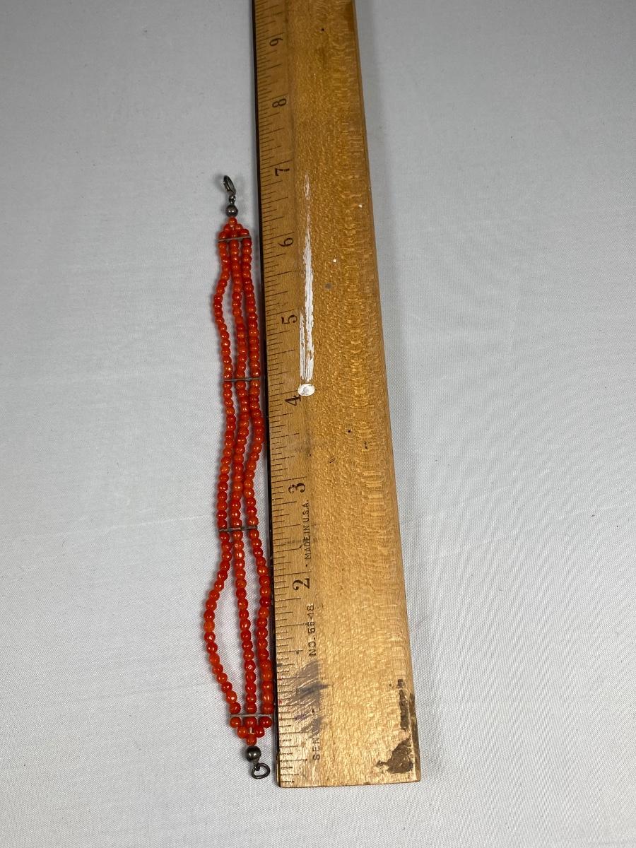 Beautiful red coral bracelet & necklace. Bracelet is multistrand small bead with sterling clasp. Necklace is 12kGF, stamped 12KTGF JM on the back. JM would be the artist initials. Dainty chain with Y shape medallion pieces.