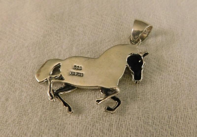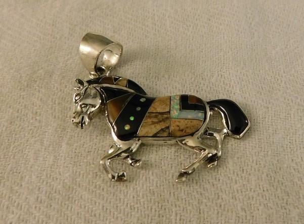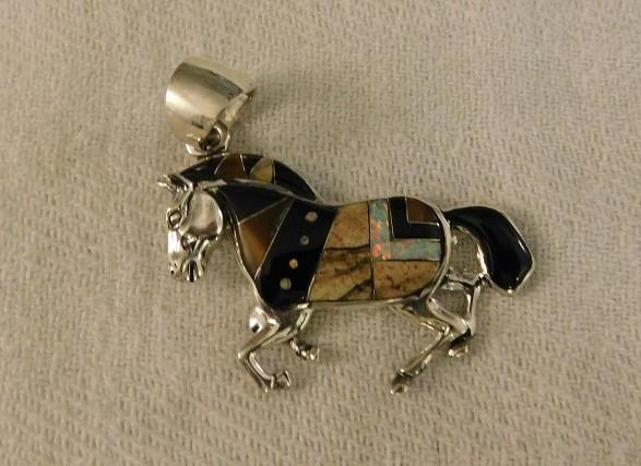 Southwestern Style Horse Pendent Multi Stone Inlay including painted wood jasper, black onyx, Tigers eye, and faux opal set in sterling silver.