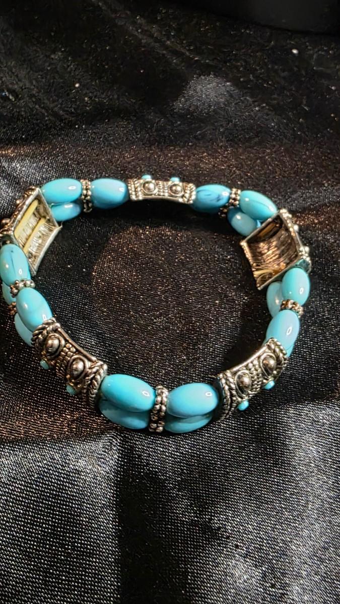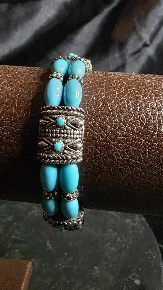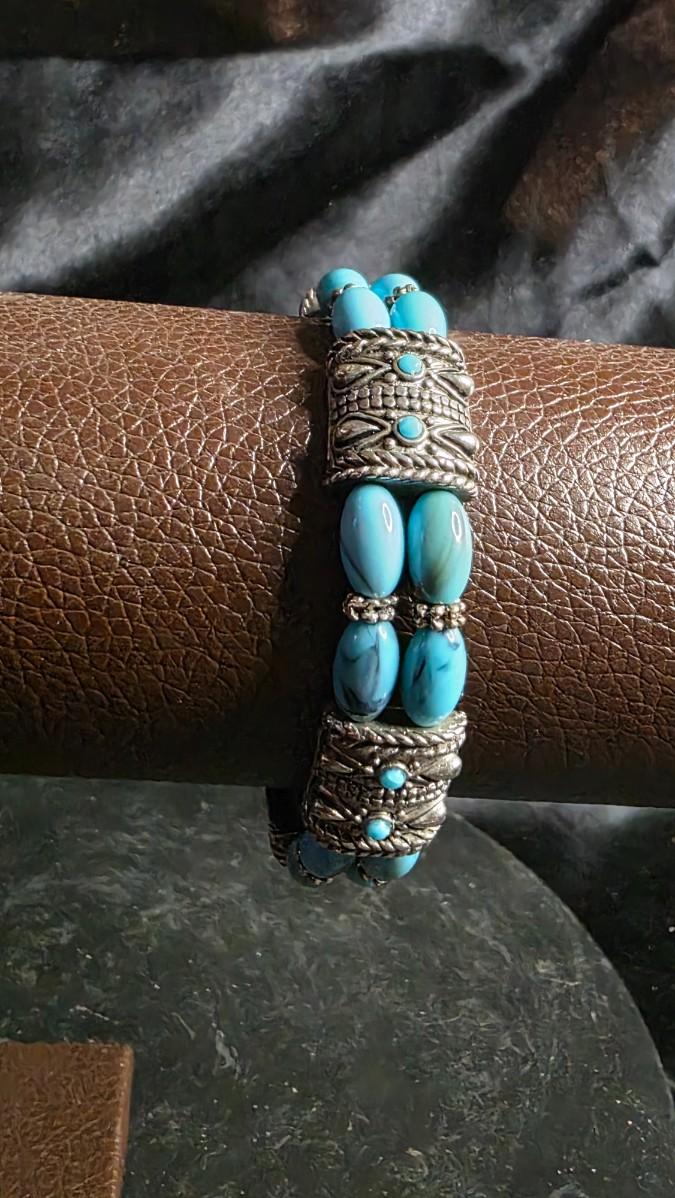 Elevate your wrist with a flourish of bold Southwestern charm. This striking double-strand bracelet pairs smooth turquoise-tone oval beads with ornate antiqued silver panels, creating a look that’s both earthy and luxuriously refined. Each segment is framed with braided metalwork, raised detailing, and miniature turquoise accents, lending the piece an artisanal depth reminiscent of handcrafted desert jewelry.
