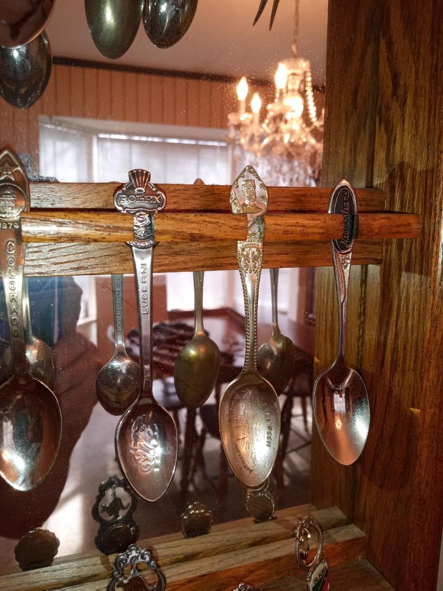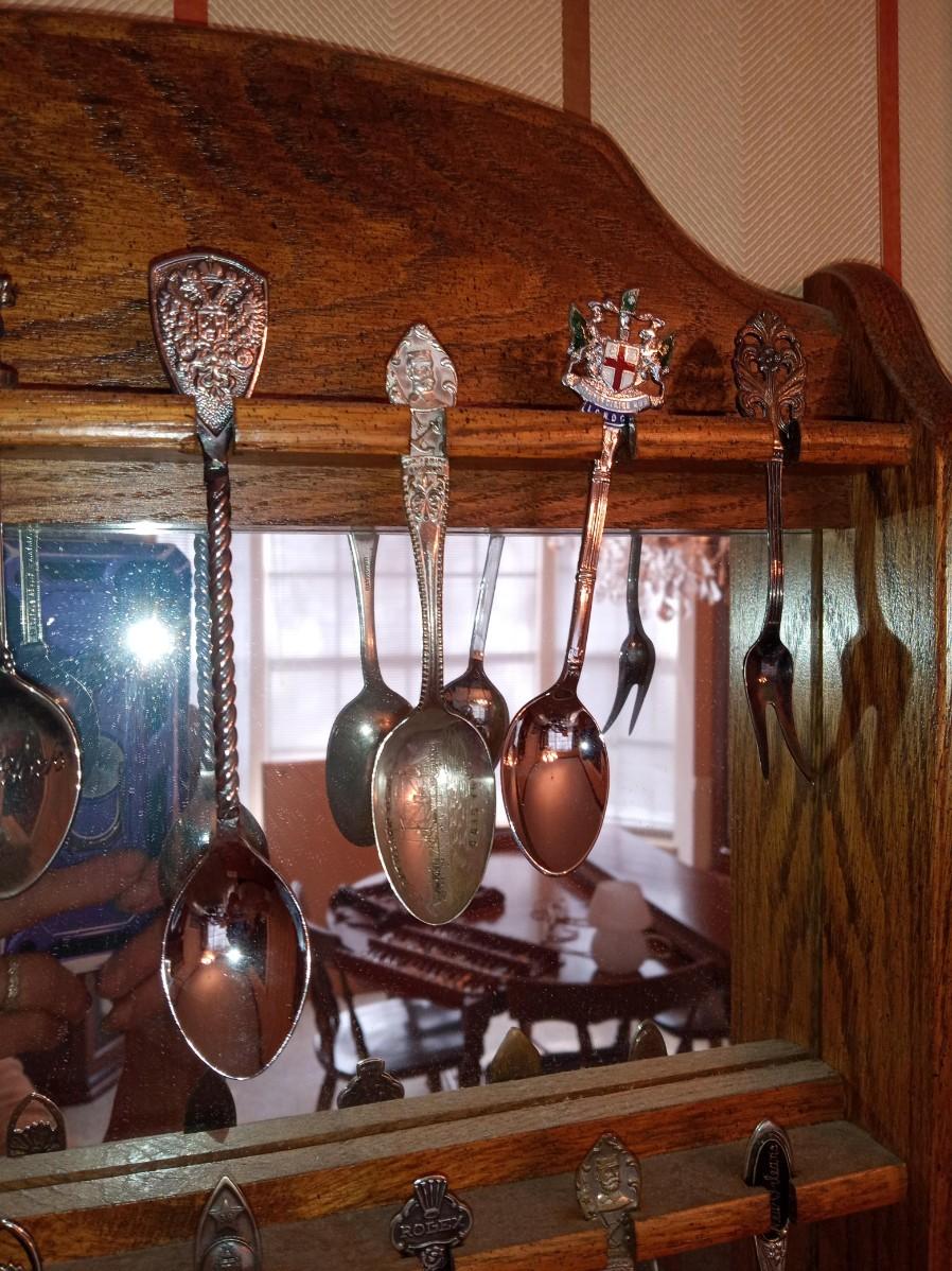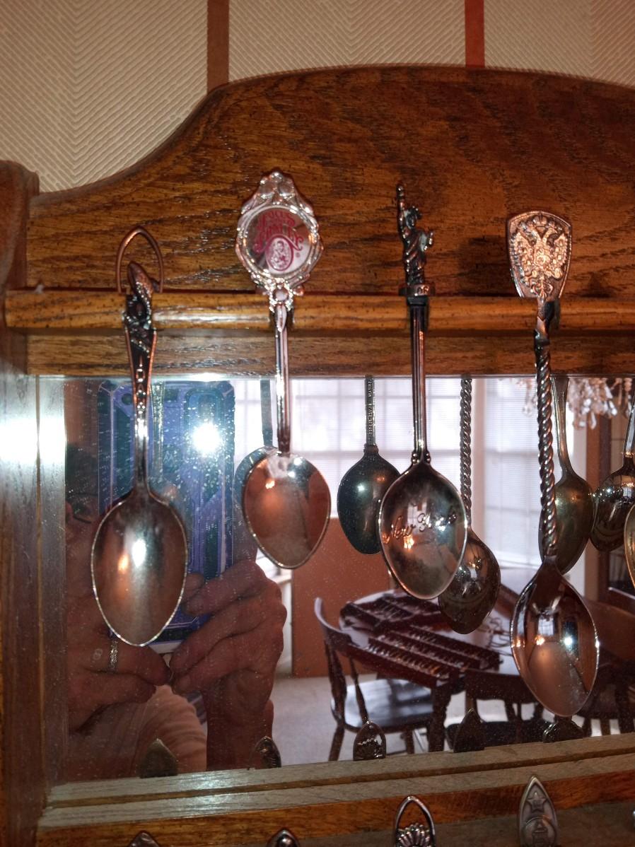 SOUVENIER SPOONS AND A MIRRORED HOLDER