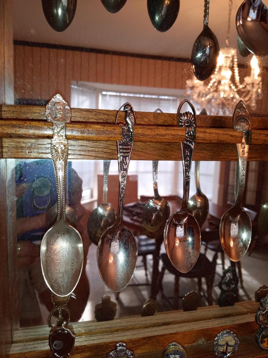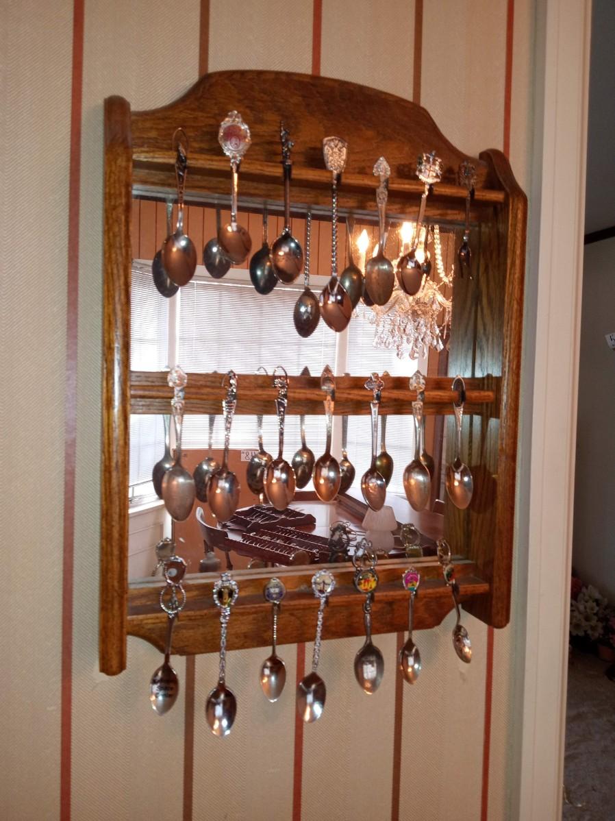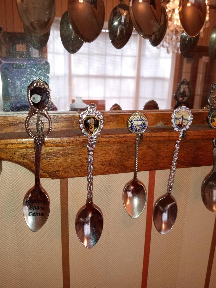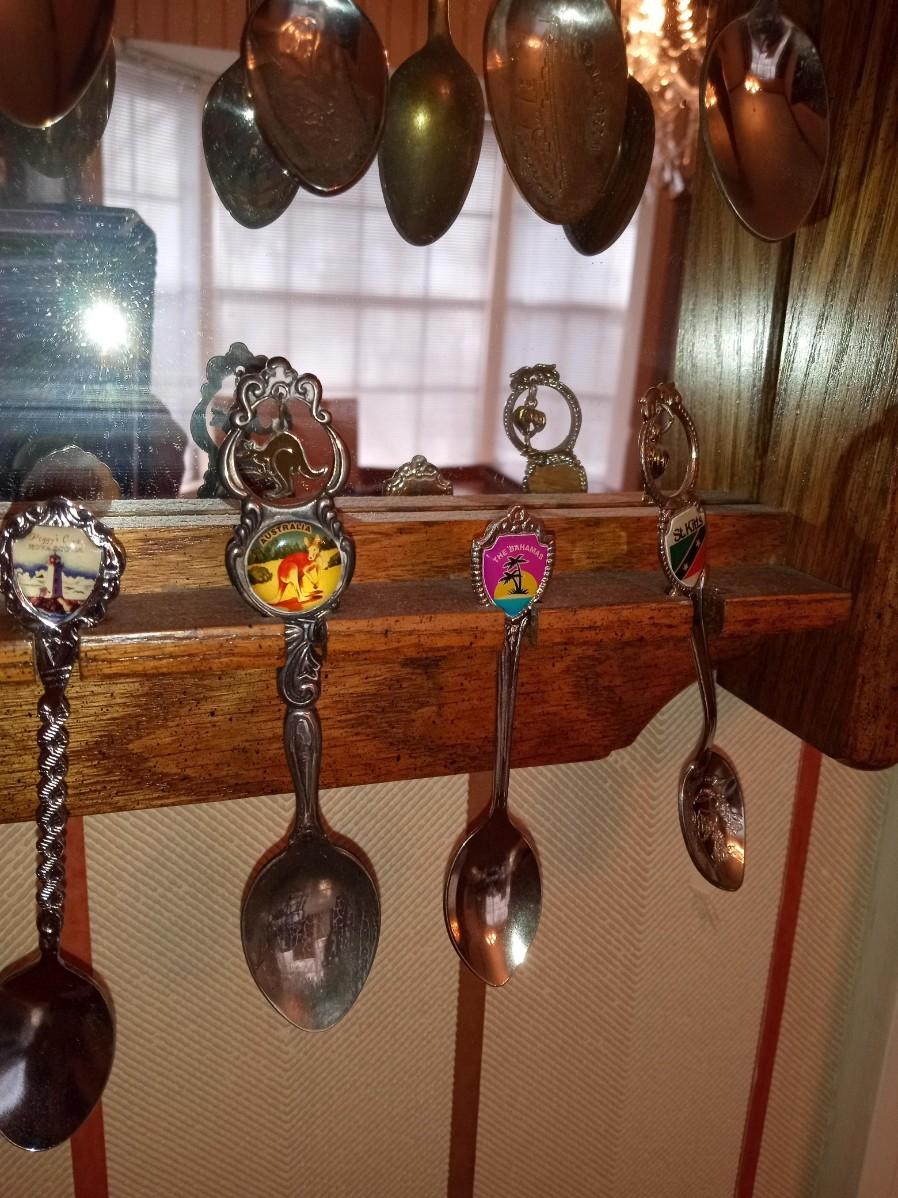 SOUVENIER SPOONS AND A MIRRORED HOLDER