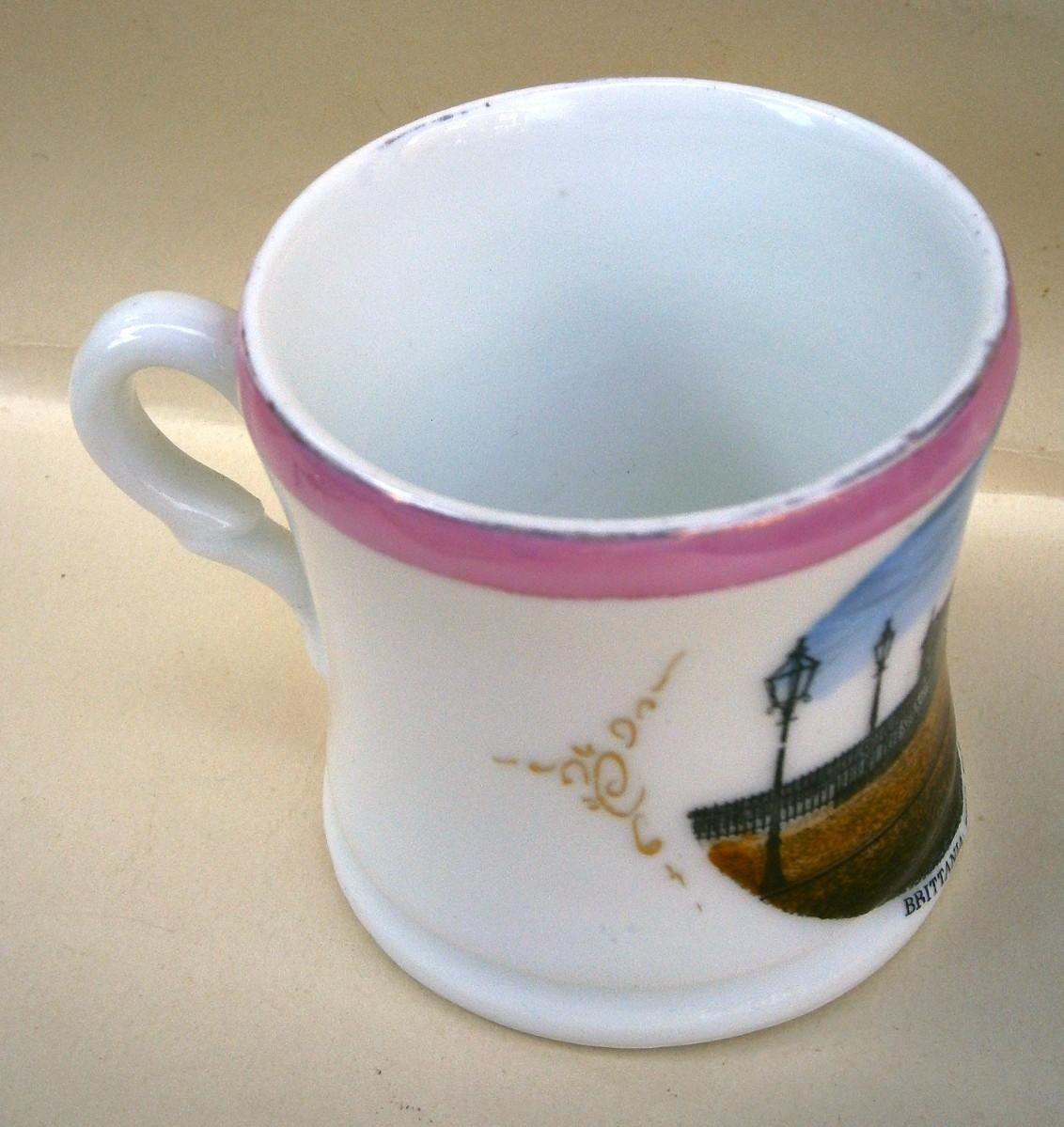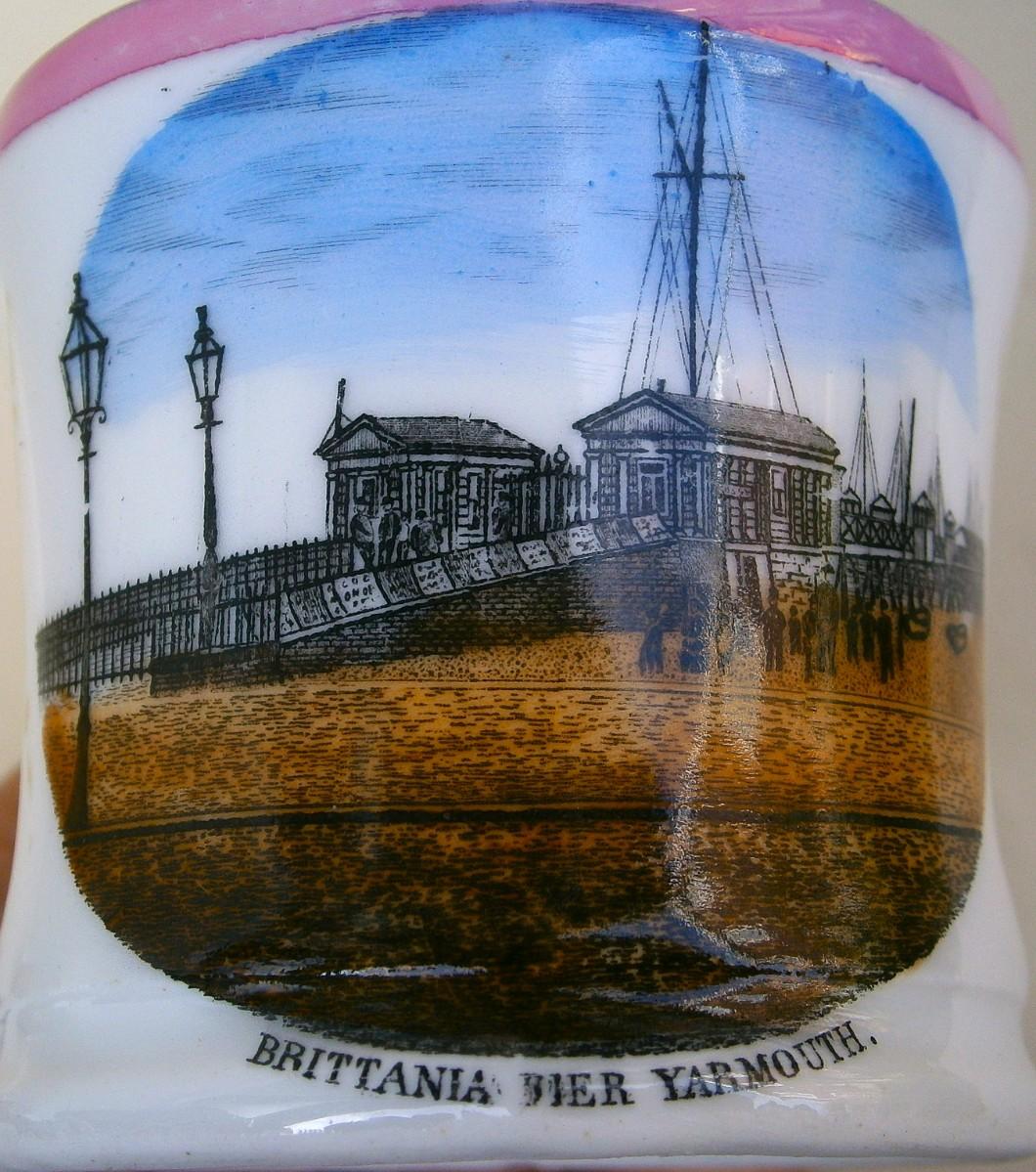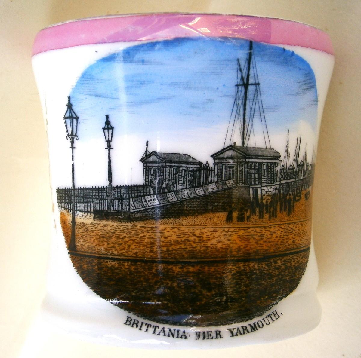Victorian Luster Ware Souvenir Cup from BRITTANIA PIER YARMOUTH England, 2 1/2 in. tall, porcelain.