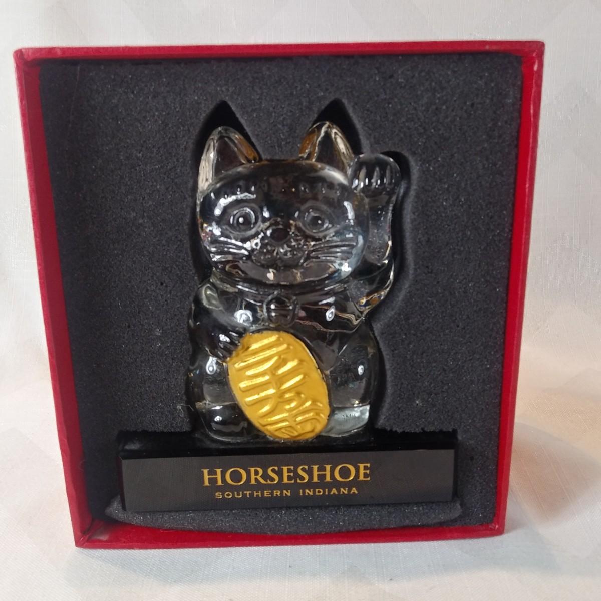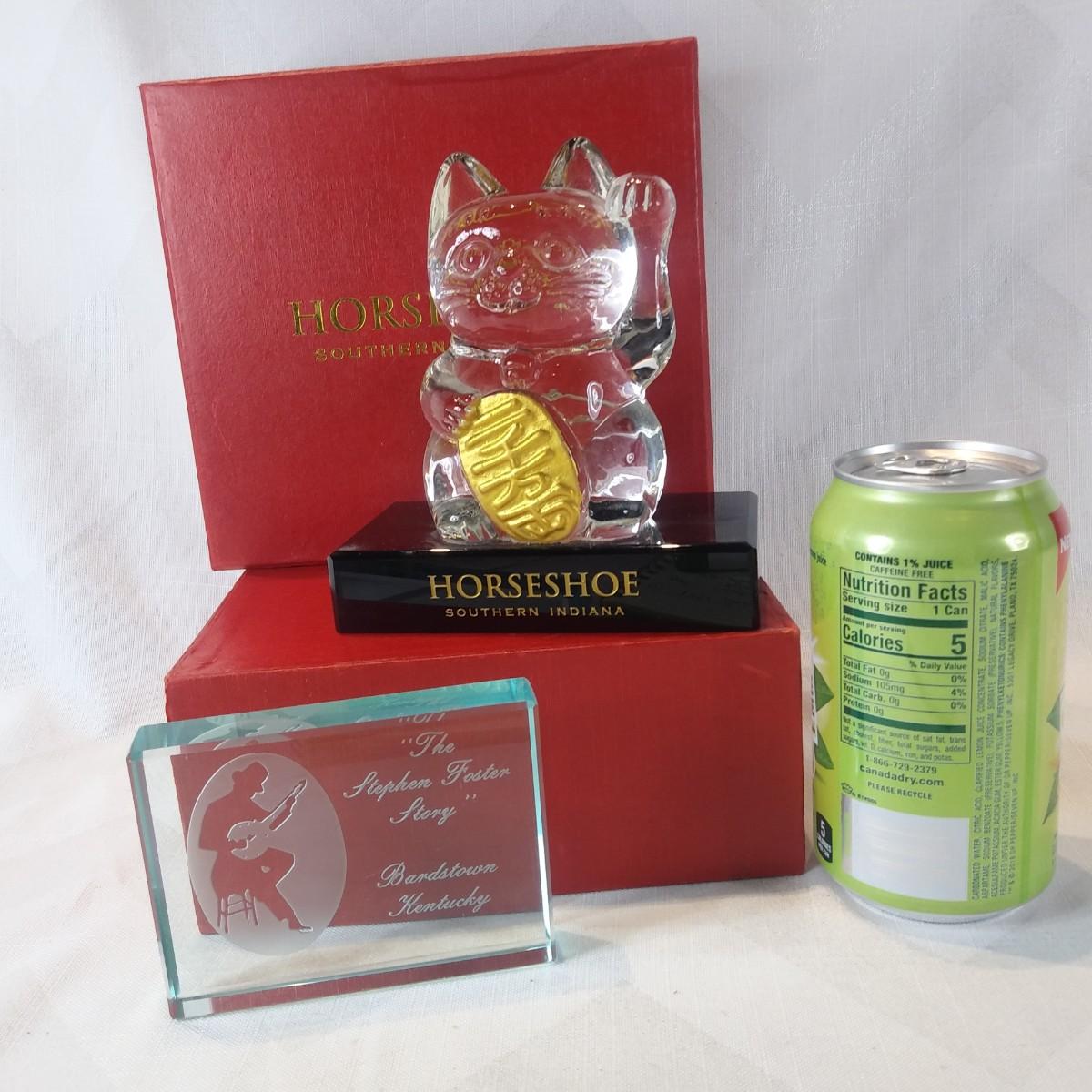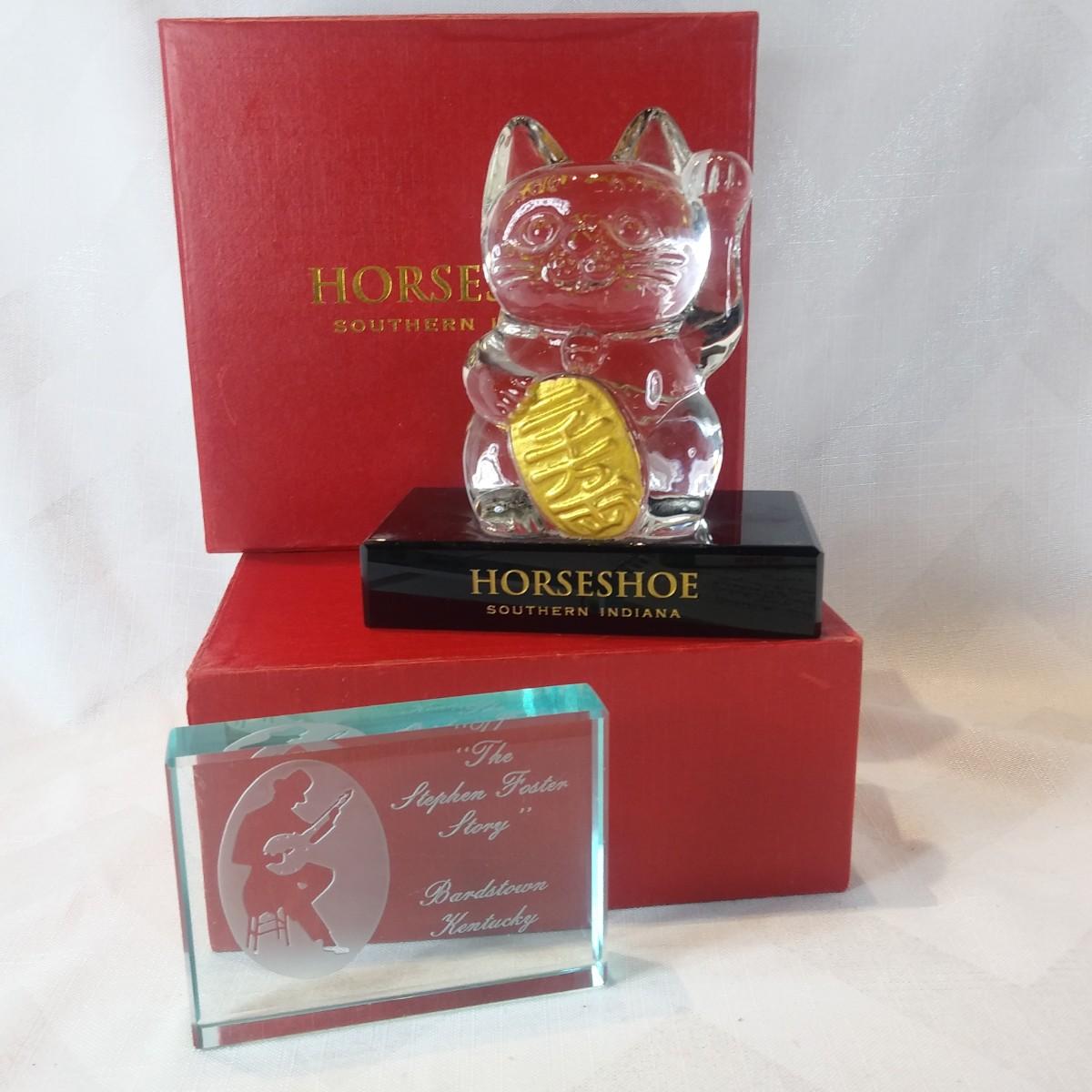 This auction lot is for two Souvenir Paperweights. The cat is a large and heavy paperweight - Issued by Horseshoe Casino - Southern Indiana, new in box. The other souvenir paperweight is from the Steven Foster Story which is produced each summer in Bardstown, KY. Both are in very good condition.