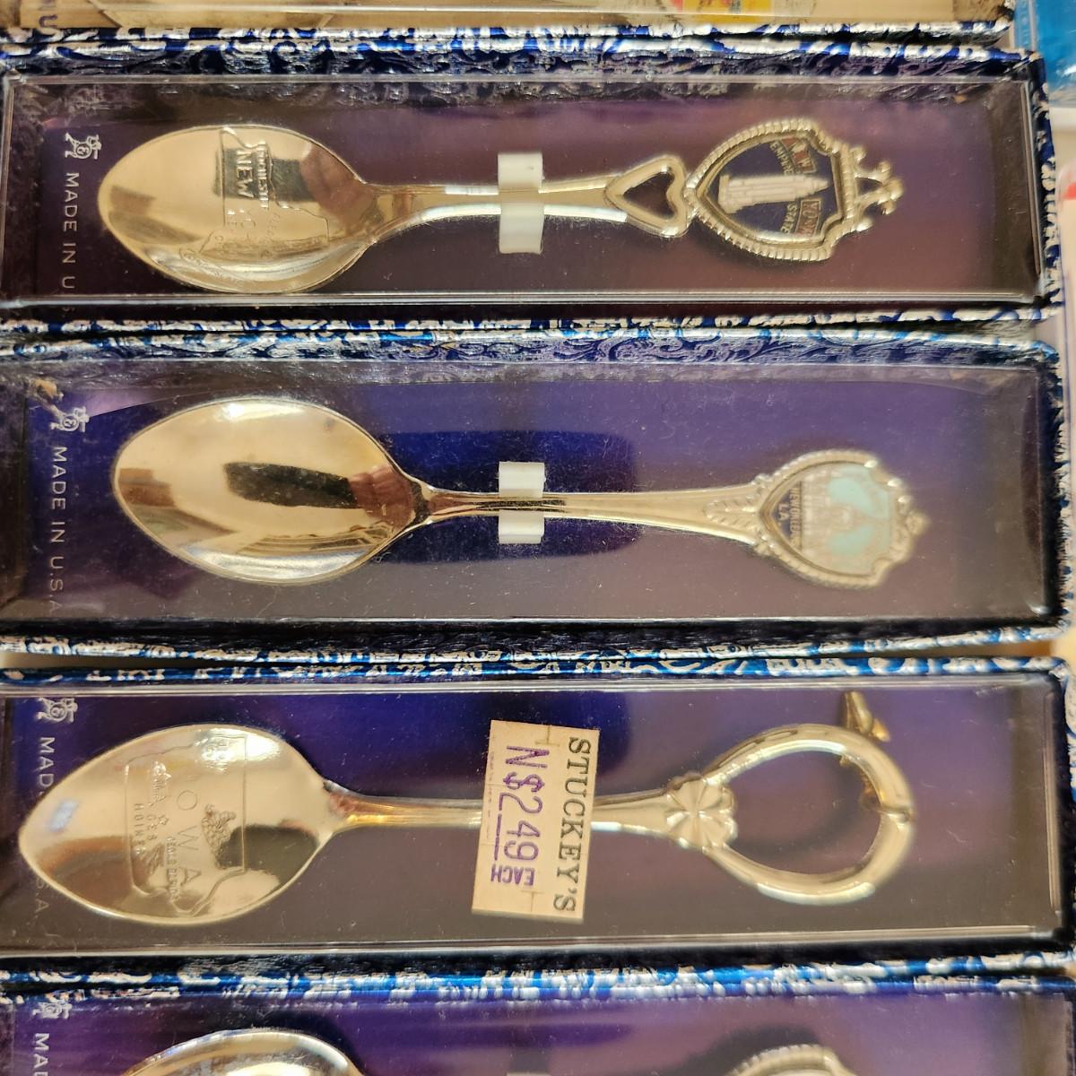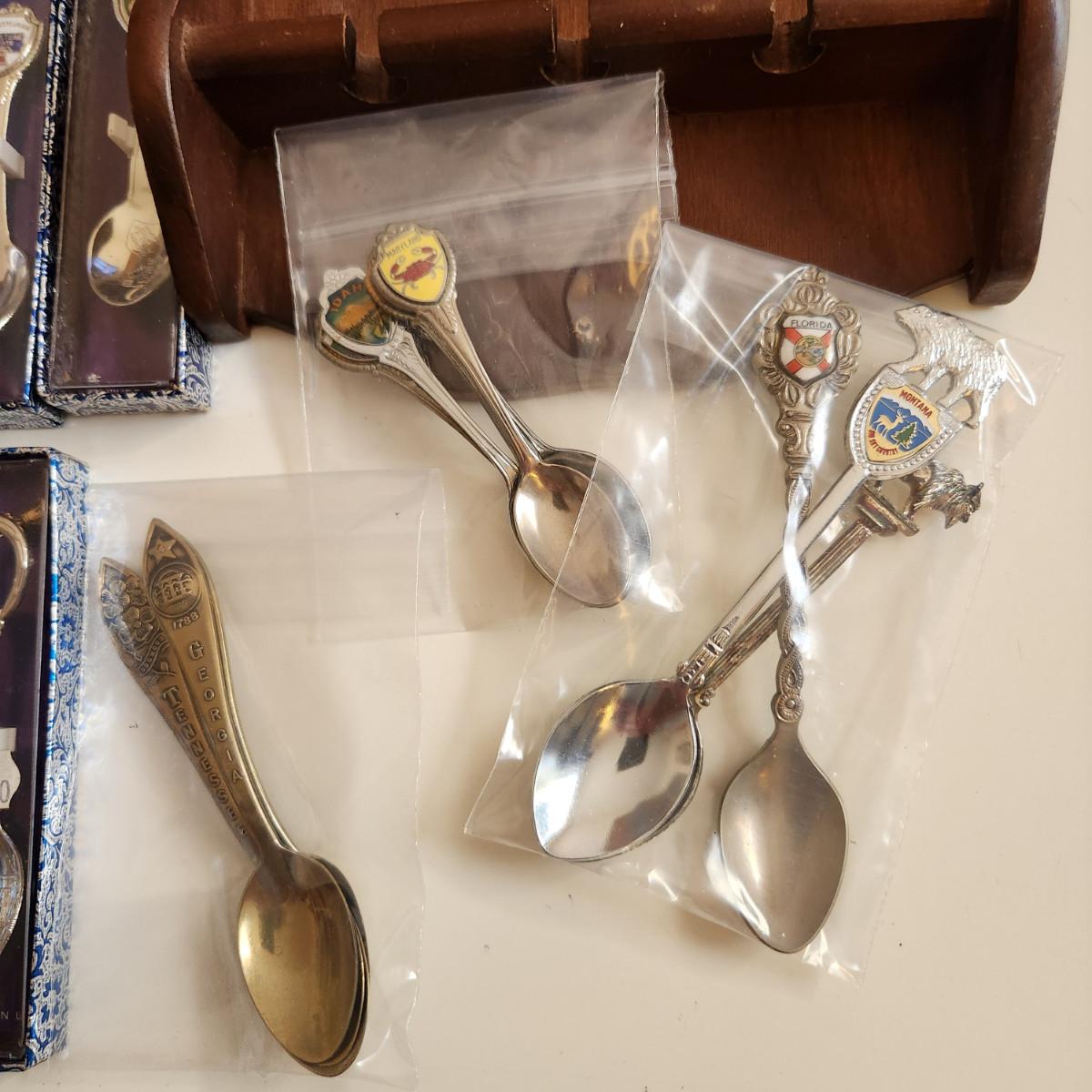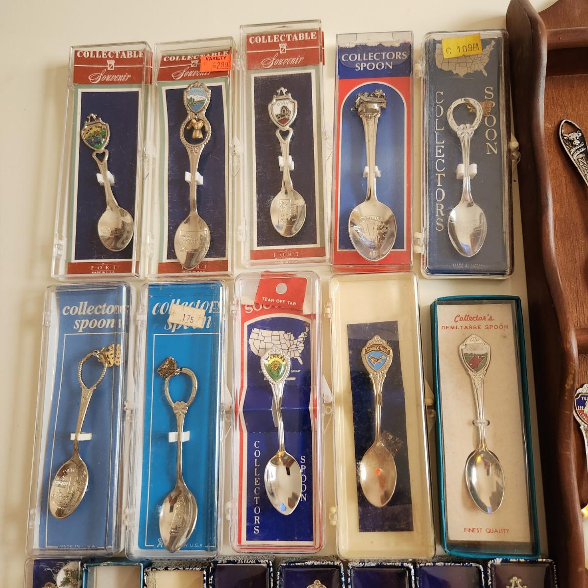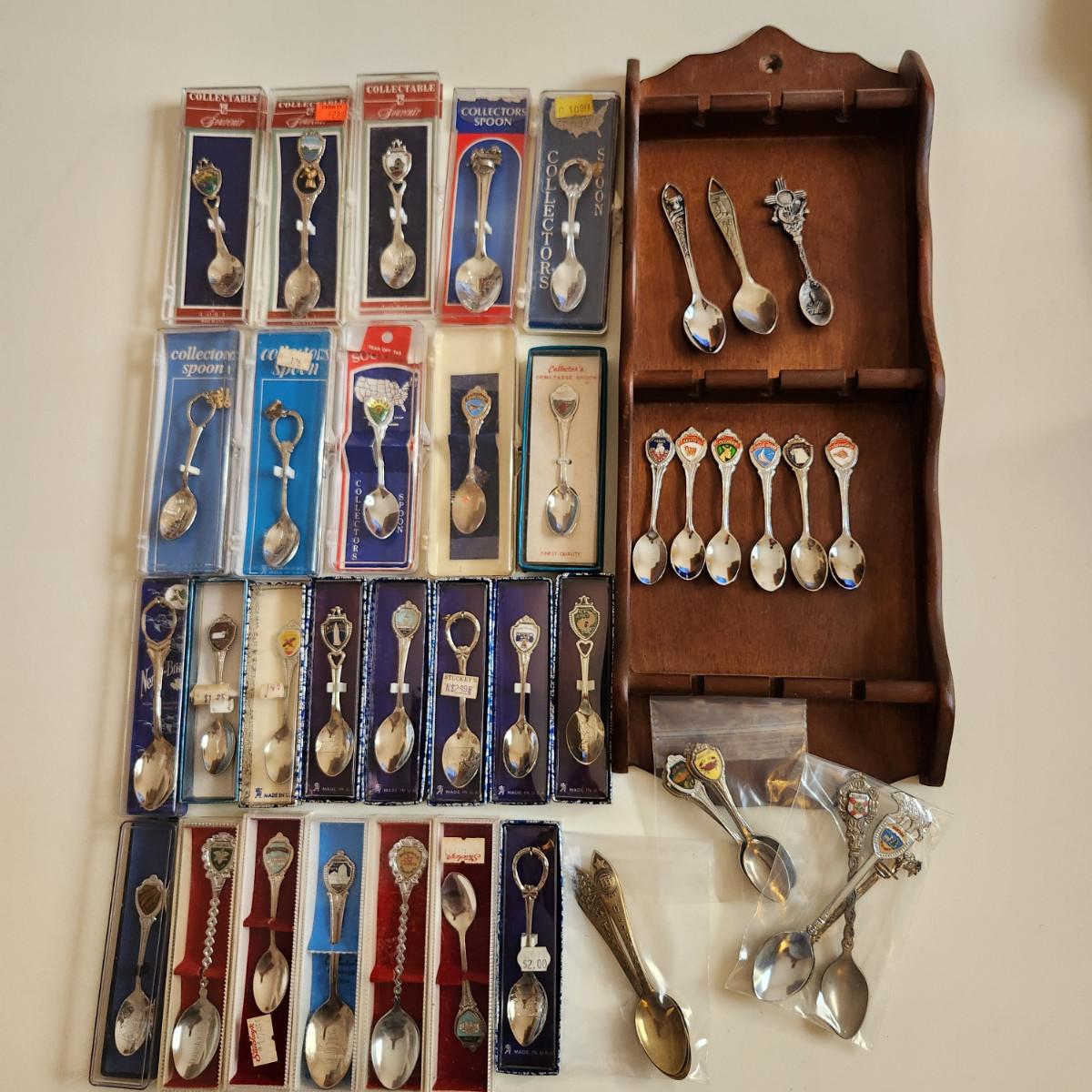 This auction lot is for the Souvenir Spoon Collection with Wood Display. From an estate this is the collection as found. It contains 45 spoons, many still in the box. From travels all over - ready use or resell, bid high and bid often.