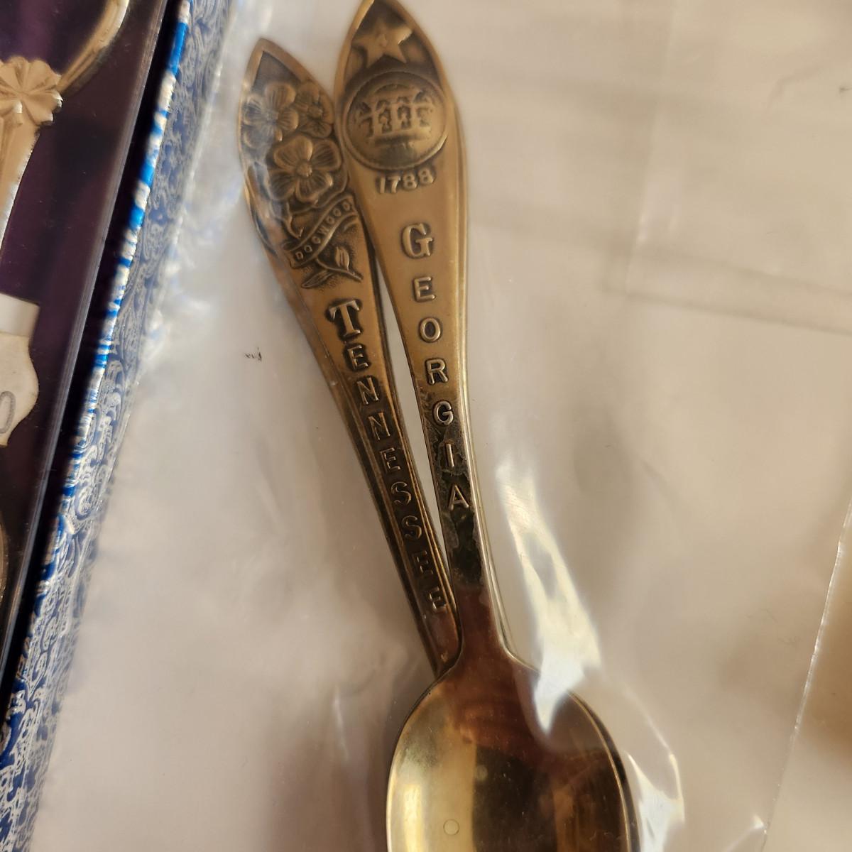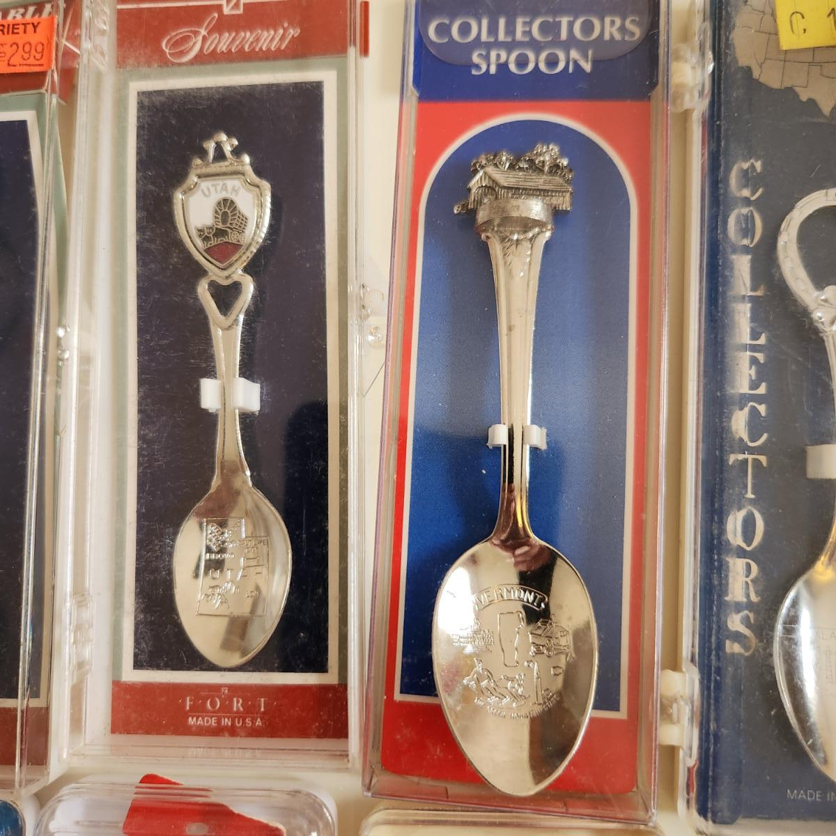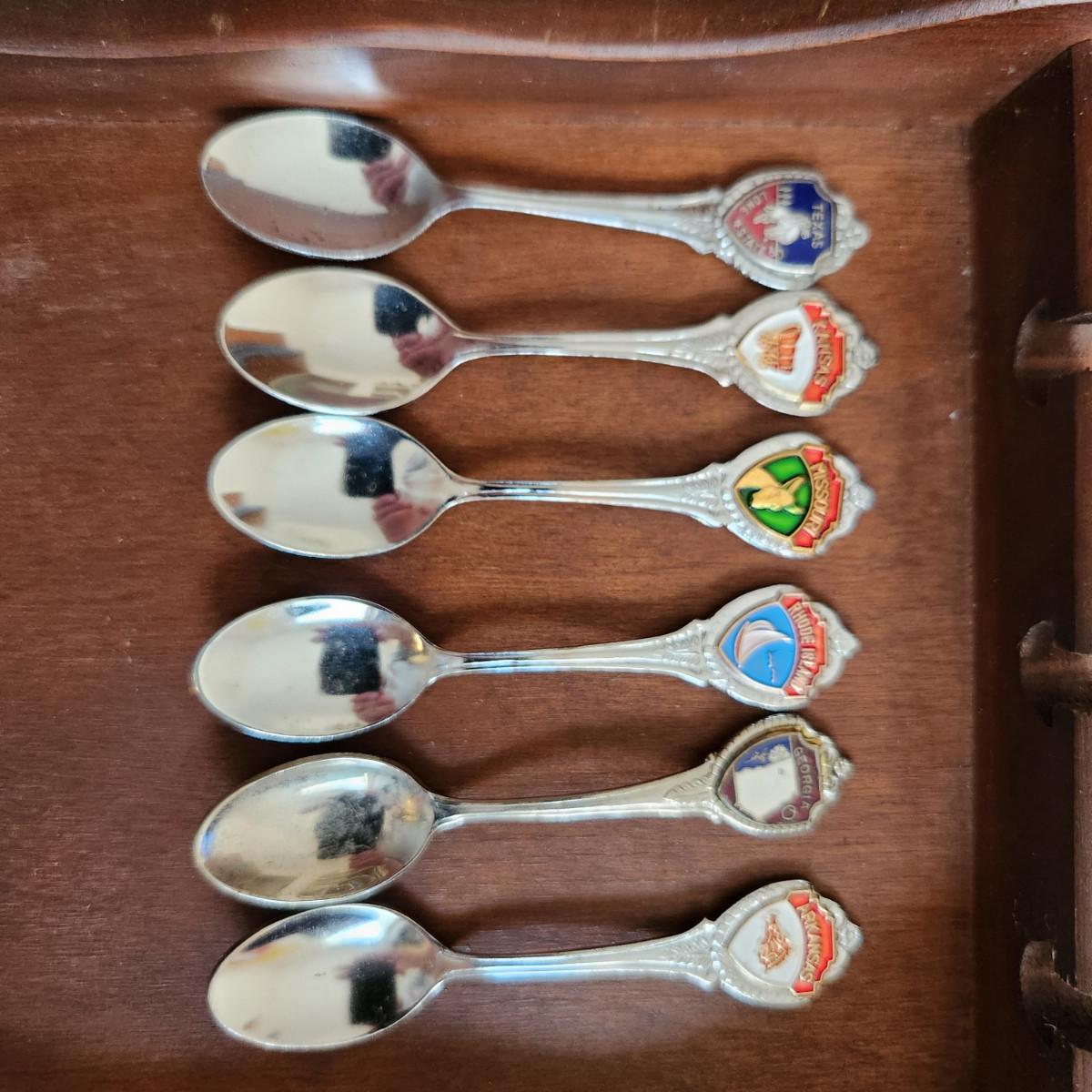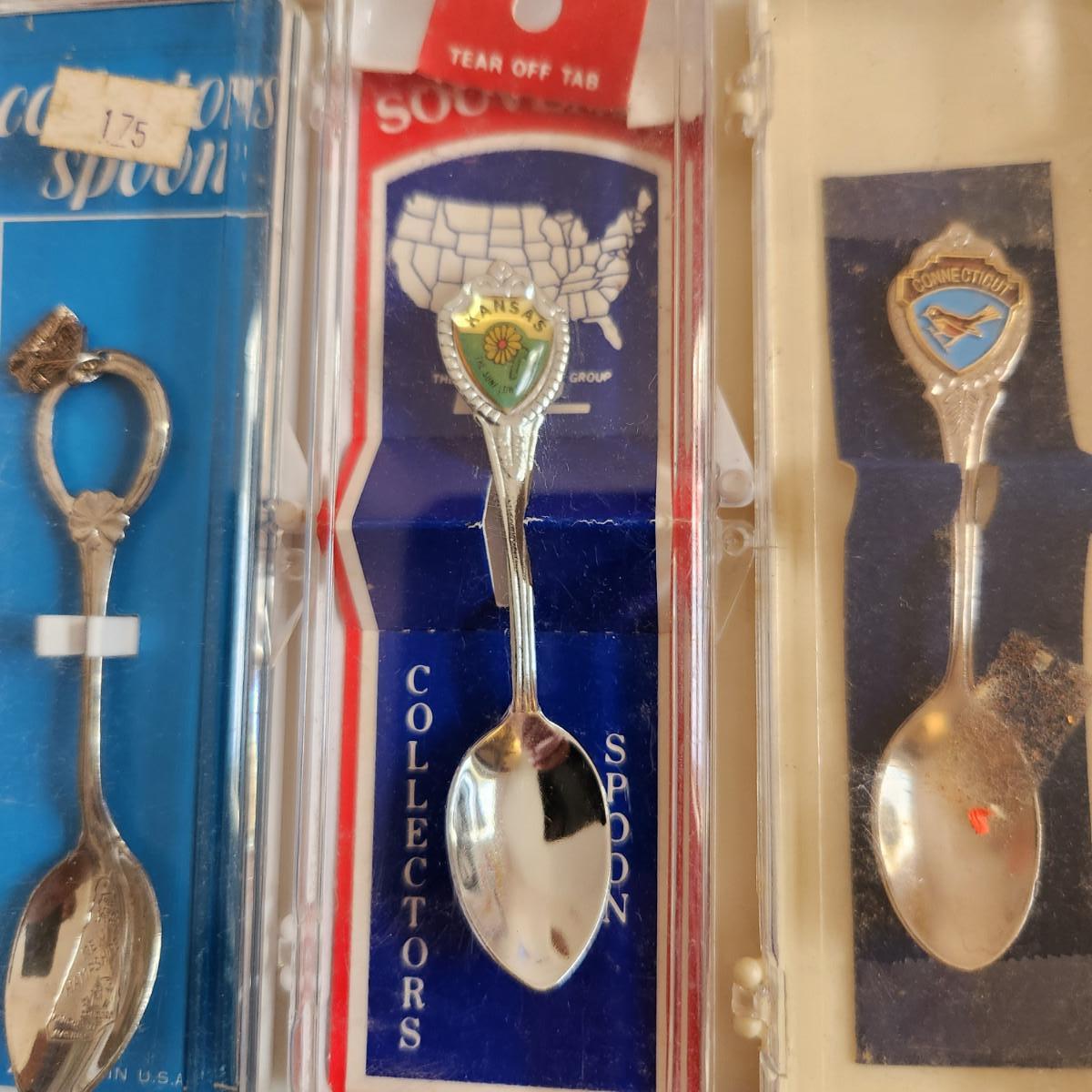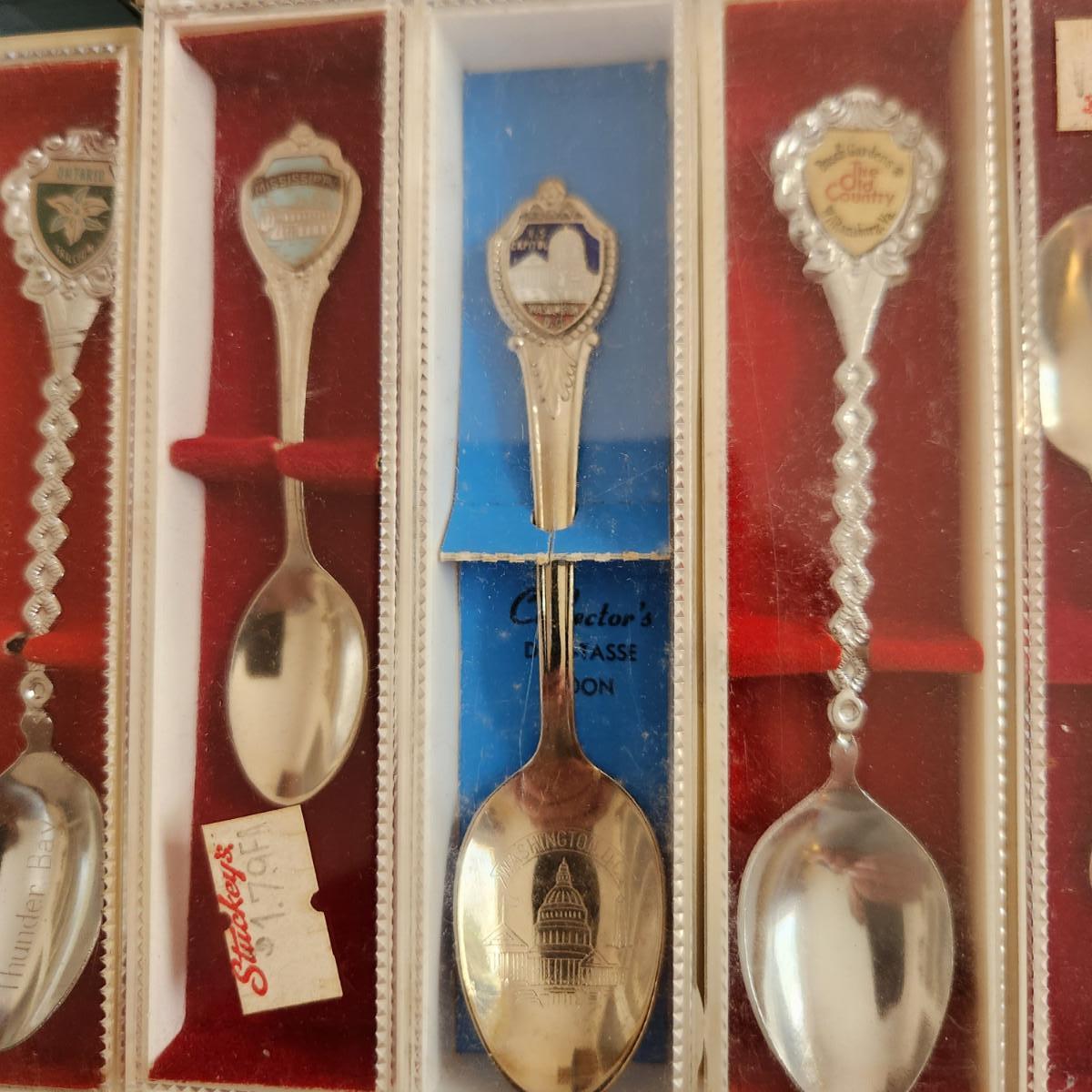 This auction lot is for the Souvenir Spoon Collection with Wood Display. From an estate this is the collection as found. It contains 45 spoons, many still in the box. From travels all over - ready use or resell, bid high and bid often.
