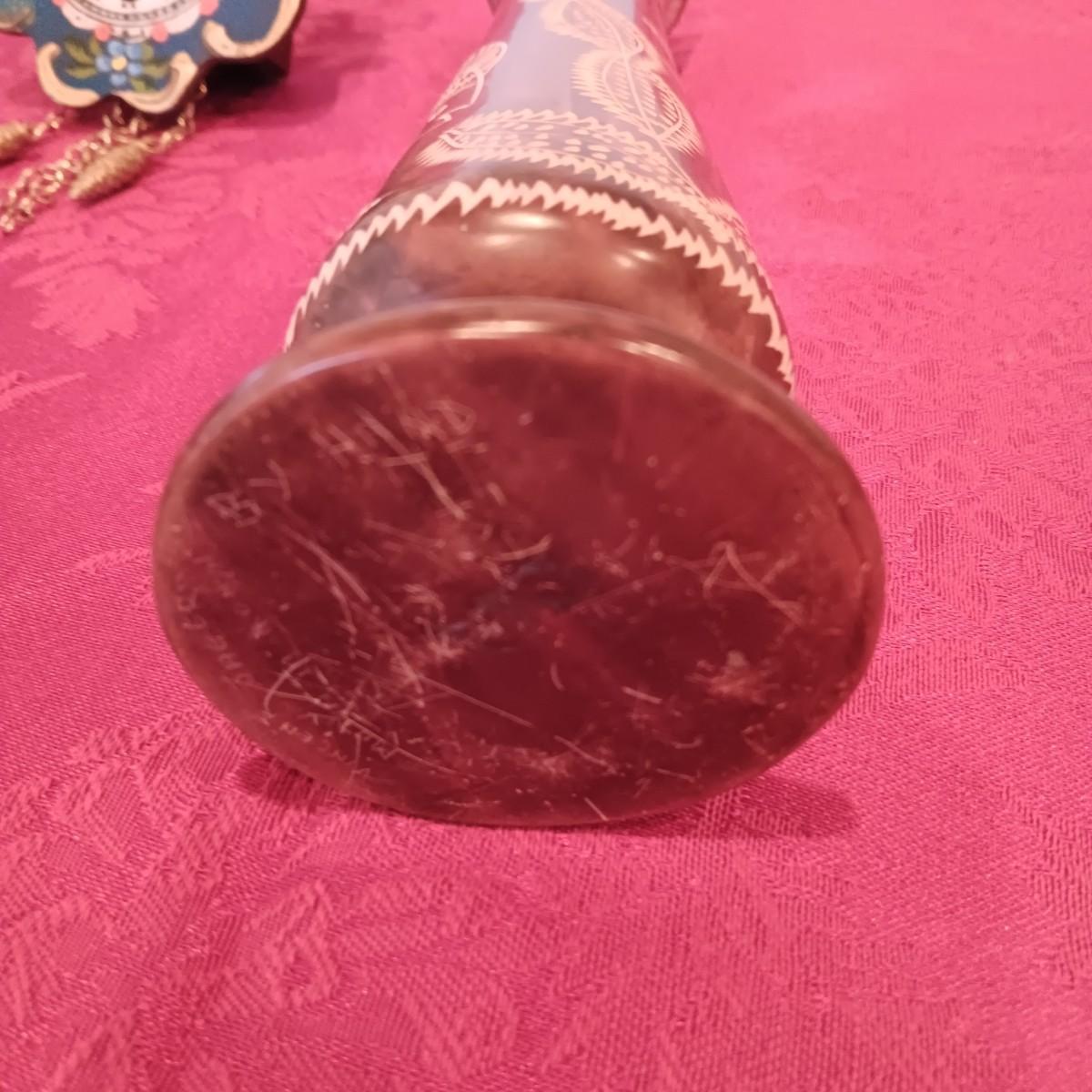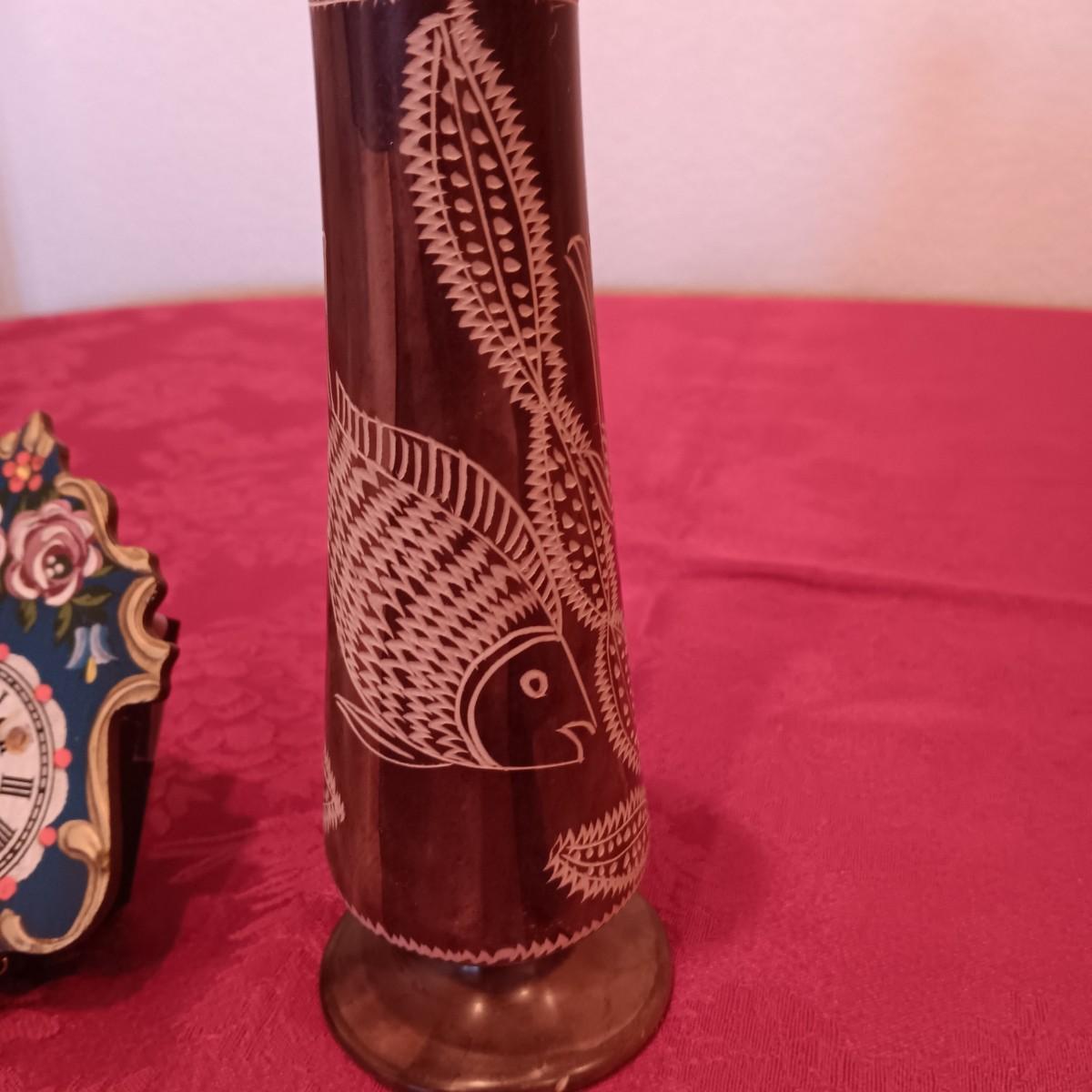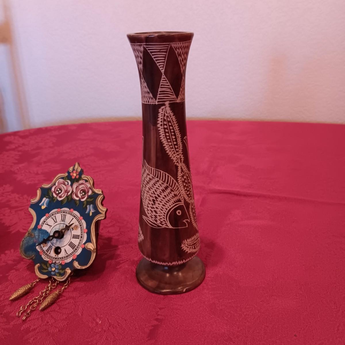SCRIMSHAW BELT BUCKLE, MARBLE ETCHED VASE, SMALL PENDULUM CLOCK, TRINKET BOX, MARBLE MUSHROOM AND MORE