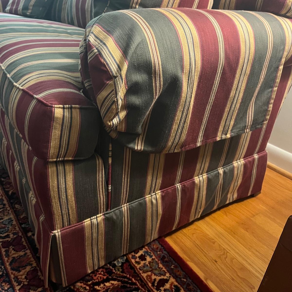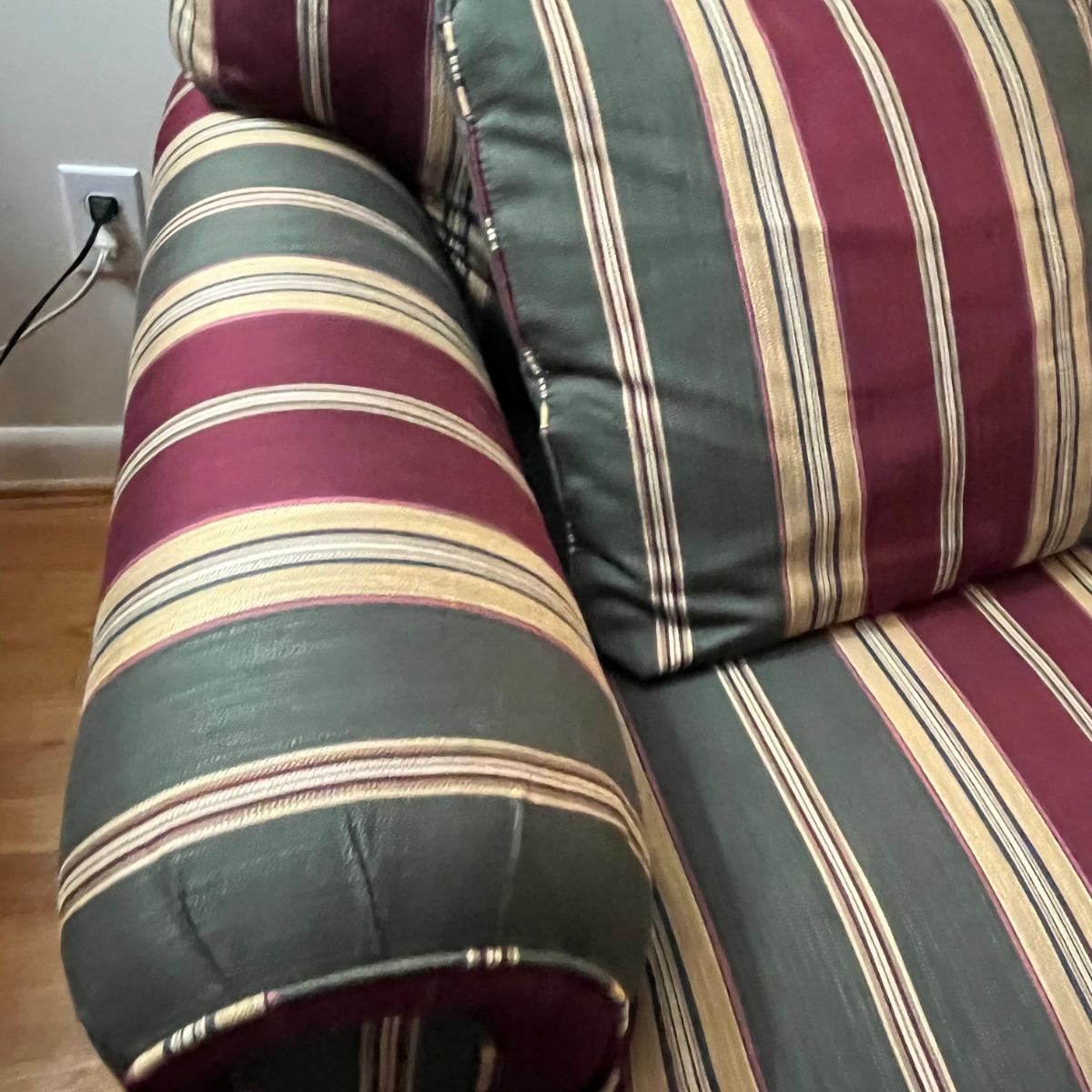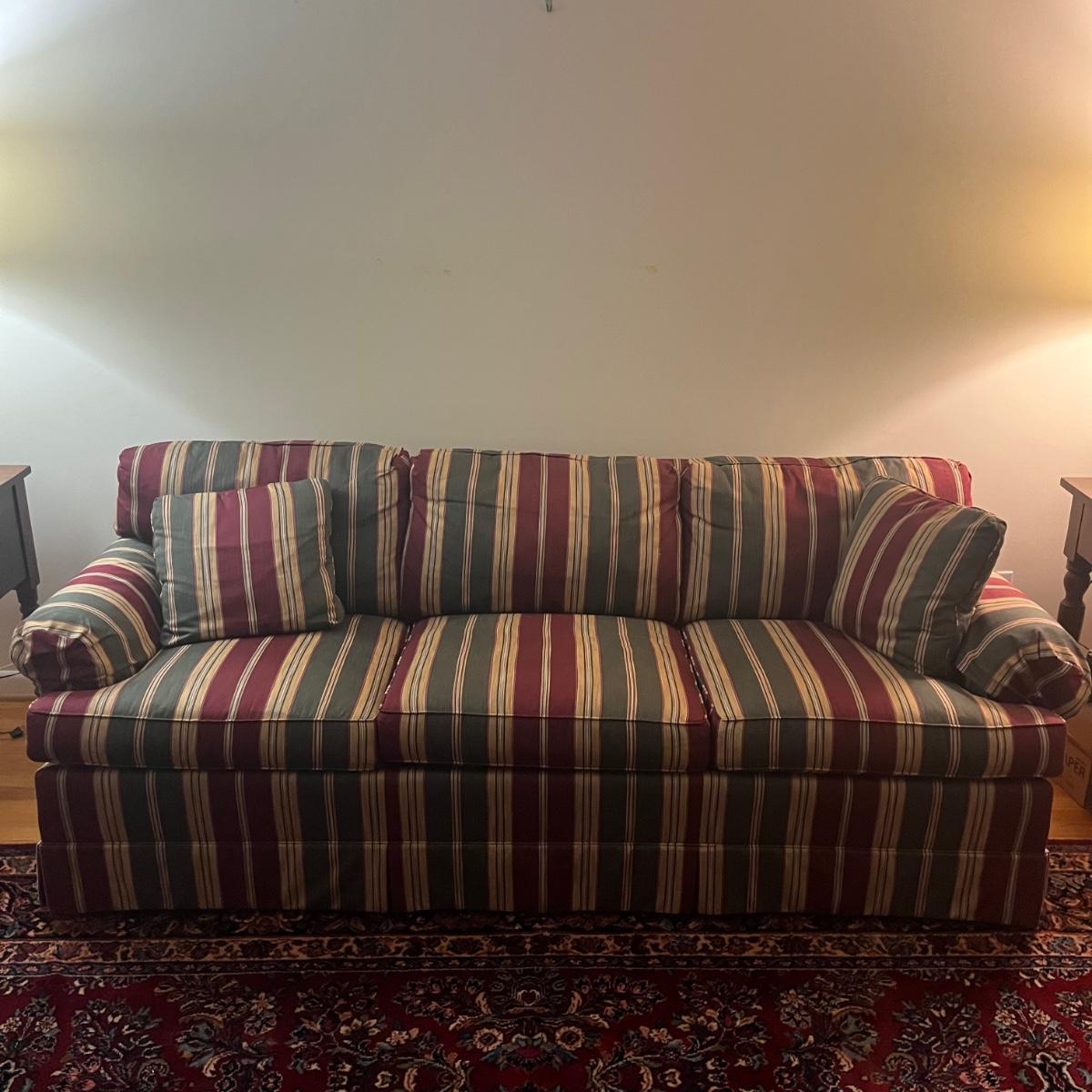 Lot includes a Sovereign Collection couch by Hickory Chair with two matching pillows. Couch is in good condition with Just a few marks on the hidden wooden feet, see image. Couch measures 38” x 86” x 31” with 19” seat height. Winning bidder must bring help to move and load due to weight and size of this item.