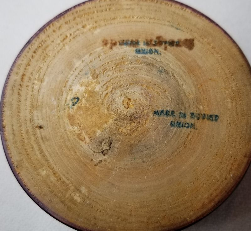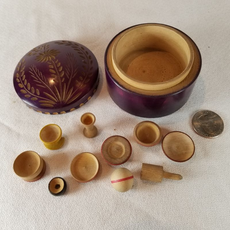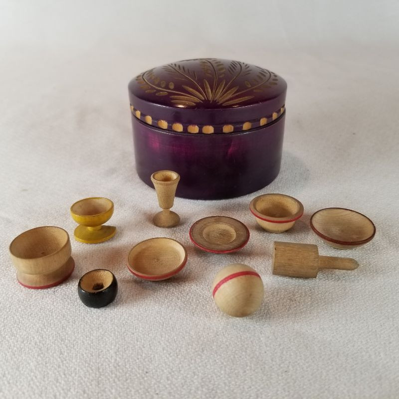 Hand-carved, purple-stained wooden box full of miniature wooden kitchen items. All very nice hand-turned toys. Marked on bottom - Made in Soviet Union and something else we just can't decipher.. All in very good condition.